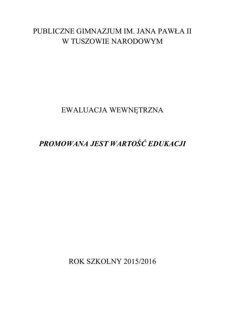 PUBLICZNE GIMNAZJUM IM. JANA PAWŁA II W TUSZOWIE NARODOWYM EWALUACJA WEWNĘTRZNA PROMOWANA JEST WARTOŚĆ EDUKACJI ROK SZKOLNY 2015/2016 WYMAGANIE: Promowana jest wartość edukacji Cele ewaluacji Pozyskanie informacji na temat zainteresowania środowiska pracą szkoły i jej osiągnięciami. Zdobycie informacji na temat wizerunku i oferty szkoły. Odbiorcy ewaluacji Przedmiot ewaluacji rodzice, uczniowie, nauczyciele, dyrektor organ prowadzący, środowisko lokalne. Oferta edukacyjna szkoły, współpraca szkoły z instytucjami i organizacjami w ramach wzbogacenia procesu edukacyjnego, postrzeganie szkoły w środowisku lokalnym. Pytania kluczowe 1. Jakie działania podejmują nauczyciele w celu promowania wartości edukacji i działalności szkoły? 2. W jaki sposób szkoła prezentuje i upowszechnia informacje o ofercie edukacyjnej? 3. W jaki sposób szkoła informuje uczniów, rodziców, środowisko lokalne podejmowanych działaniach? 4. Jakie działania podejmuje szkoła i jakie są ich skutki? Kryteria ewaluacji 1. Różnorodność i atrakcyjność oferty edukacyjnej. 2. Zgodność oferty edukacyjnej z potrzebami uczniów i środowiska. 3. Skuteczność prowadzenia przez szkołę działań promocyjnych. 4. Adekwatność ofert informacyjnych do oczekiwań środowiska. Metody badawcze Analiza dokumentów, ankieta dla nauczyciela, ankieta dla rodzica, ankieta dla ucznia ANALIZA ANKIETY DLA NAUCZYCIELI 1. W jaki sposób motywuje Pan/ Pani swoich uczniów do nauki? 1. W jaki sposób motywuje Pan/ Pani swoich uczniów do nauki? stosuję metody aktywizujące realizuję z uczniami projekty edukacyjne stosuję inne formy lekcji(wystawy, wycieczki,… nagrody stosuję pochwały organizuję spotkania z ciekawymi ludźmi zachęcam uczniów do udziału w konkursach organizuję dodatkowe ciekawe zajęcia organizuję kółka zainteresowań 91% 64% 18% 27% 100% 18% 91% 45% 73% 0% 10% 20% 30% 40% 50% 60% 70% 80% 90% 100% Najczęściej stosowanymi przez nauczycieli sposobami motywowania uczniów do nauki są: pochwały - 100% ankietowanych nauczycieli, stosowanie metod aktywizujących - 91% -zachęcanie do udziału w konkursach -91%, -organizowanie kół zainteresowań- 73%, realizacja projektów - 64%. 2. Jakie działania podejmuje Pan/Pani w celu promowania uczenia się jako wartości na całe życie? 2. Jakie działania podejmuje Pan/Pani w celu promowania uczenia się jako udział uczniów w kulturze (teatr, koncerty, itp.) stosowanie wiedzy w praktyce rozmowy na temat życia, twórczości i osiągnięć… wskazywanie znanych osób, które dzięki… prezentowanie umiejętności na forum klasy rozwijanie zainteresowań uczniów wdrażanie uczniów do samodzielnego… wzmacnianie mocnych stron ucznia ukazywanie jaką wartością jest nauka wzmacnianie poczucia własnej wartości 36% 91% 36% 36% 45% 73% 73% 64% 82% 82% 0% 10% 20% 30% 40% 50% 60% 70% 80% 90% 100% Nauczyciele wymienili następujące sposoby: - stosowanie wiedzy w praktyce - 91%, - wzmacnianie poczucia własnej wartości -82%, - ukazywanie jaką wartością jest nauka - 82%, - rozwijanie zainteresowań uczniów - 73%, - wdrażanie uczniów do samodzielnego uczenia się - 73%, - wzmacnianie mocnych stron ucznia - 64%, - prezentowanie umiejętności na forum klasy - 45%, - rozmowy na temat życia, twórczości i osiągnięć wielkich Polaków -36%, - wskazywanie znanych osób, które dzięki wytrwałej pracy i nauce osiągnęły sukces -36%, - udział uczniów w kulturze (teatr, koncerty, itp.) - 36%. 3. Czy szkoła prezentuje i upowszechnia informacje o podejmowanych działaniach i osiągnięciach? 100% nauczycieli udzieliło odpowiedzi TAK. 4. W jaki sposób szkoła prezentuje swoje osiągnięcia? 4. W jaki sposób szkoła prezentuje swoje osiągnięcia? stypendia listy gratulacyjne dla rodziców wystawa prac uczniów wystawa dyplomów nagrody za osiągnięcia ustne pochwały gablota z pucharami tablice informacyjne artykuły w prasie lokalnej strona internetowa szkoły 0% 20% 40% 60% 80% 100% 120% 5. Z jakimi instytucjami, placówkami i organizacjami pracuje szkoła? 5. Z jakimi instytucjami, placówkami i organizacjami pracuje szkoła? WOSiR GOPS Policja PPP Towarzystwo Sikorskiego Urząd Gminy Tuszowska Ścieżka Straż Pożarna Gminna Biblioteka 0% 10% 20% 30% 40% 50% 60% 70% 80% ANALIZA ANKIET DLA UCZNIÓW I RODZICÓW 1.Czy jesteś dobrze poinformowany o sprawach dotyczących szkoły? 1.Czy jesteś dobrze poinformowany o sprawach dotyczących szkoły? 60% 50% 40% Uczeń 30% Rodzic 20% 10% 0% Tak Raczej tak Raczej nie Nie Uczniowie i ich rodzice są dobrze poinformowani o sprawach dotyczących szkoły. Odpowiedzi twierdzących udzieliło 79% uczniów i 88% rodziców. 2. Czy jesteś zapoznawany na bieżąco z efektami pracy szkoły? 2. Czy jesteś zapoznawany na bieżąco z efektami pracy szkoły? 70% 60% 50% 40% Uczeń 30% Rodzic 20% 10% 0% Tak Raczej tak Raczej nie Nie Uczniowie i ich rodzice są na bieżąco zapoznawani z efektami pracy szkoły. Odpowiedzi twierdzących udzieliło 90% uczniów i 94% rodziców. 3. Przez kogo jesteś zapoznawany z efektami pracy szkoły? 3. Przez kogo jesteś zapoznawany z efektami pracy szkoły? 45 40 35 30 25 20 15 10 5 0 Uczeń Rodzic Uczniowie oraz ich rodzice jako źródło informacji o efektach pracy szkoły najczęściej podają wychowawcę, nauczycieli i w następnej kolejności dyrektora szkoły. 4. Czy zaglądasz na stronę internetową szkoły? 4. Czy zaglądasz na stronę internetową szkoły? 17% 27% Tak Raczej tak Raczej nie 25% Nie 31% 4. Czy zagląda Pan/Pani na stronę internetową szkoły? 20% 24% Tak Raczej tak Raczej nie 24% Nie 32% Odpowiedzi udzielone przez uczniów i ich rodziców są zbliżone. Ponad połowa z nich zagląda na internetową stronę szkoły. 5. Z jakich źródeł najczęściej korzystasz na stronie? 5. Z jakich źródeł najczęściej korzystasz na stronie? 30 25 20 15 10 Uczeń 5 Rodzic 0 Uczniowie najczęściej oglądają galerię zdjęć (26%). Natomias