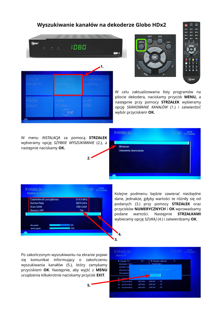 Wyszukiwanie kanałów na dekoderze Globo HDx2 1. W celu zaktualizowania listy programów na pilocie dekodera, naciskamy przycisk MENU, a następnie przy pomocy STRZAŁEK wybieramy opcję SKANOWANIE KANAŁÓW (1.) i zatwierdzić wybór przyciskiem OK. W menu INSTALACJA za pomocą STRZAŁEK wybieramy opcję SZYBKIE WYSZUKIWANIE (2.), a następnie naciskamy OK. 2. Kolejne podmenu będzie zawierać niezbędne dane, jednakże, gdyby wartości te różniły się od podanych (3.) przy pomocy STRZAŁEK oraz przycisków NUMERYCZNYCH i OK wprowadzamy podane wartości. Następnie STRZAŁKAMI wybieramy opcję SZUKA J (4.) i zatwierdzamy OK. 4. 3. Po zakończonym wyszukiwaniu na ekranie pojawi się komunikat informujący o zakończeniu wyszukiwania kanałów (5.), który zamykamy przyciskiem OK. Następnie, aby wyjść z MENU urządzenia kilkakrotnie naciskamy przycisk EXIT. 5.
