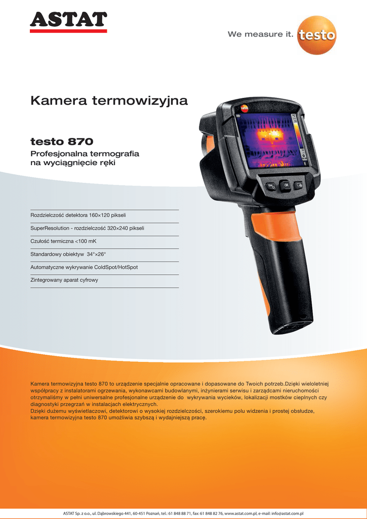 We measure it. Kamera termowizyjna testo 870 Profesjonalna termografia na wyciągnięcie ręki Rozdzielczość detektora 160×120 pikseli SuperResolution - rozdzielczość 320×240 pikseli Czułość termiczna <100 mK Standardowy obiektyw 34°×26° Automatyczne wykrywanie ColdSpot/HotSpot Zintegrowany aparat cyfrowy Kamera termowizyjna testo 870 to urządzenie specjalnie opracowane i dopasowane do Twoich potrzeb.Dzięki wieloletniej współpracy z instalatorami ogrzewania, wykonawcami budowlanymi, inżynierami serwisu i zarządcami nieruchomości otrzymaliśmy w pełni uniwersalne profesjonalne urządzenie do wykrywania wycieków, lokalizacji mostków cieplnych czy diagnostyki przegrzań w instalacjach elektrycznych. Dzięki dużemu wyświetlaczowi, detektorowi o wysokiej rozdzielczości, szerokiemu polu widzenia i prostej obsłudze, kamera termowizyjna testo 870 umożliwia szybszą i wydajniejszą pracę. www.testo.com.pl ASTAT Sp. z o.o., ul. Dąbrowskiego 441, 60-451 Poznań, tel.: 61 848 88 71, fax: 61 848 82 76, www.astat.com.pl, e-mail: [email protected] testo 870 We measure it. Dane zamówieniowe testo 870-1 testo 870-2 Kamera termowizyjna testo 870-1 w zestawie z profesjonalnym oprogramowaniem, kablem USB, zasilaczem i akumulatorem litowo-jonowym Kamera termowizyjna testo 870-2 w solidnej walizce wraz z profesjonalnym oprogramowaniem, kablem USB, zasilaczem i akumulatorem litowo-jonowym Nr kat. 0560 8701 Nr kat. 0560 8702 Przegląd wariantów Cechy testo 870-1 Detektor testo 870-2 160×120 pixels Czułość termiczna (NETD) <100 mK przy +30 °C Zakres pomiarowy -20 do +280 °C Częstotliwość odświeżania obrazu 9 Hz Obiektyw 34°×26° SuperResolution ( ) Dodatkowy akumulator ( ) Szybka ładowarka do akumulatora ( ) Zintegrowany aparat cyfrowy – Auto Hot/ColdSpot Solidna walizka transportowa objęte dostawą ( ( ) opcja ) – niedostępne Akcesoria Nr kat. SuperResolution. Czterokrotnie wyższa rozdzielczość dla jeszcze dokładniejszej analizy obrazów termicznych 0554 7806 Solidna walizka transportowa 0516 8700 Dodatkowy akumulator. Dodatkowy akumulator litowo-jonowy do dłuższego czasu pracy. 0515 0100 Szybka ładowarka do akumulatora. Stacja ładująca z portami dla dwóch akumulatorów do optymalizacji czasu ładowania. 0554 1103 Taśma samoprzylepna o określonej emisyjności. Taśma samoprzylepna m.in. do błyszczących powierzchni (10 mx25 mm), ε = 0.95, odporna na temperaturę do +250°C 0554 0051 Certyfikat kalibracji ISO; Punkty kalibracji 0°C, +25°C, +50°C 0520 0489 Certyfikat kalibracji ISO; Punkty kalibracji 0°C, +100°C, +200°C 0520 0490 Certyfikat kalibracji ISO; Dowolnie punkty kalibracji w zakresie od -18 do +250°C 0520 0495 ASTAT Sp. z o.o., ul. Dąbrowskiego 441, 60-451 Poznań, tel.: 61 848 88 71, fax: 61 848 82 76, www.astat.com.pl, e-mail: [email protected] testo 870 We measure it. Dane techniczne testo 870-1 testo 870-2 testo 870-1 Obraz termowizyjny Format pliku 160×120 pikseli Rodzaj detektora Czułość termiczna (NETD) <100 mK przy +30 °C Pole widzenia/minimalna odległość ogniskowania 3.68 mrad SuperResolution (piksel/IFOV) - opcja 320×240 pikseli / 2.3 mrad Częstotliwość odświeżania obrazu 9 Hz Zasilanie Akumulator litowo-jonowy Czas działania Opcje ładowania 4 godziny W kamerze lub opcjonalnie w ładowarce Zasilanie z sieci Warunki otoczenia Dane obrazu – 3,1 MP / 0,5 m Prezentacja obrazu Wyświetlacz Pamięć wewnętrzna (1,6 GB / >2000 obrazów) Rodzaj akumulatora 7.5 do 14 µm Zakres spektralny .bmt i .jpg; opcje eksportu do .bmp, .jpg, .png, .csv, .xls Moduł pamięci 34° × 26° / <0,5 m Rozdzielczość geometryczna (IFOV) Pole widzenia/minimalna odległość ogniskowania Opcje wyświetlacza Obraz w podczerwieni Palety 4 (żelazo, tęcza, zimny-ciepły, szary) Temperatura pracy -15 do +50 °C Temperatura przechowywania -30 do +60 °C Wilgotność powietrza 3,5" LCD 320×240 pikseli Obraz w podczerwieni /obraz rzeczywisty 20 do 80 %RH bez kondensacji Klasa ochrony obudowy (IEC 60529) IP54 Wibracje (IEC 60068-2-6) 2G Dane fizyczne Pomiar Waga Zakres pomiarowy Dokładność testo 870-2 Rejestracja obrazów -20 do +280 °C 550 g Wymiary 219×96×95 mm Obudowa PC - ABS ±2 °C, ±2 % mierzonej wartości Ustawianie emisyjności 0,01 to 1 Oprogramowanie Funkcje pomiaru Funkcje analizy Wymogi systemowe Pomiar punktu centralnego, Hot/ColdSpot Standardy, testy, gwarancja Wyposażenie kamery Aparat cyfrowy Obiektyw standardowy Windows XP (Service Pack 3), Windows Vista, Windows 7, Windows 8 Interface: USB 2.0 Dyrektywa EU – Gwarancja 34°×26° Zapis JPEG 2004 / 108 / EG 2 lata Standard Tryb pełnoekranowy ( ) Opcja – Niedostępna ASTAT Sp. z o.o., ul. Dąbrowskiego 441, 60-451 Poznań, tel.: 61 848 88 71, fax: 61 848 82 76, www.astat.com.pl, e-mail: [email protected] testo 870 We measure it. Detektor Czułość termiczna (NETD) Zakres temperatury Częstotliwość odświeżania obrazu Obiektyw 32°×23° Wymienny teleobiektyw 9°×7° SuperResolution < 80 mK -20 °C do +280 °C 9 Hz testo 875-1i testo 875-2 zestaw testo 875-2i 160×120 pikseli < 50 mK -30 °C do +350 °C 33 Hz* – – () () () () () Pomiar wysokiej temperatury do 550 °C – – () () Zintegrowany aparat cyfrowy – Zintegrowane diody LED – – – – – – – Nagrywanie notatek głosowych za pomocą zestawu słuchawkowego Laser** Wyświetlanie wilgotności powierzchni (po ręcznym wprowadzeniu temperatury i wilgotności otoczenia do kamery) Pomiar wilgotności z bezprzewodową sondą wilgotności*** (automatyczny transfer wartości pomiaru w czasie rzeczywistym) Izotermy – – – () () – – Szkło ochronne na obiektyw () () () Dodatkowy akumulator () () () Szybka ładowarka () () () Min./Max. temperatury dla wybranego obszaru Automatyczne wykrywanie najcieplejszego i najzimniejszego punktu Tryb solarny objęte dostawą () opcjonalne Kamery termowizyjne testo 875 oraz 875i Kamera termowizyjna testo 875-1 Dostarczana w solidnej walizce wraz z 