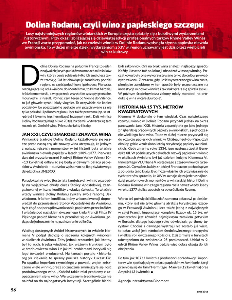 Dolina Rodanu, czyli wino z papieskiego szczepu Losy najsłynniejszych regionów winiarskich w Europie często splatały się z burzliwymi wydarzeniami historycznymi. Przy okazji zbliżającej się dziewiątej edycji profesjonalnych targów Rhône Valley Wines we Francji warto przypomnieć, jak na rozkwit winnic w Dolinie Rodanu wpłynęła słynna papieska niewola awiniońska. To w dużej mierze dzięki wydarzeniom z XIV w. region uznawany jest dziś przez wielbicieli win za kultowy. D olina Dolina Rodanu na południu Francji to jeden z najważniejszych punktów na mapach miłośników win, którzy cenią sobie nie tylko ich smak, lecz także tradycję. Od lat obowiązuje zasadniczy podział regionu na część południową i północną. Pierwsza, rozciągająca się od Awinionu do Montélimar, to klimat bardziej śródziemnomorski, a więc przede wszystkim szczepy grenache, mourvedre i cinsault. Północ, czyli teren od Vienne do Valence, to już głównie syrah i biały viognier. To oczywiście nie koniec podziałów, bo poszczególne apelacje win przypisywane są nie tylko południu i północy regionu, lecz także prawemu (np. saint-péray) i lewemu (np. hermitage) brzegowi rzeki. Dziś winnice Doliny Rodanu zajmują blisko 70 tys. ha ziemi i wytwarza się tam rocznie ok. 3 mln hl wina. Tyle suche fakty i liczby. JAN XXII, CZYLI SMAKOSZ I ZNAWCA WINA Winiarskie tradycje Doliny Rodanu kształtowały się jeszcze przed naszą erą, ale znawcy wina utrzymują, że jednym z najważniejszych momentów w jej historii była właśnie awiniońska niewola papieży w latach 1309–1377. Pierwsze dwa dni przyszłorocznej 9. edycji Rhône Valley Wines (10– –13 kwietnia) odbywać się będą w dawnym pałacu papieskim w Awinionie – budynku wpisanym na listę światowego dziedzictwa UNESCO. Paradoksalnie więc tłuste lata tamtejszych winnic przypadły na wyjątkowo chudy okres Stolicy Apostolskiej, zaangażowanej w liczne konflikty z władzą świecką. To właśnie wtedy winnice Doliny Rodanu zyskały swoją renomę. Jak wiadomo, źródłem konfliktu, który w konsekwencji doprowadził do przeniesienia Stolicy Apostolskiej do Awinionu, była chęć podporządkowania sobie papiestwa przez królów. I właśnie pod naciskiem ówczesnego króla Francji Filipa IV Pięknego papież Klemens V przeniósł się do Awinionu, godząc się jednocześnie na uzależnienie od króla. Według dostępnych źródeł historycznych to właśnie Klemens V podjął decyzję o sadzeniu kolejnych winorośli w okolicach Awinionu. Żeby jednak zrozumieć, jak istotny był to ruch, trzeba wiedzieć, jak ważnym trunkiem było w średniowieczu wino i z jakimi problemami borykali się jego ówcześni producenci. Na łamach portalu <historia. org.pl> ciekawie te sprawy porusza historyk Łukasz Fik. Po upadku imperium rzymskiego z powodu wojen zniszczono wiele winnic, przez co znacznie zmniejszyła się ilość produkowanego wina. „Kościół także miał problemy z zaopatrzeniem się w wino. We wczesnym średniowieczu nie należał on do najbogatszych instytucji. Szczególnie biedni 56 byli zakonnicy. Oni na brak wina znaleźli najlepszy sposób. Każdy klasztor tuż po lokacji obsadzał własną winnicę. Początkowo były one wykorzystywane tylko do celów prywatnych zakonu. Z czasem, gdy ilość wytwarzanego wina rosła, pieniądze zarobione w ten sposób były przeznaczane na inwestycje w nowe winnice i tak nakręcała się spirala zysku. W późnym średniowieczu zakony miały monopol na produkcję wina w całej Europie”. HISTORIA NA 15 TYS. METRÓW KWADRATOWYCH Klemens V doskonale o tym wiedział. Czas największego rozwoju winnic w Dolinie Rodanu przypadł jednak na okres panowania Jana XXII. Historia zapamiętała go jako jednego z najbardziej pracowitych papieży awiniońskich, a jednocześnie wielkiego fana wina. To on w dużej mierze przyczynił się do rozwoju papieskich winnic w Châteauneuf-du-Pape, czyli okolicy, gdzie wzniesiono letnią rezydencję papieży awiniońskich. Kiedy zmarł w roku 1334, jego następcą został Benedykt XII. W późniejszych dekadach rozwój papieskich winnic w okolicach Awinionu był już dziełem kolejno Klemensa VI, Innocentego VI, Urbana V i ostatniego z czasów niewoli Grzegorza XI. Co ważne, każdy z nich był Francuzem pochodzącym z południa tego kraju. Być może właśnie ich przywiązanie do tych terenów sprawiło, że XIV w. uznaje się za jeden z najbardziej przełomowych momentów w winiarskiej historii Doliny Rodanu. Renoma win z tego regionu rosła nawet wtedy, kiedy w roku 1377 stolica apostolska powróciła do Rzymu. Warto też poświęcić kilka zdań samemu pałacowi papieskiemu, który jest nie tylko główną atrakcją turystyczną leżącego w Prowansji Awinionu, lecz także jedną z największych w całej Francji. Imponujący kompleks liczący ok. 15 tys. m2 powierzchni jest również największym zamkiem gotyckim w Europie, dlatego każdego roku odwiedzają go tłumy turystów. Chociaż z dawnego wystroju nie zostało już wiele, to pałac wciąż jest symbolem średniowiecznego przepychu i wielkiej roli ówczesnego Kościoła. Dziś z myślą o turystach udostępniono do zwiedzania 25 pomieszczeń. Udział w 9. edycji Rhône Valley Wines będzie więc dobrą okazją do ich obejrzenia. Po tym, jak 10 i 11 kwietnia producenci, sprzedawcy i importerzy win spotkają się w pałacu papieskim w Awinionie, targi przeniosą się do Tain l’Hermitage i Mauves (12 kwietnia) oraz Ampuis (13 kwietnia). ■ Agencja Interaktywna Bloomnet zima 2016