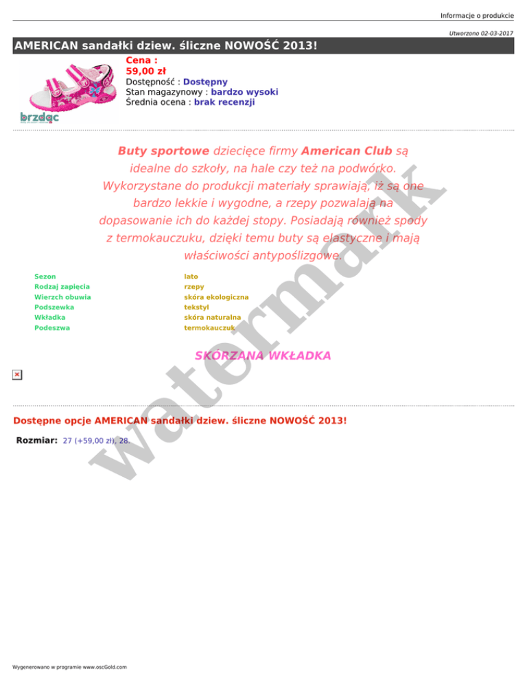 Informacje o produkcie Utworzono 02-03-2017 AMERICAN sandałki dziew. śliczne NOWOŚĆ 2013! Cena : 59,00 zł Dostępność : Dostępny Stan magazynowy : bardzo wysoki Średnia ocena : brak recenzji Buty sportowe dziecięce firmy American Club są idealne do szkoły, na hale czy też na podwórko. er m ar k Wykorzystane do produkcji materiały sprawiają, iż są one bardzo lekkie i wygodne, a rzepy pozwalają na dopasowanie ich do każdej stopy. Posiadają również spody z termokauczuku, dzięki temu buty są elastyczne i mają właściwości antypoślizgowe. Sezon lato Rodzaj zapięcia Wierzch obuwia Podszewka rzepy skóra ekologiczna tekstyl Wkładka skóra naturalna Podeszwa termokauczuk at SKÓRZANA WKŁADKA Dostępne opcje AMERICAN sandałki dziew. śliczne NOWOŚĆ 2013! w Rozmiar: 27 (+59,00 zł), 28. Wygenerowano w programie www.oscGold.com