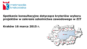 Spotkanie konsultacyjne dotyczące kryteriów wyboru projektów w zakresie szkolnictwa zawodowego w ZIT Kraków 16 marca 2015 r. Podsumowanie dotychczasowych prac nad Strategią ZIT w obszarze szkolnictwa zawodowego. 2. Przedstawienie zapisów SZOOP oraz Wytycznych MIiR. 3. Omówienie zapisów Strategii ZIT w powiązaniu z zaproponowanymi kierunkowymi zasadami wyboru projektów. 4. Dyskusja. 1. Stowarzyszenie tworzy zinstytucjonalizowaną płaszczyznę współpracy dla 15 gmin. Stowarzyszenie pełni funkcję Związku ZIT. Dzięki zawiązaniu partnerstwa, Kraków i gminy powiązane z nim funkcjonalnie mogą realizować wspólne przedsięwzięcia, łącząc działania finansowane z Europejskiego Funduszu Rozwoju Regionalnego i Europejskiego Funduszu Społecznego. RPO WM 2014-2020 Strategia ZIT Gmina Miejska Kraków Gminy tworzące Krakowski Obszar Funkcjonalny Stowarzyszenie Metropolia Krakowska pełni funkcję Związku ZIT Regionalny Program Operacyjny Województwa Małopolskiego na lata 2014-2020 – 2,8 mld euro Strategia ZIT – 0,236 mld euro Stowarzyszenie pełni rolę Instytucji Pośredniczącej odpowiada za przedstawienie Samorządowi Województwa Małopolskiego listy projektów: • Zidentyfikowanych w strategii ZIT – tryb pozakonkursowy • Wyłonionych w ramach prowadzonych konkursów – tryb konkursowy Transport niskoemisyjny – 80 mln euro Gospodarka wodno-ściekowa – 5 mln euro Gospodarka odpadami – 5 mln euro Wymiana kotłów – 50 mln euro Kompleksowa termomodernizacja budynków użyteczności publicznej – 22 mln euro Drogi lokalne – 10,06 mln euro Strategia ZIT 236,06 mln euro Pomoc społeczna – 14 mln euro Kształcenie zawodowe – 15 mln euro Strefy aktywności gospodarczej – 25 mln euro Infrastruktura ochrony zdrowia – 5 mln euro Wychowanie przedszkolne – 5 mln euro Projekty realizujące strategię ZIT Tryb pozakonkursowy – projekt zidentyfikowany w strategii ZIT, wpisany na listę projektów strategicznych (dot. projektów EFRR) Wszystkie projekty muszą być zgodne z kryteriami oceny formalnej i merytorycznej wyznaczonymi przez RPO WM Rola Stowarzyszenia Metropolia Krakowska (związek ZIT) polega na wskazaniu Samorządowi Województwa projektów które realizują strategię ZIT – związek ZIT dokonuje oceny strategicznej IOK (Małopolskie Centrum Przedsiębiorczości) ogłasza konkursy ograniczone terytorialnie do obszaru ZIT IOK dokonuje oceny formalnej i merytorycznej oraz przekazuje Związkowi ZIT listę projektów Kryteria oceny ZIT Związek ZIT dokonuje oceny strategicznej obejmującej weryfikację zgodności projektów ze Strategią ZIT oraz przedstawia IZ RPO WM listę projektów do dofinasowania Maj 2014 r. – spotkania i konsultacje robocze prowadzone przez UMK, ustalenie kryteriów wyboru projektów. Lipiec/sierpień – uwagi do UMWM i SW do strategii ZIT: - konieczność konkursowego wyboru projektów - Konieczność dopracowania kryteriów wyboru projektów Konsultacje prowadzone przez SMK - Wrzesień 2014 r. spotkanie przedstawicieli organów prowadzących z dyr. Departamentu Edukacji UMWM - Spotkania i konsultacje dot. możliwości realizacji zadań z zakresu edukacji zawodowej na terenie ZIT – postęp prac warunkowany przyjęciem dokumentów programowych Zakończenie prac nad RPO WM – 18 grudnia 2014 r. Publikacja projektu SZOOP – 10 marca 2015 r. Do 31 marca br. stowarzyszenie musi przedstawić projekt strategii ZIT do zaopiniowania przez Samorząd Województwa oraz Ministerstwo Infrastruktury i Rozwoju Projekt strategii ZIT musi zawierać propozycje kryteriów wyboru projektów konkursowych Po zatwierdzeniu SZOOP (kwiecień 2015 r.) SW przystąpi do opracowania kryteriów wyboru projektów. Kryteria będą podlegały procedurze szerokich konsultacji społecznych Ostateczne kryteria wyboru projektów w ramach ZIT, będą uzupełniały kryteria ustalone przez Samorząd Województwa. Planowany termin pierwszych naborów wniosków IV kwartał br. Poddziałanie 10.2.1 Kształcenie zawodowe uczniów – ZIT Typy działań: tworzenie oraz rozwój Centrów Kształcenia Zawodowego i Ustawicznego; rozwijanie oferty szkół i placówek prowadzących kształcenie zawodowe, kształcących uczniów ze specjalnymi potrzebami. Poddziałanie 10.2.1 Kształcenie zawodowe uczniów – ZIT Formy wsparcia możliwe w ramach obu typów działań: tworzenie warunków zbliżonych do rzeczywistego środowiska pracy zawodowej poprzez wyposażenie/doposażenie w nowoczesny sprzęt i materiały dydaktyczne; nabywanie dodatkowych kwalifikacji przez uczniów (w systemie formalnym i poza formalnym); programy współpracy szkół i placówek prowadzących kształcenie zawodowe z pracodawcami – w tym przede wszystkim staże dla uczniów (nie mniej niż 25% kosztów bezpośrednich projektu obligatoryjnie należy przeznaczyć na organizację staży); Poddziałanie 10.2.1 Kształcenie zawodowe uczniów – ZIT Formy wsparcia możliwe w ramach obu typów działań: doradztwo edukacyjno - zawodowe; wzmocnienie współpracy szkół zawodowych ze szkołami wyższymi; rozwój kompetencji zawodowych i społecznych kadr wspieranych placówek, wyłącznie jako element uzupełniający; interwencje przyczyniające się do zwiększonego i pełnego udziału młodzieży ze szczególnymi potrzebami, w tym z niepełnosprawnościami w edukacji zawodowej, dodatkowe zajęcia dydaktyczno-wyrównawcze. Poddziałanie 10.2.1 Kształcenie zawodowe uczniów – ZIT Warunki wsparcia: Dofinansowanie wsparcia dotyczącego kursów i szkoleń w formach pozaszkolnych dla uczniów obligatoryjnie powinno stanowić nie mnie niż 20% kosztów bezpośrednich projektów. Obowiązkowa będzie partycypacja uczniów w kosztach związanych z finansowaniem kursów i szkoleń oraz egzaminów potwierdzających nabycie kwalifikacji. Wsparcie odnosi się tylko do przedmiotów zawodowych. Poddziałanie 10.2.1 Kształcenie zawodowe uczniów – ZIT Warunki wsparcia: 90% alokacji na tworzenie oraz ro