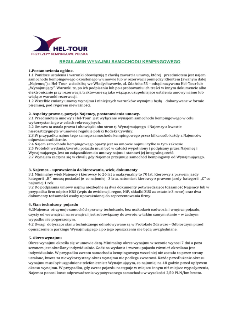 REGULAMIN WYNAJMU SAMOCHODU KEMPINGOWEGO 1.Postanowienia ogólne. 1.1 Poniższe ustalenia i warunki obowiązują z chwilą zawarcia umowy, której przedmiotem jest najem samochodu kempingowego określonego w umowie lub w rezerwacji pomiędzy Klientem (zwanym dalej „Najemcą”) a Hel-Tour z siedzibą we Władysławowie, ul. Gdańska 53 – odtąd nazywana Hel-Tour lub „Wynajmujący”. Warunki te, po ich podpisaniu lub po aprobowaniu ich treści w innym dokumencie albo elektronicznie przy rezerwacji, traktowane są jako wiążące, uzupełniające ustalenia umowy najmu lub wiążące warunki rezerwacji. 1.2 Wszelkie zmiany umowy wynajmu i niniejszych warunków wynajmu będą dokonywane w formie pisemnej, pod rygorem nieważności. 2. Aspekty prawne, pozycja Najemcy, postanowienia umowy. 2.1 Przedmiotem umowy z Hel-Tour jest wyłącznie wynajem samochodu kempingowego w celu wykorzystania go w celach rekreacyjnych. 2.2 Umowa ta ustala prawa i obowiązki obu stron tj. Wynajmującego i Najemcy a kwestie nierozstrzygnięte w umowie reguluje polski Kodeks Cywilny. 2.3.W przypadku najmu tego samego samochodu kempingowego przez kilka osób każdy z Najemców odpowiada solidarnie. 2.4 Najem samochodu kempingowego oparty jest na umowie najmu i tylko w tym zakresie. 2.5 Protokół wydania/zwrotu pojazdu musi być w całości wypełniony i podpisany przez Najemcę i Wynajmującego. Jest on załącznikiem do umowy najmu i stanowi jej integralną cześć. 2.7 Wynajem zaczyna się w chwili, gdy Najemca przejmuje samochód kempingowy od Wynajmującego. 3. Najemca – uprawnienia do kierowania, wiek, dokumenty 3.1 Minimalny wiek Najemcy i kierowcy to 26 lat a maksymalny to 70 lat. Kierowcy z prawem jazdy kategorii „B” muszą posiadać je co najmniej 3 lata, natomiast kierowcy z prawem jazdy kategorii „C” co najmniej 1 rok. 3.2 Do podpisania umowy najmu niezbędne są dwa dokumenty potwierdzające tożsamość Najemcy lub w przypadku firm odpis z KRS (wpis do ewidencji, regon, NiP, składki ZUS za ostatnie 3 m-ce) oraz dwa dokumenty tożsamości osoby upoważnionej do reprezentowania firmy. 4. Stan techniczny pojazdu 4.1Najemca otrzymuje samochód sprawny technicznie, bez uszkodzeń nadwozia i wnętrza pojazdu, czysty od wewnątrz i na zewnątrz i jest zobowiązany do zwrotu w takim samym stanie – w żadnym wypadku nie pogorszonym. 4.2 Uwagi dotyczące stanu technicznego odnotowywane są w Protokole Zdawczo - Odbiorczym przed opuszczeniem parkingu Wynajmującego a po jego opuszczeniu nie będą uwzględniane. 5. Okres wynajmu Okres wynajmu określa się w umowie datą. Minimalny okres wynajmu w sezonie wynosi 7 dni a poza sezonem jest określany indywidualnie. Godzina wydania i zwrotu pojazdu również określana jest indywidualnie. W przypadku zwrotu samochodu kempingowego wcześniej niż zostało to przez strony ustalone, kwota za niewykorzystany okres wynajmu nie podlega zwrotowi. Każde przedłużenie okresu wynajmu musi być uzgodnione telefonicznie z Wynajmującym, co najmniej na 48 godzin przed upływem okresu wynajmu. W przypadku, gdy zwrot pojazdu następuje w miejscu innym niż miejsce wypożyczenia, Najemca ponosi koszt odprowadzenia wypożyczonego samochodu w wysokości 2,50 PLN/km brutto. 6. Zwrot samochodu Jeśli samochód zostanie zwrócony po terminie określonym w umowie Wynajmujący pobierze 50,00 PLN za każdą rozpoczętą godzinę (maksymalna kwota może przekroczyć całkowitą opłatę dzienną). W przypadku uzyskania zgody Wynajmującego na przedłużenie terminu wynajmu, naliczona zostanie opłata zgodnie z cennikiem. Jeżeli Najemca nie zwróci pojazdu do 6 godzin od wygaśnięcia umowy i w tym czasie nie skontaktuje się z Wynajmującym, Wynajmujący poinformuje Policję o kradzieży. 7. Opłaty za wynajem 7.1 Opłata za wynajem samochodu kempingowego pobierana jest z góry, zgodnie z obowiązującym cennikiem wypożyczalni (do wglądu na stronie internetowej www.przyczepykempingowe.pl ). 7.2 Końcowe rozliczenie pomiędzy stronami następuje po zdaniu samochodu. 7.3 Pojazd winien być przekazany Najemcy z pełnym bakiem i tak też musi zostać zwrócony. W przeciwnym razie Wynajmujący obciąży Najemcę kosztami paliwa. 7.4 Koszt najmu odnosi się do 1 doby lub weekendu i jest wyrażany w PLN. 7.5 Na cenę ma wpływ okres sezonu, który w cenniku dzieli się na niski, średni i wysoki. 7.6 Opłaty za wynajem zawierają: - ograniczoną liczbę kilometrów do 300 na 1 dzień wynajmu, - stawka za 1 km przejechany ponad ten limit wynosi 0,65 netto PLN. 8. Opłaty, terminy płatności Po otrzymaniu od Wynajmującego umowy rezerwacji, Najemca winien dokonać na konto Wynajmującego wpłat według harmonogramu w niej zawartego. Najpóźniej w pierwszym dniu wynajmu, przed odbiorem wynajmowanego pojazdu, Najemca winien dostarczyć do siedziby Wynajmującego wymagane dokumenty oraz podpisać Umowę Wynajmu Samochodu Kempingowego. Potwierdzony okres wynajmu jest wiążący i może ulec zmianie tylko za wcześniejszą zgodą Wynajmującego. W przypadku odstąpienia od Umowy po dokonaniu rezerwacji, zadatek (50 % kosztów wynajmu) nie podlega zwrotowi. 9. Depozyt Depozyt w wysokości 5 000,00 PLN, będący zabezpieczeniem ewentualnych roszczeń Wynajmującego, jest wpłacany przez Najemcę na wskazane przez Hel-Tour konto na 14 dni przed rozpoczęciem wynajmu lub gotówką w dniu odbioru samochodu kempingowego. Depozyt zostanie zwrócony po właściwym zwrocie auta oraz prawidłowym wykonaniu umowy najmu w terminie 7 dni od dnia zwrotu pojazdu. Depozyt zostanie pomniejszony o wszystkie wydatki, związane z niewłaściwym wykonaniem umowy przez Najemcę. 10. Samochód kempingowy Wynajmujący zapewnia samochód należący do grupy pojazdów, a nie konkretny model pojazdu. W przypadku braku możliwości dostarczenia Najemcy pojazdu o porównywalnych parametrach z przyczyn niezależnych od Hel-Tour, jak np. z uwagi na udział pojazdu w wypadku, awarii lub kradzieży, Wynajmując