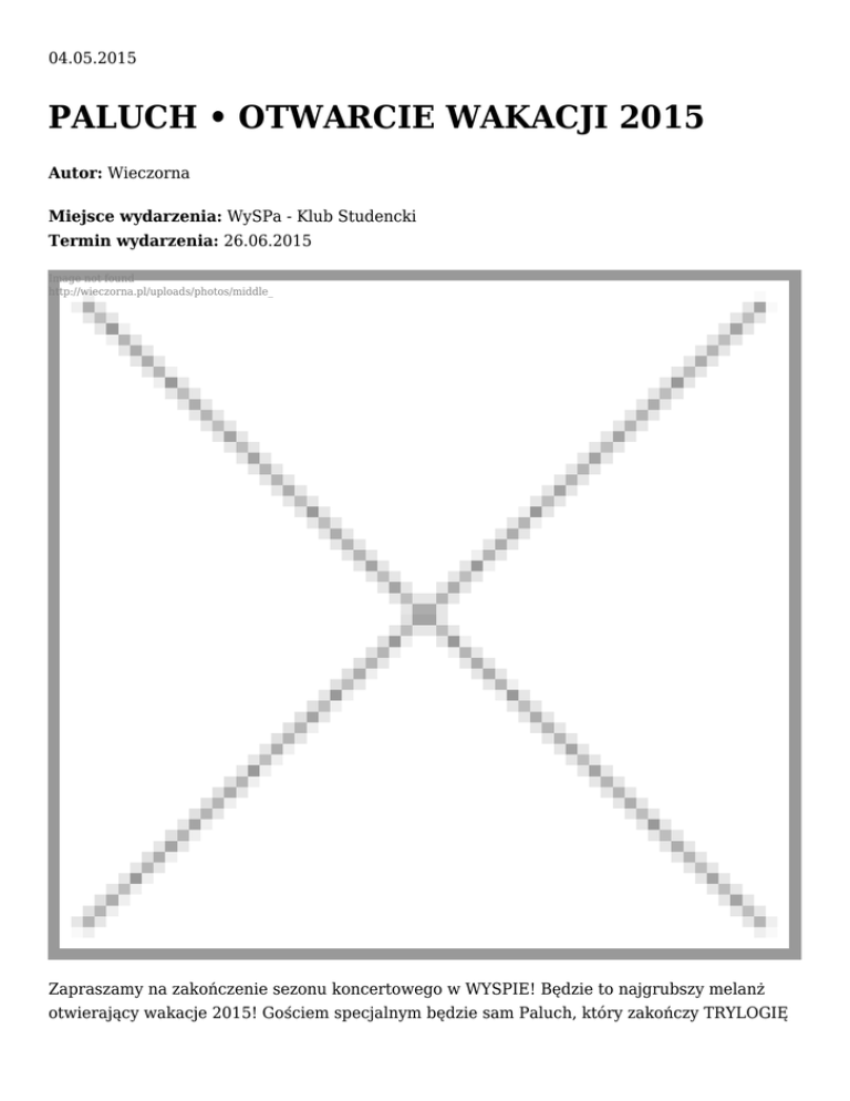 04.05.2015 PALUCH • OTWARCIE WAKACJI 2015 Autor: Wieczorna Miejsce wydarzenia: WySPa - Klub Studencki Termin wydarzenia: 26.06.2015 Image not found http://wieczorna.pl/uploads/photos/middle_ Zapraszamy na zakończenie sezonu koncertowego w WYSPIE! Będzie to najgrubszy melanż otwierający wakacje 2015! Gościem specjalnym będzie sam Paluch, który zakończy TRYLOGIĘ MALANŻU koncertem! Nie będzie to typowy koncert! Zapewniamy dużo tanecznej muzy, grill party i wybory miss mokrego podkoszulka , mega promo drinowe na barze dla Wszystkich gorących lasek! Pozostałych gości melanżu poznacie niebawem. Support : COACH 71 x MIGLIORE Bilety w cenach: 1 PULA 30zł 2 PULA 40zł 3 PULA 45 zł VIP - 50 zł (VIP room + podwójny Jack Daniels lub wybrany przez siebie drink. Dostępnych szt. 15! - abilet.pl Do kupienia od 6 czerwca w ALIEN SHOPIE i na abilet.pl wjazd 16+ http://www.facebook.com/events/842517365784552/