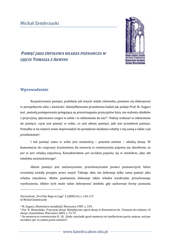 Pamięć jako zmysłowa władza poznawcza w ujęciu