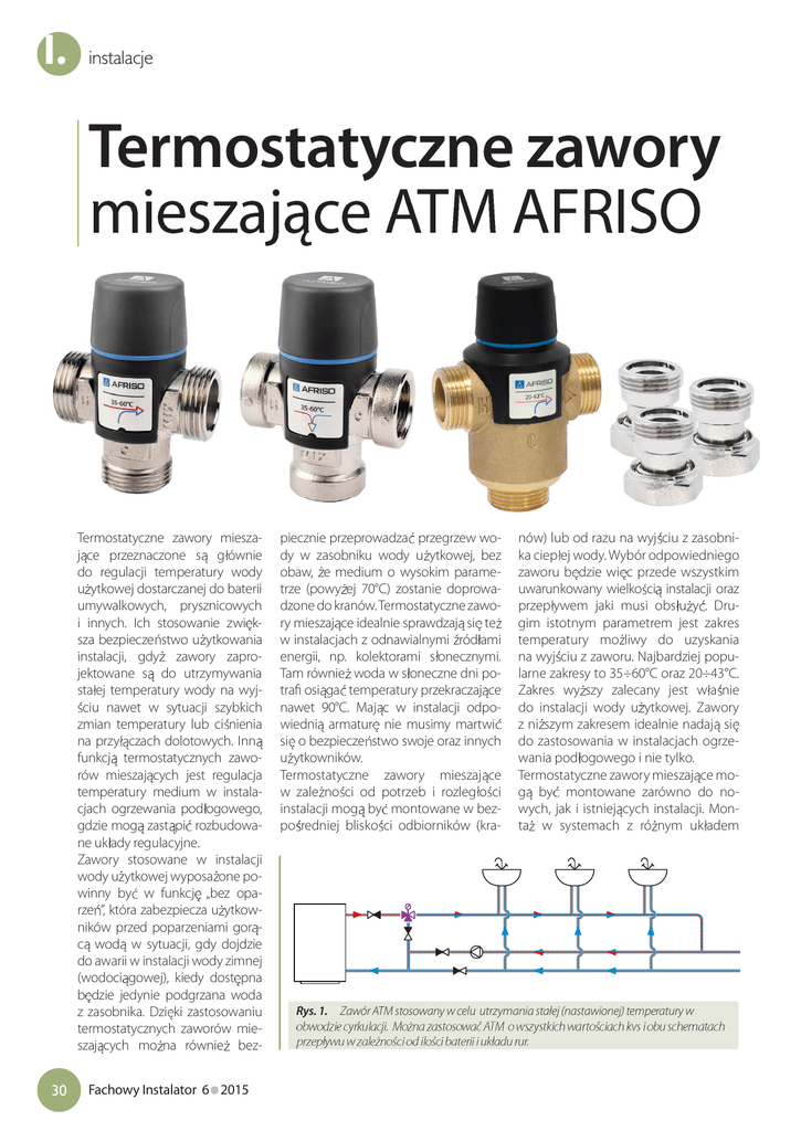 instalacje Termostatyczne zawory mieszaj ce przeznaczone s g ównie do regulacji temperatury wody u ytkowej dostarczanej do baterii umywalkowych, prysznicowych i innych. Ich stosowanie zwi ksza bezpiecze stwo u ytkowania instalacji, gdy zawory zaprojektowane s do utrzymywania sta ej temperatury wody na wyjciu nawet w sytuacji szybkich zmian temperatury lub ci nienia na przy czach dolotowych. Inn funkcj termostatycznych zaworów mieszaj cych jest regulacja temperatury medium w instalacjach ogrzewania pod ogowego, gdzie mog zast pi rozbudowane uk ady regulacyjne. Zawory stosowane w instalacji wody u ytkowej wyposa one powinny by w funkcj bez oparze , która zabezpiecza u ytkowników przed poparzeniami gor c wod w sytuacji, gdy dojdzie do awarii w instalacji wody zimnej (wodoci gowej), kiedy dost pna b dzie jedynie podgrzana woda z zasobnika. Dzi ki zastosowaniu termostatycznych zaworów mieszaj cych mo na równie bez- 30 piecznie przeprowadza przegrzew wody w zasobniku wody u ytkowej, bez obaw, e medium o wysokim parametrze (powy ej 70°C) zostanie doprowadzone do kranów. Termostatyczne zawory mieszaj ce idealnie sprawdzaj si te w instalacjach z odnawialnymi ród ami energii, np. kolektorami s onecznymi. Tam równie woda w s oneczne dni potra osi ga temperatury przekraczaj ce nawet 90°C. Maj c w instalacji odpowiedni armatur nie musimy martwi si o bezpiecze stwo swoje oraz innych u ytkowników. Termostatyczne zawory mieszaj ce w zale no ci od potrzeb i rozleg o ci instalacji mog by montowane w bezpo redniej blisko ci odbiorników (kra- nów) lub od razu na wyj ciu z zasobnika ciep ej wody. Wybór odpowiedniego zaworu b dzie wi c przede wszystkim uwarunkowany wielko ci instalacji oraz przep ywem jaki musi obs u y . Drugim istotnym parametrem jest zakres temperatury mo liwy do uzyskania na wyj ciu z zaworu. Najbardziej popularne zakresy to 35÷60°C oraz 20÷43°C. Zakres wy szy zalecany jest w a nie do instalacji wody u ytkowej. Zawory z ni szym zakresem idealnie nadaj si do zastosowania w instalacjach ogrzewania pod ogowego i nie tylko. Termostatyczne zawory mieszaj ce mog by montowane zarówno do nowych, jak i istniej cych instalacji. Monta w systemach z ró nym uk adem instalacje rur mo liwy jest dzi ki dost pno ci zaworów z mieszaniem bocznym lub dolnym. Zalecane jest wyposa enie zaworów mieszaj cych w zawory zwrotne oraz umieszczenie odpowiednich ltrów w instalacji. Zawory zwrotne mog by zintegrowane w rubunkach przeznaczonych do monta u zaworów termostatycznych. Takie rozwi zanie gwarantuje wygod oraz u atwia pó niejsz ewentualn konserwacj lub wymian armatury. Funkcj zaworów zwrotnych jest niedopuszczenie do grawitacyjnego przep ywu wody od górnego przy cza zasobnika, przez zawór i bajpas, do dolnego przy cza zasobnika w sytuacji, gdy woda nie jest pobierana. Skutkowa o by to mieszaniem wody w zasobniku, co niekorzystnie wp ywa na rozk ad temperatury w jego wn trzu. Zawory zwrotne wr cz s wymagane je li nie stosujemy przy zasobniku tzw. pu apki cieplnej (patrz rys. 4). Je li zawór zamontowany ma by w maej instalacji domku jednorodzinnego wybiera nale y spo ród zaworów o wspó czynniku kvs pomi dzy 1,6 a 2,5 m3/h. Takie zawory wystarczaj do zaopatrzenia w ciep wod od 2 do 5 punktów czerpalnych w domu. Zamontowane mog by na wyj ciu wody z zasobnika lub bli ej odbiorników. W instalacji mo e si znale kilka zaworów termostatycznych, je li zachodzi taka potrzeba. W przypadku konieczno ci zaopatrywania w ciep wod wi kszej ilo ci punktów czerpalnych stosowa mo na zawory o wspó czynniku kvs 3,2 lub nawet 4,2 m3/h. Za tymi zaworami mo emy pod czy nawet 8 punktów. Nale y jednak wzi pod uwag , e je li planujemy taki zawór umie ci bezpo rednio przed bateriami, trzeba mu zapewni odpowiedni przep yw do poprawnej pracy. Zalecane jest, eby co najmniej 2-3 punkty pobiera y wod z zaworu jednocze nie. Wtedy mo emy by pewni, e zawór b dzie dzia a poprawnie. Wi ksze zawory mog te by stosowane do rozleg ych instalacji ogrzewania podogowego. Nale y pami ta , e monta pompy obiegowej za zaworem mieszaj cym w takiej instalacji jest wymagany do poprawnej jej pracy. Dobr praktyk w budynkach wielorodzinnych lub budynkach u yteczno ci publicznej jest stosowanie kilku zaworów mieszaj cych w instalacji. Pierwszy, o du ym przep ywie (3,2 lub 4,2 m3/h), umieszczony bezpo rednio przy zbiorniku ciep ej wody oraz mniejsze zawory przed zespo em baterii. Zawór o wi kszym kvs wst pnie miesza wod i obni a jej temperatur , a zawory przed punktami doprowadzaj jej temperatur do danego poziomu. Mniejsze ró nice temperatur pomi dzy warto ci ustawion na zaworze a gor c wod dop ywaj c do zaworu wp ywaj na zwi kszenie dok adno ci regulacji, a przede wszystkim wyd u enie ywotno ci elementu termostatycznego w zaworze. Nale y jedynie pami ta , aby montuj c zawory przy zbiornikach na ciep wod stosowa tzw. pu apki cieplne, które zatrzymuj gor c wod z zasobniku. Zawór nie jest wtedy ci gle nara ony na wp yw wysokiej temperatury wody z zasobnika, która mo e w znacz cy sposób skróci okres u ytkowania zaworu. Dodatkowo, rozgrzany zawór musi w pierwszej kolejno ci przepu ci troch zimnej wody, eby si och odzi . Nie ma wtedy adnych zdolno ci regulacyjnych, a z odkr conego kranu wyp ywa b dzie przez jaki czas wy cznie zimna woda. 31