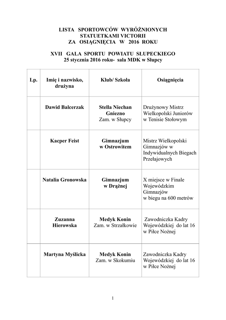 LISTA SPORTOWCÓW WYRÓŻNIONYCH STATUETKAMI VICTORII ZA OSIĄGNIĘCIA W 2016 ROKU XVII GALA SPORTU POWIATU SŁUPECKIEGO 25 stycznia 2016 roku- sala MDK w Słupcy Lp. Imię i nazwisko, drużyna Klub/ Szkoła Dawid Balcerzak Stella Niechan Gniezno Zam. w Słupcy Drużynowy Mistrz Wielkopolski Juniorów w Tenisie Stołowym Kacper Feist Gimnazjum w Ostrowitem Mistrz Wielkopolski Gimnazjów w Indywidualnych Biegach Przełajowych Natalia Gronowska Gimnazjum w Drążnej X miejsce w Finale Wojewódzkim Gimnazjów w biegu na 600 metrów Zuzanna Hierowska Medyk Konin Zam. w Strzałkowie Zawodniczka Kadry Wojewódzkiej do lat 16 w Piłce Nożnej Martyna Myślicka Medyk Konin Zam. w Skokumiu Zawodniczka Kadry Wojewódzkiej do lat 16 w Piłce Nożnej #1 Osiągnięcia Jerzy Orchowski Komenda Powiatowa Mistrz Wielkopolski PSP Strażaków PSP w w Słupcy Strzelectwie Sportowym Agata Suszka Klub Jeździecki w Mieczownicy Katarzyna Szkudlarek MKS MOS Słupca uczestniczka Mistrzostw Polski w Tenisie Stołowym Kadetek Karolina Synowiec SP w Strzałkowie VI miejsce w Mistrzostwach Województwa Szkół Podstawowych w Pływaniu stylem klasycznym Maciej Urbaniak UKS Kopernik Słupca uczestnik Mistrzostw Polski w Badmintonie Młodzików Jakub Wiśniewski UKS Kopernik Słupca uczestnik Mistrzostw Polski w Badmintonie Młodzików Młodszych #2 II miejsce na Ogólnopolskich Zawodach Konnych w Mieczownicy Drużyna Minisiatkówki UKS MOS Czarni Ostrowite (Kacper Ratajewski, Jakub Kaczmarek, Jakub Banaszewski, Łukasz Król, Adam Markiewcz, Damian Winkler Drużyna Badmintona Dziewcząt ZSE Słupca (Katarzyna Zysk, Wiktoria Dudek, Natalia Blejwas VI miejsce w Finale Wojewódzkim IV i V miejsce w Finale Wojewódzkim Szkół Ponadgimnazjalnych Drużyna Badmintona Chłopców SP 3 Słupca Mistrzowie (Jakub Wiśniewski, Województwa Wiktor Dobrowolski) Szkół Podstawowych Drużyna Badmintona Chłopców LO Słupca Mistrzowie (Jonasz Ansion, Województwa Szkół Marcel Kędziora, Ponadgimnazjalnych Robert Zatylny, Wojciech Dranikowski Drużyna Tenisa Stołowego Chłopców LO Słupca (Dawid Balcerzak, Dawid Białecki, Łukasz Piguła) #3 III miejsce w Mistrzostwach Województwa Szkół Ponadgimnazjalnych Drużyna Minikoszykówki Chłopców SP 3 Słupca V miejsce w Finale Wojewódzkim Szkół Podstawowych Drużyna Tenisa Stołowego Chłopców SP 3 Słupca (Kacper Filipowski, Szymon Molski) finaliści Mistrzostw Województwa Szkół Podstawowych Drużyna Unihokeja Chłopców Zespół Szkół Zawodowych w Słupcy V miejsce w Finale Wojewódzkim Szkół Ponadgimnazjalnych Drużyna Dziewcząt SP w Strzałkowie w Sztafetowych (Michalina Dyncer, Biegach Karolina Synowiec, Przełajowych Julia Pawela, Patrycja Miazga, Hanna Synowiec, Julia Jaszczyszyn, Weronika Śniegowska, Hanna Pikos, Marta Kasprzyk VIII miejsce w Mistrzostwach Województwa Szkół Podstawowych Drużyna Chłopców SP w Strzałkowie V miejsce w Finale W Sztafetowych (Erwin Kasprowicz, Wojewódzkim Szkół Biegach Franciszek Dąbrowski, Podstawowych Przełajowych Zbigniew Owczarzak, Igor Sulkowski, Jakub Plewczyński, Mateusz Wawrzyniak, Kamil Górecki, Eryk Gracjalny, Mateusz Węgrzyn, Mikołaj Płocharski) #4 Drużyna Chłopców W Sztafetowych Biegach Przełajowych Gimnazjum w V miejsce w Finale Ostrowitem Wojewódzkim (Kacper Feist, Filip Gimnazjów Biernasiak, Adrian Braciszewski, Hubert Liczbiśńki, Tobiasz Ostrowski, Łukasz Bąkowski, Łukasz Gąsiorowski, Maksymilian Szulc, Wiktor Winkler, Sebastian Kurek, Jakub Waliszewski) Drużyna Piłki Nożnej SSP Cienin Zaborny Mistrzowie Okręgu Konińskiego w Piłce Nożnej Młodzików Starszych #5