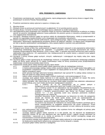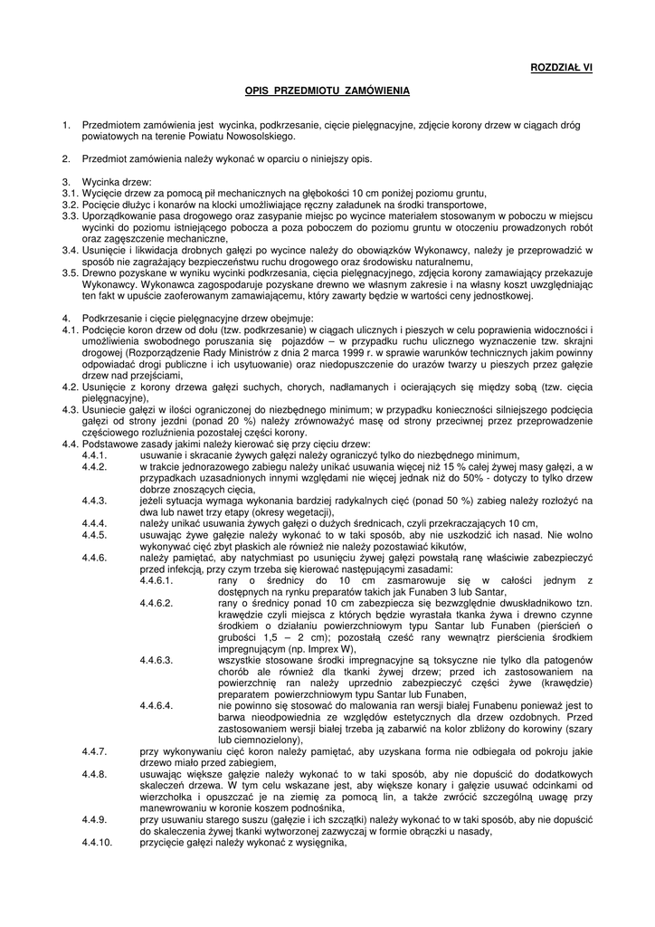 ROZDZIAŁ VI OPIS PRZEDMIOTU ZAMÓWIENIA 1. Przedmiotem zamówienia jest wycinka, podkrzesanie, cięcie pielęgnacyjne, zdjęcie korony drzew w ciągach dróg powiatowych na terenie Powiatu Nowosolskiego. 2. Przedmiot zamówienia należy wykonać w oparciu o niniejszy opis. 3. 3.1. 3.2. 3.3. Wycinka drzew: Wycięcie drzew za pomocą pił mechanicznych na głębokości 10 cm poniżej poziomu gruntu, Pocięcie dłużyc i konarów na klocki umożliwiające ręczny załadunek na środki transportowe, Uporządkowanie pasa drogowego oraz zasypanie miejsc po wycince materiałem stosowanym w poboczu w miejscu wycinki do poziomu istniejącego pobocza a poza poboczem do poziomu gruntu w otoczeniu prowadzonych robót oraz zagęszczenie mechaniczne, 3.4. Usunięcie i likwidacja drobnych gałęzi po wycince należy do obowiązków Wykonawcy, należy je przeprowadzić w sposób nie zagrażający bezpieczeństwu ruchu drogowego oraz środowisku naturalnemu, 3.5. Drewno pozyskane w wyniku wycinki podkrzesania, cięcia pielęgnacyjnego, zdjęcia korony zamawiający przekazuje Wykonawcy. Wykonawca zagospodaruje pozyskane drewno we własnym zakresie i na własny koszt uwzględniając ten fakt w upuście zaoferowanym zamawiającemu, który zawarty będzie w wartości ceny jednostkowej. 4. Podkrzesanie i cięcie pielęgnacyjne drzew obejmuje: 4.1. Podcięcie koron drzew od dołu (tzw. podkrzesanie) w ciągach ulicznych i pieszych w celu poprawienia widoczności i umożliwienia swobodnego poruszania się pojazdów – w przypadku ruchu ulicznego wyznaczenie tzw. skrajni drogowej (Rozporządzenie Rady Ministrów z dnia 2 marca 1999 r. w sprawie warunków technicznych jakim powinny odpowiadać drogi publiczne i ich usytuowanie) oraz niedopuszczenie do urazów twarzy u pieszych przez gałęzie drzew nad przejściami, 4.2. Usunięcie z korony drzewa gałęzi suchych, chorych, nadłamanych i ocierających się między sobą (tzw. cięcia pielęgnacyjne), 4.3. Usuniecie gałęzi w ilości ograniczonej do niezbędnego minimum; w przypadku konieczności silniejszego podcięcia gałęzi od strony jezdni (ponad 20 %) należy zrównoważyć masę od strony przeciwnej przez przeprowadzenie częściowego rozluźnienia pozostałej części korony. 4.4. Podstawowe zasady jakimi należy kierować się przy cięciu drzew: 4.4.1. usuwanie i skracanie żywych gałęzi należy ograniczyć tylko do niezbędnego minimum, 4.4.2. w trakcie jednorazowego zabiegu należy unikać usuwania więcej niż 15 % całej żywej masy gałęzi, a w przypadkach uzasadnionych innymi względami nie więcej jednak niż do 50% - dotyczy to tylko drzew dobrze znoszących cięcia, 4.4.3. jeżeli sytuacja wymaga wykonania bardziej radykalnych cięć (ponad 50 %) zabieg należy rozłożyć na dwa lub nawet trzy etapy (okresy wegetacji), 4.4.4. należy unikać usuwania żywych gałęzi o dużych średnicach, czyli przekraczających 10 cm, 4.4.5. usuwając żywe gałęzie należy wykonać to w taki sposób, aby nie uszkodzić ich nasad. Nie wolno wykonywać cięć zbyt płaskich ale również nie należy pozostawiać kikutów, 4.4.6. należy pamiętać, aby natychmiast po usunięciu żywej gałęzi powstałą ranę właściwie zabezpieczyć przed infekcją, przy czym trzeba się kierować następującymi zasadami: 4.4.6.1. rany o średnicy do 10 cm zasmarowuje się w całości jednym z dostępnych na rynku preparatów takich jak Funaben 3 lub Santar, 4.4.6.2. rany o średnicy ponad 10 cm zabezpiecza się bezwzględnie dwuskładnikowo tzn. krawędzie czyli miejsca z których będzie wyrastała tkanka żywa i drewno czynne środkiem o działaniu powierzchniowym typu Santar lub Funaben (pierścień o grubości 1,5 – 2 cm); pozostałą cześć rany wewnątrz pierścienia środkiem impregnującym (np. Imprex W), 4.4.6.3. wszystkie stosowane środki impregnacyjne są toksyczne nie tylko dla patogenów chorób ale również dla tkanki żywej drzew; przed ich zastosowaniem na powierzchnię ran należy uprzednio zabezpieczyć części żywe (krawędzie) preparatem powierzchniowym typu Santar lub Funaben, 4.4.6.4. nie powinno się stosować do malowania ran wersji białej Funabenu ponieważ jest to barwa nieodpowiednia ze względów estetycznych dla drzew ozdobnych. Przed zastosowaniem wersji białej trzeba ją zabarwić na kolor zbliżony do korowiny (szary lub ciemnozielony), 4.4.7. przy wykonywaniu cięć koron należy pamiętać, aby uzyskana forma nie odbiegała od pokroju jakie drzewo miało przed zabiegiem, 4.4.8. usuwając większe gałęzie należy wykonać to w taki sposób, aby nie dopuścić do dodatkowych skaleczeń drzewa. W tym celu wskazane jest, aby większe konary i gałęzie usuwać odcinkami od wierzchołka i opuszczać je na ziemię za pomocą lin, a także zwrócić szczególną uwagę przy manewrowaniu w koronie koszem podnośnika, 4.4.9. przy usuwaniu starego suszu (gałęzie i ich szczątki) należy wykonać to w taki sposób, aby nie dopuścić do skaleczenia żywej tkanki wytworzonej zazwyczaj w formie obrączki u nasady, 4.4.10. przycięcie gałęzi należy wykonać z wysięgnika, 4.4.11. 5. 5.1. 5.2. 5.3. po zakończeniu prac należy uporządkować pas drogowy z gałęzi poprzez ich usunięcie i likwidację w sposób nie zagrażający środowisku naturalnemu i bezpieczeństwu na koszt Wykonawcy. Zdjęcie korony drzewa, tzw. „ogłowienie”. Zdjęcie korony drzewa należy każdorazowo indywidualnie ustalić z zamawiającym ustalając sposób ogłowienia z uwzględnieniem warunków bezpieczeństwa oraz walorów estetycznych, Przy zdjęciu korony drzewa należy uwzględnić punkty: 4.4.6; 4.4.6.2; 4.4.6.3; 4.4.6.4; 4.4.8; 4.4.10, Do wycinki drzew, podkrzesania i ogłowienia wprowadzono pojęcie ,,warunki utrudnione” – są to warunki: a) kolizja bezpośrednia z napowietrznymi liniami energetycznymi i telekomunikacyjnymi, b) konieczność wykonania zabiegów pielęgnacyjnych w bezpośrednim sąsiedztwie zabudowań i nad zabudowaniami 