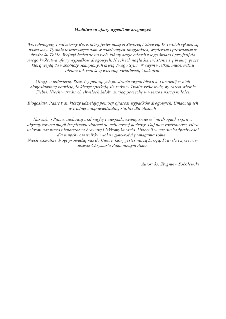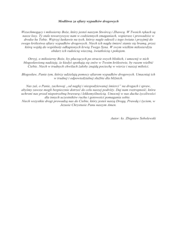 Modlitwa za ofiary wypadków drogowych Wszechmogący i miłosierny Boże, który jesteś naszym Stwórcą i Zbawcą. W Twoich rękach są nasze losy. Ty stale towarzyszysz nam w codziennych zmaganiach, wspierasz i prowadzisz w drodze ku Tobie. Wejrzyj łaskawie na tych, którzy nagle odeszli z tego świata i przyjmij do swego królestwa ofiary wypadków drogowych. Niech ich nagła śmierć stanie się bramą, przez którą wejdą do wspólnoty odkupionych krwią Twego Syna. W swym wielkim miłosierdziu obdarz ich radością wieczną, światłością i pokojem. Otrzyj, o miłosierny Boże, łzy płaczących po stracie swych bliskich, i umocnij w nich błogosławioną nadzieję, że kiedyś spotkają się znów w Twoim królestwie, by razem wielbić Ciebie. Niech w trudnych chwilach żałoby znajdą pociechę w wierze i naszej miłości. Błogosław, Panie tym, którzy udzielają pomocy ofiarom wypadków drogowych. Umacniaj ich w trudnej i odpowiedzialnej służbie dla bliźnich. Nas zaś, o Panie, zachowaj „od nagłej i niespodziewanej śmierci” na drogach i spraw, abyśmy zawsze mogli bezpiecznie dotrzeć do celu naszej podróży. Daj nam roztropność, która uchroni nas przed niepotrzebną brawurą i lekkomyślnością. Umocnij w nas ducha życzliwości dla innych uczestników ruchu i gotowości pomagania sobie. Niech wszystkie drogi prowadzą nas do Ciebie, który jesteś naszą Drogą, Prawdą i życiem, w Jezusie Chrystusie Panu naszym Amen. Autor: ks. Zbigniew Sobolewski