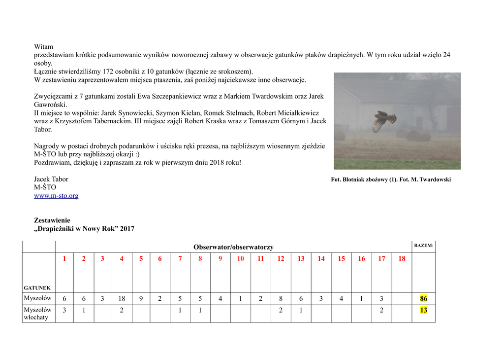 Witam przedstawiam krótkie podsumowanie wyników noworocznej zabawy w obserwacje gatunków ptaków drapieżnych. W tym roku udział wzięło 24 osoby. Łącznie stwierdziliśmy 172 osobniki z 10 gatunków (łącznie ze srokoszem). W zestawieniu zaprezentowałem miejsca ptaszenia, zaś poniżej najciekawsze inne obserwacje. Zwycięzcami z 7 gatunkami zostali Ewa Szczepankiewicz wraz z Markiem Twardowskim oraz Jarek Gawroński. II miejsce to wspólnie: Jarek Synowiecki, Szymon Kielan, Romek Stelmach, Robert Miciałkiewicz wraz z Krzysztofem Tabernackim. III miejsce zajęli Robert Kraska wraz z Tomaszem Górnym i Jacek Tabor. Nagrody w postaci drobnych podarunków i uścisku ręki prezesa, na najbliższym wiosennym zjeździe M-ŚTO lub przy najbliższej okazji :) Pozdrawiam, dziękuję i zapraszam za rok w pierwszym dniu 2018 roku! Jacek Tabor M-ŚTO www.m-sto.org Fot. Błotniak zbożowy (1). Fot. M. Twardowski Zestawienie „Drapieżniki w Nowy Rok” 2017 RAZEM: Obserwator/obserwatorzy 1 2 3 4 5 6 7 8 9 10 11 12 13 14 15 16 17 18 Myszołów 6 6 3 18 9 2 5 5 4 1 2 8 6 3 4 1 3 86 Myszołów włochaty 3 1 1 1 2 1 2 13 GATUNEK 2 Bielik 1 2 Krogulec 1 1 1 2 2 3 Błotniak zbożowy 3 2 1 1 5 2 1 11 1 1 2 2 4 1 1 Raróg 1 Sokół wędrowny 1 1 Razem: 16 10 3 27 Liczba gatunków 7 4 1 6 3 1 1 1 2 9 3 10 14 8 1 1 2 6 6 3 1 28 4 1 Srokosz 14 5 1 1 2 1 Jastrząb Pustułka 3 1 1 2 16 3 1 4 27 8 3 9 2 15 3 3 6 3 1 4 2 7 2 172 Miejsca obserwacji: 1 – Kuligów, Stasiopole, Małopole, Czarnów - Ewa Szczepankiewicz, Marek Twardowski 2 – Błota Brudzewickie, Inowłódz (łódzkie) - Jacek Tabor 3 – Gończyce, gm. Sobolew - Leszek Kołaczek 4 – Przybyszew, Gózd, Stara Błotnica, Suków, Jagodno, Domaniów, Wieniawa, Przytyk, Młodynie, Branica - Jarosław Synowiecki 5 – Kurpie - Marek Murawski 6 – gmina Wolanów k. Radomia - Robert Tęcza 7 – stawy w dolinie Krzemionki i okolice (łódzkie.) - Szymon Kielan 8 – dolina Wisły (Łomianki, Ławice Kiełpińskie, Pęcice) - Roman Stelmach 9 – okolice Wyszkowa - Łukasz Kurowski 10 – Rembertów i okolice - Paweł Kobyłecki 11 – Warszawa zachodnia, okolice Szelig i Latchorzewa - Karol Sieczak 12 – Pęcice, Laszczki i Gassy - Robert Miciałkiewicz, Krzysztof Tabernacki 13 – okolice Garbatki - Mariusz Molęda 14 – Piotrowice, gm. Jedlnia – Letnisko - Rafał Kuropieska 15 - Nieporęt -Rynia -Zegrze -Wieliszew – Dębe, - Pomiechówek (Bronislawka) - Łomna - Warszawa - Robert Kraska, Tomasz Górny 16 – północ regionu - Piotr Szczypiński 17 – okolice Błonia, Brwinów – Jarosław Gawroński 18 – Rynia, Arciechów, Aleksandrów - Stanisław Łubieński, Paweł Pstrokoński, Grzegorz Pac, Andrzej Pałgan Pozostałe ciekawsze obserwacje: czeczotka – 8 (6) jer – 1 (6) mewa żółtonoga – 1 (12) rzepołuch – 100 (12), 30 (1), dzięcioł białoszyi (1) gęgawa – 40 (1), 13 (5) łabędź czarnodzioby – 37 (7) bekasik – 1 (7) wodnik – 1 (7) ohar – 1 (7) cyraneczka – 4 (7) czapla biała – 1 (7), 3 (13) gęś zbożowa – 20 (7), 2 (5), 3 (17) żuraw – 4 (7) bąk – 1 (5) szpak – 25 (5), 23 (13) skowronek – 1 (13) uhla + (15), 4 (18) wąsatka + (15) krzyżodziób świerkowy + (16) orzechówka – 1 (16) żuraw – 3 (17) lodówka – 2 (18) mewa siodłata – 1 (18)