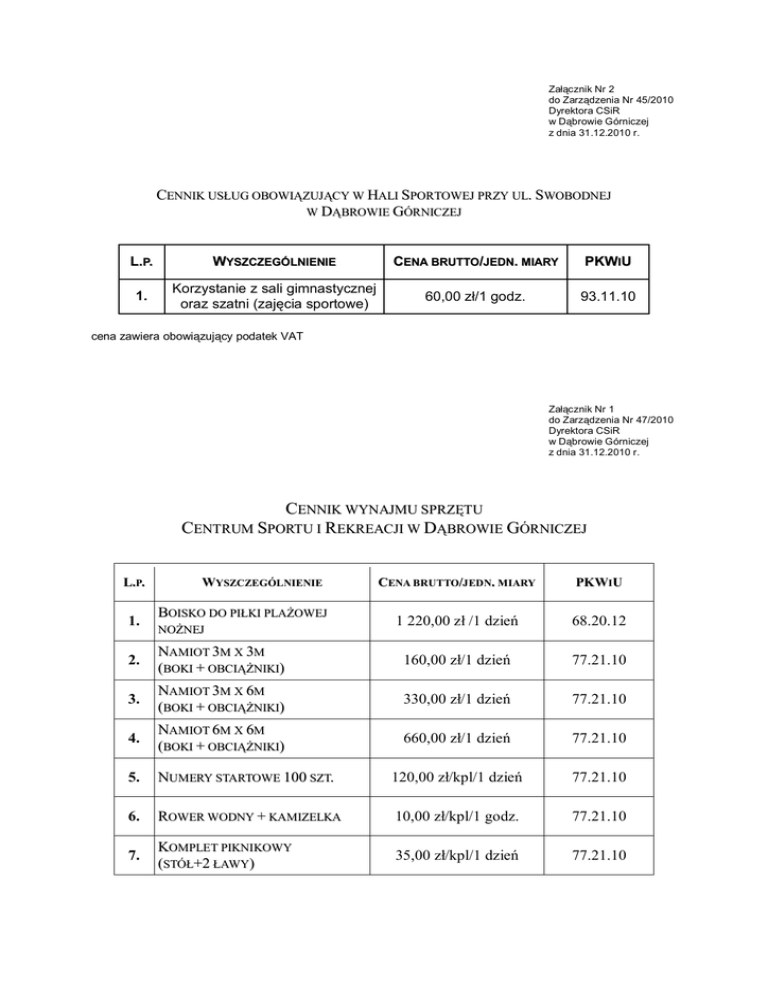 Załącznik Nr 2 do Zarządzenia Nr 45/2010 Dyrektora CSiR w Dąbrowie Górniczej z dnia 31.12.2010 r. CENNIK USŁUG OBOWIĄZUJĄCY W HALI SPORTOWEJ PRZY UL. SWOBODNEJ W DĄBROWIE GÓRNICZEJ L.P. WYSZCZEGÓLNIENIE CENA BRUTTO/JEDN. MIARY PKWIU 1. Korzystanie z sali gimnastycznej oraz szatni (zajęcia sportowe) 60,00 zł/1 godz. 93.11.10 cena zawiera obowiązujący podatek VAT Załącznik Nr 1 do Zarządzenia Nr 47/2010 Dyrektora CSiR w Dąbrowie Górniczej z dnia 31.12.2010 r. CENNIK WYNAJMU SPRZĘTU CENTRUM SPORTU I REKREACJI W DĄBROWIE GÓRNICZEJ L.P. 1. WYSZCZEGÓLNIENIE BOISKO DO PIŁKI PLAŻOWEJ NOŻNEJ CENA BRUTTO/J EDN. MIARY PKWIU 1 220,00 zł /1 dzień 68.20.12 2. NAMIOT 3M X 3M (BOKI + OBCIĄŻNIKI) 160,00 zł/1 dzień 77.21.10 3. NAMIOT 3M X 6M (BOKI + OBCIĄŻNIKI) 330,00 zł/1 dzień 77.21.10 4. NAMIOT 6M X 6M (BOKI + OBCIĄŻNIKI) 660,00 zł/1 dzień 77.21.10 5. NUMERY STARTOWE 100 SZT. 120,00 zł/kpl/1 dzień 77.21.10 6. ROWER WODNY + KAMIZELKA 10,00 zł/kpl/1 godz. 77.21.10 7. KOMPLET PIKNIKOWY (STÓŁ+2 ŁAWY) 35,00 zł/kpl/1 dzień 77.21.10 8. SPRZĘT NAGŁAŚNIAJĄCY (KOMPLET) 9. TRYBUNY Z OBSŁUGĄ 370,00 zł/kpl/1 dzień 77.21.10 1 220,00 zł/kpl/1 dzień 77.21.10 10. KANAŁY KABLOWE 35,00 zł/szt./1 dzień 77.21.10 11. KRZESŁA KONFERENCYJNE 5,00 zł/szt./1 dzień 77.21.10 12. TUBY ŚNIEŻNE (OD OSOBY) 8,00 zł/szt./1 godz. 50,00 zł/szt./1 dzień 77.21.10 13. STÓŁ DO SIŁOWANIA NA RĘKĘ 60,00 zł/szt./1 dzień 77.21.10 14. UBIÓR REKLAMOWY „BÓBR” 40,00 zł/szt./1 dzień 77.21.10 ceny zawierają obowiązujący podatek VAT Załącznik Nr 2 do Zarządzenia Nr 49/2010 Dyrektora CSiR w Dąbrowie Górniczej z dnia 31.12.2010 r. CENNIK PNEUMATYCZNEJ ŚCIANKI WSPINACZKOWEJ L.P. 1. 2. WYSZCZEGÓLNIENIE ŚCIANKA WSPINACZKOWA, DWUTOROWA Z OBSŁUGĄ* KORZYSTANIE ZE ŚCIANKI** WSPINACZKOWEJ Ceny zawierają obowiązujący podatek VAT *cena dotyczy wynajmu na okres do 12 godzin z obsługą 2 osób ** cena dotycz dwóch wejść lub do 10 min. korzystania ze ścianki CENA BRUTTO/J EDN. MIARY PKWIU 2 000,00 zł 77.21.10 5,00 zł 77.21.10 Załącznik Nr 1 do Zarządzenia Nr 45 /2010 Dyrektora CSiR w Dąbrowie Górniczej z dnia 31.12.2010 r. REGULAMIN HALI SPORTOWEJ PRZY UL. SWOBODNEJ 1. Hala sportowa i siłownia są obiektami służącymi zaspokajaniu potrzeb dzieci i młodzieży szkolnej w zakresie obowiązujących lekcji wychowania fizycznego oraz zajęć sportowo- rekreacyjnych klubów i innych grup sportowych oraz osób fizycznych. 2. Zajęcia w hali sportowej odbywają się zgodnie z harmonogramem. 3. Korzystający z obiektu hali sportowej jest zobowiązany do używania sali, sprzętu i urządzeń zgodnie z ich przeznaczeniem. 4. Za bezpieczeństwo ćwiczących podczas zajęć i w czasie przebywania na obiekcie odpowiada prowadzący zajęcia lub opiekun grupy. 5. Przebywanie na obiekcie i korzystanie z urządzeń jest dozwolone w obecności prowadzącego zajęcia: nauczyciela, trenera, instruktora i opiekuna grupy. 6. Wejście na halę sportową dozwolone jest wyłącznie w stroju sportowym w obuwiu sportowym przeznaczonym do zajęć sportowych na parkiecie. 7. Korzystający z obiektu przygotowują się do zajęć w pomieszczeniach do tego celu przystosowanych (szatnie). Zabrania się przebierania na hali sportowej. 8. Obowiązkiem osób korzystających z obiektu jest dbałość o czystość pomieszczeń oraz szanowanie urządzeń i sprzętu. 9. Uprawnionymi do korzystania z urządzeń i sprzętu sportowego są prowadzący zajęcia i grupy ćwiczące. 10. W przypadku uszkodzenia, zniszczenia, kradzieży sprzętu lub urządzenia, prowadzący zajęcia wymieniony w pkt. 5, bezzwłocznie powiadamia o tym kierownika - gospodarza obiektu. 11. Prowadzący zajęcia opuszcza halę sportową po wyjściu ostatniego z ćwiczących i przekazuje ją dyżurnemu pracownikowi w takim stanie, jakim została przejęta przed rozpoczęciem zajęć. 12. Za rzeczy pozostawione w szatni w innych pomieszczeniach odpowiadają prowadzący zajęcia wymienieni w pkt. 5. 13. Bez zezwolenia kierownika - gospodarza obiektu zabrania się wynoszenia poza obiekt sprzętu i urządzeń sportowych. 14. Opiekę nad sprzętem i urządzeniami sportowymi w czasie zajęć sprawuje (odpowiada) prowadzący zajęcia nauczyciel lub opiekun grupy. 15. Każda grupa korzystająca z obiektu odpowiada za ład i porządek w czasie zajęć. 16. Zabrania się palenia tytoniu i picia alkoholu w pomieszczeniach hali sportowej. 17. Za wypadki zaistniałe w czasie zajęć - CSiR nie odpowiada. 18. Widzowie zawodów sportowych korzystają z balkonu lub ławek na sali pod warunkiem, że będą posiadali zmienne obuwie sportowe (tenisówki, trampki). 19. Wszyscy chcący korzystać z sali sportowej zobowiązani są uprzednio do zawarcia pisemnej umowy z CSiR.