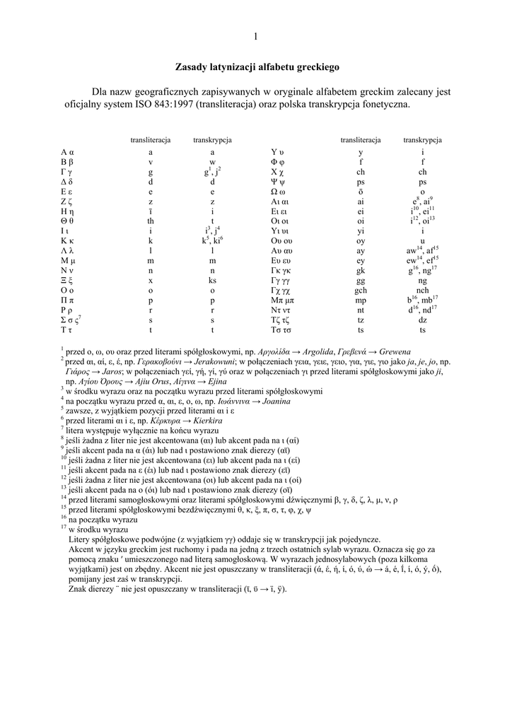 1 Zasady latynizacji alfabetu greckiego Dla nazw geograficznych zapisywanych w oryginale alfabetem greckim zalecany jest oficjalny system ISO 843:1997 (transliteracja) oraz polska transkrypcja fonetyczna. Αα Ββ Γγ Δδ Εε Ζζ Ηη Θθ Ιι Κκ Λλ Μμ Νν Ξξ Οο Ππ Ρρ Σ σ ς7 Ττ 1 transliteracja transkrypcja a v g d e z ī th i k l m n x o p r s t a w g1, j2 d e z i t i3, j4 k5, ki6 l m n ks o p r s t Υυ Φφ Χχ Ψψ Ωω Αι αι Ει ει Οι οι Υι υι Ου ου Αυ αυ Ευ ευ Γκ γκ Γγ γγ Γχ γχ Μπ μπ Ντ ντ Τζ τζ Τσ τσ transliteracja transkrypcja y f ch ps ō ai ei oi yi oy ay ey gk gg gch mp nt tz ts i f ch ps o e8, ai9 i10, ei11 i12, oi13 i u aw14, af15 ew14, ef15 g16, ng17 ng nch b16, mb17 d16, nd17 dz ts przed ο, ω, ου oraz przed literami spółgłoskowymi, np. Αργολίδα → Argolida, Γρεβενά → Grewena przed αι, αί, ε, έ, np. Γερακοβούνι → Jerakowuni; w połączeniach γεια, γειε, γειο, για, γιε, γιο jako ja, je, jo, np. Γιάρος → Jaros; w połączeniach γεί, γή, γί, γύ oraz w połączeniach γι przed literami spółgłoskowymi jako ji, np. Αγίου Όρους → Ajiu Orus, Αίγινα → Ejina 3 w środku wyrazu oraz na początku wyrazu przed literami spółgłoskowymi 4 na początku wyrazu przed α, αι, ε, ο, ω, np. Ιωάννινα → Joanina 5 zawsze, z wyjątkiem pozycji przed literami αι i ε 6 przed literami αι i ε, np. Κέρκυρα → Kierkira 7 litera występuje wyłącznie na końcu wyrazu 8 jeśli żadna z liter nie jest akcentowana (αι) lub akcent pada na ι (αί) 9 jeśli akcent pada na α (άι) lub nad ι postawiono znak dierezy (αϊ) 10 jeśli żadna z liter nie jest akcentowana (ει) lub akcent pada na ι (εί) 11 jeśli akcent pada na ε (έι) lub nad ι postawiono znak dierezy (εϊ) 12 jeśli żadna z liter nie jest akcentowana (οι) lub akcent pada na ι (οί) 13 jeśli akcent pada na ο (όι) lub nad ι postawiono znak dierezy (οϊ) 14 przed literami samogłoskowymi oraz literami spółgłoskowymi dźwięcznymi β, γ, δ, ζ, λ, μ, ν, ρ 15 przed literami spółgłoskowymi bezdźwięcznymi θ, κ, ξ, π, σ, τ, φ, χ, ψ 16 na początku wyrazu 17 w środku wyrazu Litery spółgłoskowe podwójne (z wyjątkiem γγ) oddaje się w transkrypcji jak pojedyncze. Akcent w języku greckim jest ruchomy i pada na jedną z trzech ostatnich sylab wyrazu. Oznacza się go za pomocą znaku ′ umieszczonego nad literą samogłoskową. W wyrazach jednosylabowych (poza kilkoma wyjątkami) jest on zbędny. Akcent nie jest opuszczany w transliteracji (ά, έ, ή, ί, ό, ύ, ώ → á, é, ¸, í, ó, ý, à), pomijany jest zaś w transkrypcji. Znak dierezy ¨ nie jest opuszczany w transliteracji (ϊ, ϋ → ï, ÿ). 2 2 Wymowa W przypadku większości liter transkrypcja jest zgodna z wymową, różnice są zaś nastepujące: Γγ transkrypcja g, j Δδ Θθ Χχ d t ch Αυ αυ aw, af Ευ ευ ew, ef Τζ τζ Τσ τσ dz ts wymowa przed ο, ω, ου oraz przed spółgłoskami gh (zbliżone do dźwięcznego h) w pozostałych przypadkach j dh jak angielskie th w mother th jak w angielskim think przed literami αι i ε jako chi, np. chiersonisos, w pozostałych przypadkach ch jeśli nad υ postawiono znak dierezy (ϋ) jako ai, w pozostałych przypadkach tak jak w transkrypcji jeśli nad υ postawiono znak dierezy (ϋ) jako ei, w pozostałych przypadkach tak jak w transkrypcji dz c