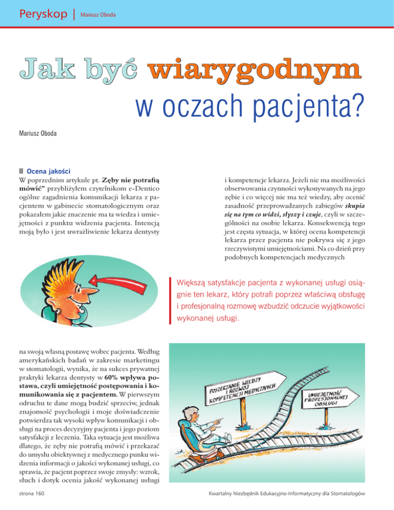 Peryskop | Mariusz Oboda Jak być wiarygodnym w oczach pacjenta? Mariusz Oboda Ocena jakości W poprzednim artykule pt. Zęby nie potrafią mówić” przybliżyłem czytelnikom e-Dentico ogólne zagadnienia komunikacji lekarza z pacjentem w gabinecie stomatologicznym oraz pokazałem jakie znaczenie ma ta wiedza i umiejętności z punktu widzenia pacjenta. Intencją moją było i jest uwrażliwienie lekarza dentysty i kompetencje lekarza. Jeżeli nie ma możliwości obserwowania czynności wykonywanych na jego zębie i co więcej nie ma też wiedzy, aby ocenić zasadność przeprowadzanych zabiegów skupia się na tym co widzi, słyszy i czuje, czyli w szczególności na osobie lekarza. Konsekwencją tego jest częsta sytuacja, w której ocena kompetencji lekarza przez pacjenta nie pokrywa się z jego rzeczywistymi umiejętnościami. Na co dzień przy podobnych kompetencjach medycznych Większą satysfakcje pacjenta z wykonanej usługi osiągnie ten lekarz, który potrafi poprzez właściwą obsługę i profesjonalną rozmowę wzbudzić odczucie wyjątkowości wykonanej usługi. na swoją własną postawę wobec pacjenta. Według amerykańskich badań w zakresie marketingu w stomatologii, wynika, że na sukces prywatnej praktyki lekarza dentysty w 60% wpływa postawa, czyli umiejętność postępowania i komunikowania się z pacjentem. W pierwszym odruchu te dane mogą budzić sprzeciw, jednak znajomość psychologii i moje doświadczenie potwierdza tak wysoki wpływ komunikacji i obsługi na proces decyzyjny pacjenta i jego poziom satysfakcji z leczenia. Taka sytuacja jest możliwa dlatego, że zęby nie potrafią mówić i przekazać do umysłu obiektywnej z medycznego punku widzenia informacji o jakości wykonanej usługi, co sprawia, że pacjent poprzez swoje zmysły: wzrok, słuch i dotyk ocenia jakość wykonanej usługi strona 160 Kwartalny Niezbędnik Edukacyjno-Informatyczny dla Stomatologów Jak być wiarygodnym w oczach pacjenta? Rozwój zawodowy lekarza dentysty, który chce aby wzrastała zarówno liczba jego pacjentów jak i ich poziom satysfakcji powinien przebiegać dwu torowo. Z jednej strony lekarz powinien doskonalić swoje umiejętności związane z wykonywaniem czynności medycznych i poznawaniem nowych technologii leczenia, a z drugiej strony rozwijać swoją umiejętność świadomego komunikowania się i postępowania z pacjentem. Dla uzyskania zgody pacjenta na kompleksowe leczenie niezbędna wydaje się umiejętność pokazania pacjentowi własnego potencjału umiejętności zawodowych zdolnych zaspokoić jego oczekiwania. Jest to właśnie budowanie zaufania. Podstawą zaufania jest wykreowanie w oczach pacjenta swojej postawy jako zdolnej do spełnienia jego oczekiwań. To wszystko po to, aby ograniczyć dyskomfort wynikający z kupowania w ciemno, tylko na podstawie złudnych wyobrażeń. Kupowanie kota w worku Pacjent, który jest pierwszy raz w gabinecie stomatologicznym staje przed koniecznością podjęcia decyzji o leczeniu, bez możliwości sprawdzenia jakości pracy lekarza. Lekarz dentysta oferuje pacjentowi specyficzny towar, którego nie może On zobaczyć przed decyzją kupna. Jest to usługa zdrowotna, której pacjent musi się sam poddać, doświadczyć jej jakości na własnej skórze, bez możliwości wykonania próby jakości, oraz pewności, że będzie zadowolony. Jest to bardzo nie komfortowa dla niego sytuacja. Dodatkowo pacjent nie posiada wiedzy medycznej, która pozwalałaby jemu na ocenę zasadności podejmowanych przez lekarza czynności. Z tych powodów odczucie pacjenta na temat kompetencji medycznych lekarza i jego wiarygodność e-Dentico NUMER 3 (7) / 2005 wydają się szczególnie ważne. Pacjent swoje przekonanie na temat lekarza buduje sobie poprzez skupienie się na Jego postawie, na którą składa się wygląd, sposób zachowania oraz sposób prowadzenia rozmowy. Przed lekarzem, który chce świadomie rozwijać swoją praktykę i uzyskiwać więcej akceptacji kompleksowych planów leczenia i drogich rozwiązań staje wyzwanie prawdopodobnie inne niż to, na którym dotychczas koncentrował większą część swojej uwagi; wyzwanie, do którego nie został przygotowany w procesie edukacji, a dotyczy ono tego, aby poprzez komunikowanie się z pacjentem i sposób postepowania z nim pokazać jemu swoje możliwości zawodowe, które są w stanie spełnić jego oczekiwania. Walt Disney powiedział „ fakty są niczym ich percepcja jest wszystkim”. Przy oferowaniu leczenia w gabinecie dentystycznym jest podobnie, znaczenie ma to co powstaje w umyśle pacjenta. Złe, często wynikające z braku świadomości zarządzanie własną osobą jest przeszkodą w eksponowaniu rzeczywistych zalet i umiejętności lekarza, czyli jego potencjału zdolnego do zrealizowania potrzeby pacjenta. Przykładem może być rozmowa z dentystką, która podeszła do mojego stoiska na Targach i podzieliła się ze mną z żalem w głosie swoją sytuacją, że prawie co tydzień jeździ na różne kursy, dużo potrafi, wiele się nauczyła, posiada wysokie kwalifikacje medyczne ale nie może pacjentów namówić do drogich prac. Prawie więcej wydaje na kursy medyczne niż zarabia. Przypuszczalną przyczyną był mówiąc ogólnie brak zaufania pacjentów do jej kompetencji medycznych. Prawdę mówiąc nie dziwiło mnie to specjalnie, ponieważ jej wygląd, sposób zachowania i wypowiadania się nie wzbudzał we mnie również zaufania do jej kompetencji. Nie była to oczywiście obiektywna ocena tylko pierwsze wrażenie, nie mniej jednak było ono niekorzystne dla mojej rozmówczyni. Wyrobiłem sobie, być może krzywdzącą opinie na jej temat na podstawie tych kryteriów jakimi również kieruje się pacjent w gabinecie. Gdyby Pani strona 161 Peryskop | Mariusz Oboda X uświadomiła sobie jak jest odbierana i zwróciła uwagę na swój wygląd, zachowanie i sposób wypowiadania się mogłaby zacząć rozwijać swoje umiejętności interpersonalne i s