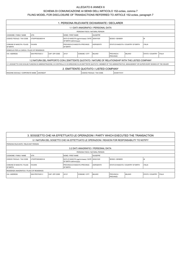 ALLEGATO 6 /ANNEX 6 SCHEMA DI COMUNICAZIONE AI SENSI DELL’ARTICOLO 152-octies, comma 7 FILING MODEL FOR DISCLOSURE OF TRANSACTIONS REFERRED TO ARTICLE 152-octies, paragraph 7 1. PERSONA RILEVANTE DICHIARANTE / DECLARER 1.1 DATI ANAGRAFICI / PERSONAL DATA PERSONA FISICA / NATURAL PERSON COGNOME / FAMILY NAME VITA NOME / FIRST NAME CODICE FISCALE / TAX CODE VTIGPP35D28D514I DATA DI NASCITA (gg/mm/aaaa) / DATE 28/04/1935 OF BIRTH (dd/mm/yyyy) SESSO / GENDER M COMUNE DI NASCITA / PLACE FAVARA PROVINCIA DI NASCITA /PROVINCE AGRIGENTO STATO DI NASCITA / COUNTRY OF BIRTH ITALIA MILANO PROVINCIA / PROVINCE STATO / COUNTRY OF BIRTH GIUSEPPE OF BIRTH DOMICILIO PER LA CARICA / PLACE OF RESIDENCE: VIA / ADDRESS SAN PROTASO 3 CAP / ZIP CODE 20121 COMUNE / CITY MILANO ITALIA 1.2 NATURA DEL RAPPORTO CON L'EMITTENTE QUOTATO / NATURE OF RELATIONSHIP WITH THE LISTED COMPANY C.1) SOGGETTO CHE SVOLGE FUNZIONI DI AMMINISTRAZIONE, DI CONTROLLO O DI DIREZIONE IN UN EMITTENTE QUOTATO / MEMBER OF THE ADMINISTRATIVE, MANAGEMENT OR SUPERVISORY BODIES OF THE ISSUER 2. EMITTENTE QUOTATO / LISTED COMPANY RAGIONE SOCIALE / CORPORATE NAME UNICREDIT CODICE FISCALE / TAX CODE 00348170101 3. SOGGETTO CHE HA EFFETTUATO LE OPERAZIONI / PARTY WHICH EXECUTED THE TRANSACTION 3.1 NATURA DEL SOGETTO CHE HA EFFETTUATO LE OPERAZIONI / REASON FOR RESPONSABILITY TO NOTIFY PERSONA RILEVANTE / RELEVANT PERSON 3.2 DATI ANAGRAFICI / PERSONAL DATA 1 PERSONA FISICA / NATURAL PERSON COGNOME / FAMILY NAME VITA NOME / FIRST NAME CODICE FISCALE / TAX CODE VTIGPP35D28D514I DATA DI NASCITA (gg/mm/aaaa) / DATE 28/04/1935 OF BIRTH (dd/mm/yyyy) SESSO / GENDER M COMUNE DI NASCITA / PLACE FAVARA PROVINCIA DI NASCITA /PROVINCE AGRIGENTO STATO DI NASCITA / COUNTRY OF BIRTH ITALIA MILANO PROVINCIA / STATO / COUNTRY OF BIRTH GIUSEPPE OF BIRTH RESIDENZA ANAGRAFICA / PLACE OF RESIDENCE: VIA / ADDRESS SAN PROTASO 3 CAP / ZIP CODE 20121 COMUNE / CITY PROVINCE MILANO ITALIA 4. OPERAZIONI / TRANSACTION SEZIONE A): RELATIVA ALLE AZIONI E STRUMENTI FINANZIARI EQUIVALENTI E ALLE OBBLIGAZIONI CONVERTIBILI COLLEGATE SECTION A): RELATED TO SHARES AND EQUIVALENT FINANCIAL INSTRUMENT AND ASSOCIATED CONVERTIBLE BOND DATA / DATE TIPO OPERAZ. / TYPE OF CODICE ISIN / ISIN CODE 3 DENOMINAZIONE TITOLO / NAME OF SECURITY TIPO STRUM. QUANTITÀ / FINANZIARIO / QUANTITY TYPE OF TRANSACTI ON 2 02/04/2013 V IT0004781412 UNICREDIT 03/04/2013 A IT0004781412 UNICREDIT 03/04/2013 A IT0004781412 UNICREDIT TOTALE CONTROVALORE SEZIONE A (in €) / TOTAL AMMOUNT SECTION A (in €) FINANCIAL INSTRUMENT 4 - 950 25,000 25,000 PREZZO (in €) / CONTROVAL. (in €) MODALITÀ NOTE / PRICE (in €) 5 / VALUE (in €) DELL'OPERAZ. / NOTES DESCRIPTION OF TRANSACTION 6 3,135 MERC-ES 83,050 MERC-IT 83,450 MERC-IT 3.3 3.322 3.338 169,635 SEZIONE B): RELATIVA AGLI ALTRI STRUMENTI FINANZIARI COLLEGATI ALLE AZIONI DI CUI ALL’ART. 152-sexies, comma 1, lett. b1 , b3 SECTION B): RELATED TO FINANCIAL INSTRUMENTS ASSOCIATED TO SHARE REFERRED TO IN ART. 152-sexies, paragraph 1, letters b1 , b3 DATA / DATE TIPO OPER. / TYPE OF TRANSA 7 CTION TIPO STRUM. FINANZIARIO COLLEGATO / TYPE OF ASSOCIATED FINANCIAL 8 INSTRUMENT TIPO FACOLTA' / TYPE OF 9 RIGHT STRUM. FINANZIARIO COLLEGATO / ASSOCIATED FINANCIAL INSTRUMENT CODICE ISIN / 10 ISIN CODE DENOMINAZIONE / 11 NAME AZIONE SOTTOSTANTE / UNDERLYING SECURITY CODICE ISIN / ISIN CODE DENOMINAZIONE / 12 NAME INVESTIMENTO/DISINVESTIMENTO EFFETTIVO / ACTUAL INVESTMENT/DISINVESTMENT QUANTITÀ / QUANTITY INVESTIMENTO/DISINV. POTENZIALE (NOZIONALE) / POTENTIAL (NOTIONAL) INVESTMENT /DISINVESTMENT QUANTITÀ DEL PREZZO (in €) CONTROVALORE (in €) SOTTOSTANTE 5 / PRICE (in €) / VALUE (in €) / QUANTITY OF UNDERLYING PREZZO D’ES. O CONTROVALORE (in €) REGOLAMENTO / VALUE (in €) / STRIKE OR SETTLEMENT PRICE (in €) TOTALE CONTROVALORE POTENZIALE SEZIONE B (in €) / TOTAL POTENTIAL AMMOUNT SECTION B (in €) TOTALE CONTROVALORE SEZIONE A + SEZIONE B (in €) / TOTAL AMMOUNT SECTION A + SECTION B (in €) 0 169,635 DATA NOTE / SCADENZA / NOTES MATURITY 1. Questa sezione relativa ai dati anagrafici del soggetto non va compilata nel caso in cui il soggetto coincida con il dichiarante della sezione 1.1 / Not to fill if the person wich executed the transaction is the same as section 1.1 2. Indicare la tipologia di operazione, effettuata anche mediante l’esercizio di strumenti finanziari collegati / Indicate the type of transaction, even if executed through the exercise of associated financial instruments: - A = acquisto / purchase V = vendita / sale - S = sottoscrizione / subscription X = scambio / excange 3. Il codice ISIN deve essere sempre indicato qualora lo strumento finanziario ne abbia ricevuto l’assegnazione da un’agenzia di codifica internazionale (es. UIC per l’Italia) / ISIN code must be indicated whenever the financial istrument received that code from an 4. appointed international agency (e.g. UIC for Italy) Indicare lo strumento finanziario oggetto dell’operazione / Indicate the financial instrument involved in the transaction: 5. - AZO = azioni ordinarie / ordinary shares - AZP = azioni privilegiate / preference shares AZR = azioni di risparmio / saving shares - QFC = quote di fondi chiusi quotati / units of closed-end funds EQV = altri strumenti finanziari, equivalenti alle azioni, rappresentanti tali azioni / other financial instruments, equivalent, or representative of shares - OBCV = Obbligazioni convertibili o altri strumenti finanziari scambiabili con azioni / convertible bonds or other debt financial instruments convertible into shares or exchangeable for shares - - = azione non quotata / - = non listed share Nel caso in cui nel corso della giornata per un dato titolo sia stata effettuata più di una operazione dello stesso tipo (vedi nota 2) e con la stessa modalità (vedi nota 6) indicare il prezzo medio ponderato delle suddette operazioni. Nel caso di obbligazioni convertibili deve essere indicato in centesimi (es. per un’obbliga