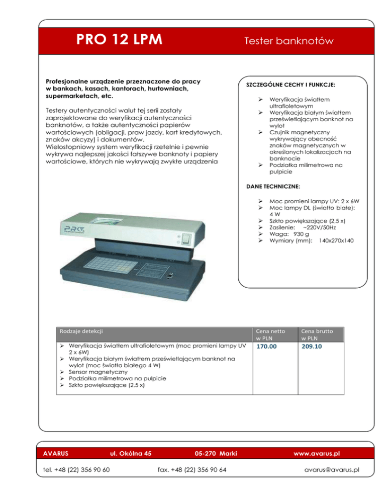 PRO 12 LPM Tester banknotów Profesjonalne urządzenie przeznaczone do pracy w bankach, kasach, kantorach, hurtowniach, supermarketach, etc. Testery autentyczności walut tej serii zostały zaprojektowane do weryfikacji autentyczności banknotów, a takŜe autentyczności papierów wartościowych (obligacji, praw jazdy, kart kredytowych, znaków akcyzy) i dokumentów. Wielostopniowy system weryfikacji rzetelnie i pewnie wykrywa najlepszej jakości fałszywe banknoty i papiery wartościowe, których nie wykrywają zwykłe urządzenia SZCZEGÓLNE CECHY I FUNKCJE: Weryfikacja światłem ultrafioletowym Weryfikacja białym światłem prześwietlającym banknot na wylot Czujnik magnetyczny wykrywający obecność znaków magnetycznych w określonych lokalizacjach na banknocie Podziałka milimetrowa na pulpicie DANE TECHNICZNE: Moc promieni lampy UV: 2 x 6W Moc lampy DL (światło białe): 4W Szkło powiększające (2,5 x) Zasilenie: ~220V/50Hz Waga: 930 g Wymiary (mm): 140x270x140 Rodzaje detekcji Cena netto w PLN Cena brutto w PLN Weryfikacja światłem ultrafioletowym (moc promieni lampy UV 2 x 6W) Weryfikacja białym światłem prześwietlającym banknot na wylot (moc światła białego 4 W) Sensor magnetyczny Podziałka milimetrowa na pulpicie Szkło powiększające (2,5 x) 170.00 209.10 AVARUS tel. +48 (22) 356 90 60 ul. Okólna 45 05-270 Marki fax. +48 (22) 356 90 64 www.avarus.pl [email protected]