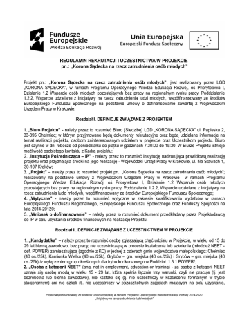 REGULAMIN REKRUTACJI I UCZESTNICTWA W PROJEKCIE pn.: „Korona Sądecka na rzecz zatrudnienia osób młodych” Projekt pn.: „Korona Sądecka na rzecz zatrudnienia osób młodych”, jest realizowany przez LGD „KORONA SĄDECKA”, w ramach Programu Operacyjnego Wiedza Edukacja Rozwój, oś Priorytetowa I, Działanie 1.2 Wsparcie osób młodych pozostających bez pracy na regionalnym rynku pracy, Poddziałanie 1.2.2, Wsparcie udzielane z Inicjatywy na rzecz zatrudnienia ludzi młodych, współfinansowany ze środków Europejskiego Funduszu Społecznego na podstawie umowy o dofinansowanie zawartej z Wojewódzkim Urzędem Pracy w Krakowie. Rozdział I. DEFINICJE ZWIĄZANE Z PROJEKTEM 1.„Biuro Projektu” - należy przez to rozumieć Biuro (Siedzibę) LGD „KORONA SĄDECKA” ul. Papieska 2, 33-395 Chełmiec; w którym przyjmowane będą dokumenty rekrutacyjne oraz będą udzielane informacje na temat realizacji projektu, osobom zainteresowanym udziałem w projekcie oraz Uczestnikom projektu. Biuro jest czynne w dni robocze od poniedziałku do piątku w godzinach 7.30:00 do 15:30. W Biurze Projektu istnieje możliwość osobistego kontaktu z Kadrą projektu; 2. „Instytucja Pośrednicząca – IP” - należy przez to rozumieć instytucję nadzorująca prawidłową realizację projektu oraz przyznająca środki na jego realizację - Wojewódzki Urząd Pracy w Krakowie, ul. Na Stawach 1, 30-107 Kraków; 3. „Projekt” – należy przez to rozumieć projekt pn.: „Korona Sądecka na rzecz zatrudniania osób młodych”; realizowany na podstawie umowy z Wojewódzkim Urzędem Pracy w Krakowie w ramach Programu Operacyjnego Wiedza Edukacja Rozwój, oś Priorytetowa I, Działanie 1.2 Wsparcie osób młodych pozostających bez pracy na regionalnym rynku pracy, Poddziałanie 1.2.2, Wsparcie udzielane z Inicjatywy na rzecz zatrudnienia ludzi młodych, współfinansowany ze środków Europejskiego Funduszu Społecznego; 4. „Wytyczne” - należy przez to rozumieć wytyczne w zakresie kwalifikowania wydatków w ramach Europejskiego Funduszu Regionalnego, Europejskiego Funduszu Społecznego oraz Funduszy Spójności na lata 2014-20120; 5. „Wniosek o dofinansowanie” – należy przez to rozumieć dokument przedkładany przez Projektodawcę do IP w celu uzyskania środków finansowych na realizację Projektu. Rozdział II. DEFINICJE ZWIĄZANE Z UCZESTNICTWEM W PROJEKCIE 1. „Kandydat/ka” – należy przez to rozumieć osobę zgłaszającą chęć udziału w Projekcie, w wieku od 15 do 29 lat bierną zawodowo, bez pracy, nie uczestniczącą w procesie kształcenia lub szkolenia (młodzież NEET def. POWER) zamieszkującą (zgodnie z KC) w jednej z czterech gmin województwa małopolskiego: Chełmiec (40 os./25k), Kamionka Wielka (40 os./25k), Grybów – gm. wiejska (40 os./25k) i Grybów – gm. miejska (40 os./25k) /z wyłączeniem grup określonych dla trybu konkursowego w Poddział. 1.3.1 POWER/; 2. „Osoba z kategorii NEET” (ang. not in employment, education or training) - za osobę z kategorii NEET uznaje się osobę młodą w wieku 15 - 29 lat, która spełnia łącznie trzy warunki, czyli nie pracuje (tj. jest bezrobotna lub bierna zawodowo), nie kształci się (tj. nie uczestniczy w kształceniu formalnym w trybie stacjonarnym) ani nie szkoli (tj. nie uczestniczy w pozaszkolnych zajęciach mających na celu uzyskanie, Projekt współfinansowany ze środków Unii Europejskiej w ramach Programu Operacyjnego Wiedza Edukacja Rozwój 2014-2020 „Inicjatywy na rzecz zatrudnienia ludzi młodych” uzupełnienie lub doskonalenie umiejętności i kwalifikacji zawodowych lub ogólnych, potrzebnych do wykonywania pracy. W procesie oceny czy dana osoba się nie szkoli, a co za tym idzie czy kwalifikuje się do kategorii NEET, weryfikuje się, czy brała ona udział w tego typu formie aktywizacji finansowanej ze środków publicznych w okresie ostatnich 4 tygodni). 3. „Uczestnik/czka projektu” - należy przez to rozumieć osobę zakwalifikowaną do udziału w projekcie zgodnie z zasadami określonymi w niniejszym Regulaminie, z którą Beneficjent podpisał Umowę, oświadczenia oraz deklarację uczestnictwa w projekcie; 4. „Osoba bierna zawodowo” - należy przez to rozumieć osobę, która w danej chwili (w momencie złożenia dokumentów rekrutacyjnych) nie tworzy zasobów siły roboczej (tzn. nie pracuje i nie jest bezrobotna – czyli nie jest zarejestrowana we właściwym dla miejsca zameldowania stałego lub czasowego w powiatowym urzędzie pracy); (UWAGA!!! ➢ osoby przebywające na urlopie wychowawczym - rozumianym jako nieobecność w pracy, spowodowaną opieką nad dzieckiem w okresie, który nie mieści się w ramach urlopu macierzyńskiego lub rodzicielskiego) są uznawane za osoby bierne zawodowo, chyba że są zarejestrowane już jako „osoby bezrobotne” (wówczas status bezrobotnego ma pierwszeństwo); ➢ osoby młode w wieku 15-29 lat, bez pracy, nie uczestniczące w kształceniu i szkoleniu, jednak jednocześnie zarejestrowane w KRUS jako „domownik" nie są uznawane za osoby bierne zawodowo; ➢ osoby prowadzące działalność na własny rachunek (w tym bezpłatnie pomagające osobie prowadzącej działalność członek rodziny), nie są uznawane za osoby bierne zawodowo; ➢ osoby objęte zatrudnieniem subsydiowanym nie są uznawane za osoby bierne zawodowo). 5. „Osoba w wieku 15-29 lat” – należy przez to rozumieć osobę, która na dzień składania formularza aplikacyjnego ukończyła 15 rok życia i jest przed ukończeniem 30 roku życia (czyli do dnia poprzedzającego 30 urodziny); 6. „Osoba nie uczącą się i nie szkoląca się” – należy przez to rozumieć osobę nie uczęszczającą na zajęcia w szkole lub na uczelni wyższej w trybie stacjonarnym, ani podczas ostatnich czterech tygodni nie biorącą udziału w szkoleniach mających na celu uzyskanie lub uzupełnienie umiejętności i kwalifikacji potrzebnych do wykonywania pracy, 