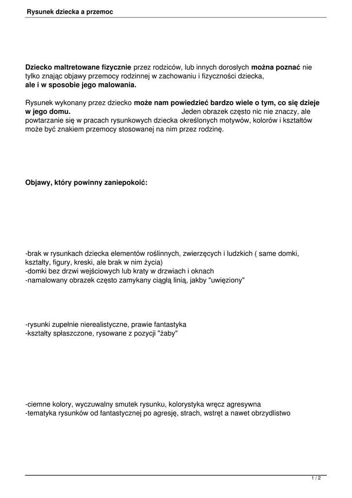 Rysunek dziecka a przemoc Dziecko maltretowane fizycznie przez rodziców, lub innych dorosłych można poznać nie tylko znając objawy przemocy rodzinnej w zachowaniu i fizyczności dziecka, ale i w sposobie jego malowania. Rysunek wykonany przez dziecko może nam powiedzieć bardzo wiele o tym, co się dzieje w jego domu. Jeden obrazek często nic nie znaczy, ale powtarzanie się w pracach rysunkowych dziecka określonych motywów, kolorów i kształtów może być znakiem przemocy stosowanej na nim przez rodzinę. Objawy, który powinny zaniepokoić: -brak w rysunkach dziecka elementów roślinnych, zwierzęcych i ludzkich ( same domki, kształty, figury, kreski, ale brak w nim życia) -domki bez drzwi wejściowych lub kraty w drzwiach i oknach -namalowany obrazek często zamykany ciągłą linią, jakby "uwięziony" -rysunki zupełnie nierealistyczne, prawie fantastyka -kształty spłaszczone, rysowane z pozycji "żaby" -ciemne kolory, wyczuwalny smutek rysunku, kolorystyka wręcz agresywna -tematyka rysunków od fantastycznej po agresję, strach, wstręt a nawet obrzydlistwo 1/2 Rysunek dziecka a przemoc Zwracajmy uwagę na to, co robią dzieci czasem dają nam proste, jasne znaki, których często ze strachu lub niepewności nie bierzemy poważnie. Nie traktujmy rysunku dziecka jako zła koniecznego i "pokazywania, jaki to ja jestem wredny". D ziecko nie musi być "wredne" .. dziecko może być bite. 2/2