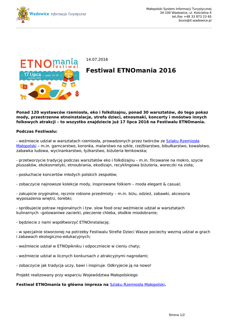 Małopolski System Informacji Turystycznej 34-100 Wadowice, ul. Kościelna 4 tel./fax +48 33 873 23 65 [email protected] 14.07.2016 Festiwal ETNOmania 2016 Ponad 120 wystawców rzemiosła, eko i folkdizajnu, ponad 30 warsztatów, do tego pokaz mody, przestrzenne etnoinstalacje, strefa dzieci, etnosmaki, koncerty i mnóstwo innych folkowych atrakcji – to wszystko znajdziecie już 17 lipca 2016 na Festiwalu ETNOmania. Podczas Festiwalu: - weźmiecie udział w warsztatach rzemiosła, prowadzonych przez twórców ze Szlaku Rzemiosła Małopolski – m.in. garncarstwo, koronka, malarstwo na szkle, rzeźbiarstwo, bibułkarstwo, kowalstwo, zabawka ludowa, wycinankarstwo, łyżkarstwo, biżuteria łemkowska; - przetworzycie tradycję podczas warsztatów eko i folkdizajnu – m.in. filcowanie na mokro, szycie pluszaków, ekokosmetyki, etnoubrania, ekodizajn, recyklingowa biżuteria, woreczki na zioła; - posłuchacie koncertów młodych polskich zespołów; - zobaczycie najnowsze kolekcje mody, inspirowane folkiem – moda elegant & casual; - zakupicie oryginalne, ręcznie robione przedmioty – m.in. biżu, odzież, zabawki, akcesoria wyposażenia wnętrz, torebki; - spróbujecie potraw regionalnych i tzw. slow food oraz weźmiecie udział w warsztatach kulinarnych –gotowaniwe zacierki, pieczenie chleba, słodkie miodobranie; - będziecie z nami współtworzyć ETNOinstalację; - w specjalnie stworzonej na potrzeby Festiwalu Strefie Dzieci Wasze pociechy wezmą udział w grach i zabawach ekologiczno-edukacyjnych; - weźmiecie udział w ETNOpikniku i odpoczniecie w cieniu chaty; - weźmiecie udział w licznych konkursach z atrakcyjnymi nagrodami; - zobaczycie jak tradycja uczy, bawi i inspiruje. Odkryjecie ją na nowo! Projekt realizowany przy wsparciu Województwa Małopolskiego Festiwal ETNOmania to główna impreza na Szlaku Rzemiosła Małopolski. Strona 1/2 Małopolski System Informacji Turystycznej 34-100 Wadowice, ul. Kościelna 4 tel./fax +48 33 873 23 65 [email protected] Skansen to nie tylko malowniczo rozciągający się krajobraz i szereg zabytkowych chałup, lecz także miejsce, w którym nauczycie się technik rzemieślniczych przy wtórze muzyki folkowej. Czym bawiły się dzieci w czasach, kiedy nie było jeszcze klocków Lego i lalek Barbie? Dlaczego chleb rośnie? Kim właściwie jest bednarz? Co można zrobić z filcu? Odpowiedzi na te i na wiele innych pytań znajdziecie, udając się na Festiwal ETNOmania! Zapraszamy na rodzinny weekend do Wygiełzowa! Więcej informacji: www.etnomania.pl Strona 2/2 Powered by TCPDF (www.tcpdf.org)