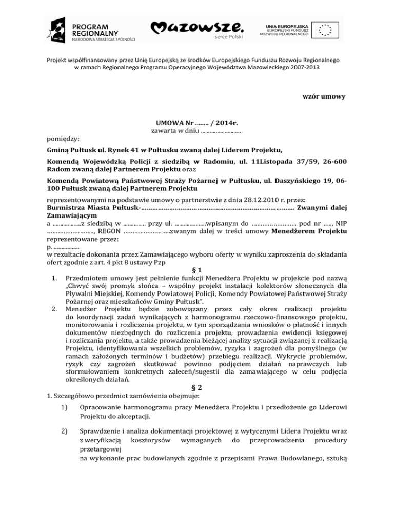 Projekt współfinansowany przez Unię Europejską ze środków Europejskiego Funduszu Rozwoju Regionalnego w ramach Regionalnego Programu Operacyjnego Województwa Mazowieckiego 2007-2013 wzór umowy UMOWA Nr ........ / 2014r. zawarta w dniu ............................ pomiędzy: Gminą Pułtusk ul. Rynek 41 w Pułtusku zwaną dalej Liderem Projektu, Komendą Wojewódzką Policji z siedzibą w Radomiu, ul. 11Listopada 37/59, 26-600 Radom zwaną dalej Partnerem Projektu oraz Komendą Powiatową Państwowej Straży Pożarnej w Pułtusku, ul. Daszyńskiego 19, 06100 Pułtusk zwaną dalej Partnerem Projektu reprezentowanymi na podstawie umowy o partnerstwie z dnia 28.12.2010 r. przez: Burmistrza Miasta Pułtusk-………………………………………………………………………. Zwanymi dalej Zamawiającym a ...................z siedzibą w ............... przy ul. .....................wpisanym do ……………………. pod nr ….., NIP …………………….., REGON ……………………..zwanym dalej w treści umowy Menedżerem Projektu reprezentowane przez: p. ................. w rezultacie dokonania przez Zamawiającego wyboru oferty w wyniku zaproszenia do składania ofert zgodnie z art. 4 pkt 8 ustawy Pzp §1 1. Przedmiotem umowy jest pełnienie funkcji Menedżera Projektu w projekcie pod nazwą „Chwyć swój promyk słońca – wspólny projekt instalacji kolektorów słonecznych dla Pływalni Miejskiej, Komendy Powiatowej Policji, Komendy Powiatowej Państwowej Straży Pożarnej oraz mieszkańców Gminy Pułtusk”. 2. Menedżer Projektu będzie zobowiązany przez cały okres realizacji projektu do koordynacji zadań wynikających z harmonogramu rzeczowo-finansowego projektu, monitorowania i rozliczenia projektu, w tym sporządzania wniosków o płatność i innych dokumentów niezbędnych do rozliczenia projektu, prowadzenia ewidencji księgowej i rozliczania projektu, a także prowadzenia bieżącej analizy sytuacji związanej z realizacją Projektu, identyfikowania wszelkich problemów, ryzyka i zagrożeń dla pomyślnego (w ramach założonych terminów i budżetów) przebiegu realizacji. Wykrycie problemów, ryzyk czy zagrożeń skutkować powinno podjęciem działań naprawczych lub sformułowaniem konkretnych zaleceń/sugestii dla zamawiającego w celu podjęcia określonych działań. §2 1. Szczegółowo przedmiot zamówienia obejmuje: 1) Opracowanie harmonogramu pracy Menedżera Projektu i przedłożenie go Liderowi Projektu do akceptacji. 2) Sprawdzenie i analiza dokumentacji projektowej z wytycznymi Lidera Projektu wraz z weryfikacją kosztorysów wymaganych do przeprowadzenia procedury przetargowej na wykonanie prac budowlanych zgodnie z przepisami Prawa Budowlanego, sztuką Projekt współfinansowany przez Unię Europejską ze środków Europejskiego Funduszu Rozwoju Regionalnego w ramach Regionalnego Programu Operacyjnego Województwa Mazowieckiego 2007-2013 budowlaną i innymi uzgodnieniami i dokumentami mającymi wpływ na realizację zamówienia. 3) Opracowanie szczegółowego harmonogramu finansowo – rzeczowego inwestycji w oparciu o złożony przez Zamawiającego wniosek o dofinansowanie Projektu. 4) Opracowywanie dokumentacji przetargowych związanych z realizacją projektu i uczestnictwo w procedurach zamówień publicznych. W ramach projektu przewidziane jest udzielenie zamówienia na roboty budowlane obejmujące wybudowanie 533 instalacji solarnych oraz zamówienie publiczne na usługę nadzoru autorskiego. 5) Powiadomienie organu nadzoru budowlanego o terminie rozpoczęcia robót – o ile zaistnieje taka konieczność. 6) Zarządzanie realizacją postanowień umów zawartych z instytucjami i osobami zewnętrznymi przez okres trwania projektu w zakresie robót budowlanych i usług. 7) Opisywanie faktur, rachunków i innych dokumentów wystawianych Liderowi i Partnerom, tak by zachować całkowitą zgodność z wymogami Instytucji Wdrażającej, z innymi obowiązującymi w tym zakresie przepisami prawa oraz wymaganiami Zamawiającego. 8) Prowadzenie nadzoru i monitoringu rzeczowo-finansowego projektu w celu jego prawidłowego rozliczenia, w sposób wskazany przez Instytucję Wdrażającą w umowie o dofinansowanie, w szczególności gromadzenie niezbędnej dokumentacji rozliczeniowej oraz sporządzanie wniosków o zaliczki i refundacje. 9) Współpraca z instytucjami zewnętrznymi adekwatnymi dla każdego etapu projektu. 10) Przekazanie placów budowy przy udziale Lidera Projektu, inspektora nadzoru oraz wykonawcy robót budowlanych. 11) Informowanie Lidera Projektu o wszelkich ustaleniach dotyczących przebiegu i zaawansowania robót budowlanych i usług oraz informacje o istotnych zdarzeniach, jakie miały miejsce na terenie budowy, podjętych działaniach oraz o ewentualnych zagrożeniach mogących mieć wpływ na terminy realizacji robót, dostaw i terminowym przekazaniem obiektu do użytkowania. 12) Organizacja i prowadzenie narad koordynacyjno-technicznych i innych, wg potrzeb, nie rzadziej niż dwa razy w miesiącu oraz sporządzanie protokołów z tych narad. 13) Realizacja wszelkich niezbędnych czynności w uzgodnieniu z Liderem Projektu w celu zapewnienia pełnej i terminowej realizacji projektu. Projekt współfinansowany przez Unię Europejską ze środków Europejskiego Funduszu Rozwoju Regionalnego w ramach Regionalnego Programu Operacyjnego Województwa Mazowieckiego 2007-2013 14) Udział w protokolarnym odbiorze robót budowlanych wraz z dostarczeniem Zamawiającemu wszystkich niezbędnych atestów i certyfikatów od inspektora nadzoru. 15) Przygotowanie i przeprowadzenie odbioru końcowego inwestycji, przy udziale przedstawicieli Lidera Projektu (przyszłych użytkowników). 16) Weryfikacja wszelkich niezbędnych danych wartościowych, ilościowych opracowanych przez inspektora nadzoru, nadzoru autorskiego i ich kompletowanie w postaci dokumentów niezbędnych dla końcowego rozliczenia projektu. 17) Realizacja i