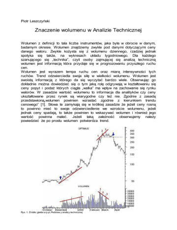 Piotr Leszczyński Znaczenie wolumenu w Analizie Technicznej Wolumen z definicji to tala liczba instrumentów, jaka była w obrocie w danym, badamym okresie. Wolumen znajdziemy zwykle pod danymi dotyczącymi ceny danego waloru. Zwykle kożysta się z wolumenu dziennego, rzadziej jednak spotyka się także, na wykresach układu tygodniowego. Dla każdego szanującego się „technika”, czyli osoby zajmującej się analizą techniczną wolumen jest informacją która przydaje się w prognozowaniu przyszłego ruchu cen. Wolumen jest wyrazem tempa ruchu cen oraz miarą intensywności tych ruchów. Trend odzwierciedla swoja siłę w wielkości wolumenu. Wolumen jest swoistą informacją z którego da się wyczytać bardzo wiele. Obserwując go dokładnie można dowiedzieć się o tym jaką rolę odgrywają w kształtowaniu się ceny popyt i podaż których ciągła „walka” ma wpływ na zachowanie się rynku walorów. W zasadzie wartość wolumenu to informacja dla analityków czy ceny ukształtowane przez rynek są wiarygodne czy też nie. Zgodnie z zasadą przedstawioną„wolumen powinien wzrastać zgodnie z kierunkiem trendu cenowego” [1]. Słowa te zamykają się w krótkiej zasadzie że jeżeli ceny rosną to powinno mieć to swoje odzwierciedlenie we wzroście wolumenu, jeżeli jednak ceny spadają, to także powinien to wskazywać wolumen i również jego wartość powinna maleć. Jeżeli taką zależność obserwujemy należy powiedzieć że po prostu wolumen potwierdza trend. Rys. 1. Źródło: giełda.w p.pl, Podstaw y analizy technicznej Jak widać na wykresie świecowym w okresie końca rok 1999 kiedy ceny zwyżkowały, odzwierciedlone to było także w wolumenie. Taki obraz rynku zdawał się potwierdzać wyniki cenowe w skutek czego cena walorów Optimusa rosła. Natomiast już w okolicach kwietnia 200 roku mimo wzrostu ceny okazało się iż wartość wolumenu nei potrwierziła informacji iż wzrost cenowy powien być długotrwały. Taka wartośc wolumenu sprzeciwiała się trendowi ceny. Jak widać wolumen potwierdził iż wzrost był krótkotrwały i tuz po niż nastąpił znaczący spadek. Takie zachowanie ceny i wolumenu, lub wskaźnika analizy technicznej, nosi nazwę dywergencji. Dywergencja następuje w momencie gdy cena zachowuje się inaczej niż wskazywałby na to wolumen. Tu takie zachowanie zasygnalizowało malejące zainteresowanie kupowaniem walorów spółki. Dzięki wolumenowi można określić czy przypuszczenia dotyczące formacji się sprawdzą. „Jedna z pierwszych oznak szczytu głowy i ramion wystąpiła w chwili, gdy ceny osiągnęły nowe szczyty przy kształtowaniu się głowy w warunkach niskiego wolumenu, ale przy wysokich obrotach podczas zejścia do szyi.” Podążając za tym autorem należy jeszcze zaznaczyć ze niski wolumen powinien towarzyszyć formacjom podwójnego szczytu i potrójnego szczytu. Dla formacji zapowiadającej kontynuację trendu – np. trójkąt, powinien być zaobserwowany spadek wolumenu następujący stopniowo. Gdy obserwowany jest trned spadkowy wolumen powinien pokazywać wzrost przy spadkach i spadek przy szczytach. W tabeli przedstawiono zachowania się wolumenu w zależności od formacji kształtującej się na rynku. Formacja Wolumen Głowa i ramiona Najwyższy wolumen obrotów powinien utrzymywać się gdy „tworzy się” lewe ramię/. Kolejny wzrost aktywności następuje gdy ukształtowuje się szczyt głowy, niemniej zasadą jest że wolumen powinein być niższy od wolumenu dla lewego ramienia. Najnizszy wolumen powinien zostac zaobserwowany przy tworzeniu ramienia porawego. Wzrost aktywności przy przebijaniu linii szyi. Podwójny szczyt W tej formacji wzrost wolumenu obrotów powinien towarzyszyć ukształtowywaniu się dwóch szczytów, zgodnie z zasadą jednak że obroty na drugim są nizsze. Minimum cenowe powinno być odzwierciedlone w wyraźnym spadku obrotów. Spodek Wolumen zachowuje się w tej formacji bardzo chcarakterystycznie. Powinien przyjmować kształz zliżony do wygladu samej formacji Trójkąt prostokątny W trakcie tworzenia się formacji wolumen powinien zmniejszać się. Dynamiczny wzrost obrotów powinien towarzyszyć wybiciu się z formacji, bez względu na kierunek tego wybicia. Diament W połowie tej formacji wolumen obrotów maleje, ale aktywność wzrasta nieznacznie gdy wybijane są lokalne szczyty, oraz maleje przy wybijaniu lokalnych minimów. Od połowy i w dalszym ciągu kształtowania formacji wielkośc wolumenu powina rosnąć nieznacznie,a najwieksza powinna być przy wybijaniu z formacji. Wolumen który powinien utrzymywać sie na wyskim poziomie od momentu “wejścia” w formację powinien maleć. Jego wzrost powinien zostac zaobserwowany przy wybijaniu z tej formacji. Flagi Tab.1. Zachow anie w olumenu w zależności od formacji. Żródło: bossa.pl Wolumen powinien zawsze podążać zgodnie z dominujacym aktualnie na rynku trendem cenowym. Aby dobrze zapoznać się z analizą wolumenu warto zapoznać się z wskaźnikiem OBV. Jest to wskaźnik stworzony przez Josepha Granville’a który widoczny jest na wykresie cenowym jako linia – krzywa. Jest on analizowany w celu ostrzeżenia przed zmiana trendu cenowego, lub przy potwierdzeniu trendu. OBV czyli „on balance volume” to wskaźnik przedstawiający skumulowana wartośc wolumenu na przestrzeni czasu. Tworzy się go nadając mu wartość „plus” lub „minus” w zależności od wartości kursu zamknięcia na danej sesji. Jego konstrukcja opiera się na założeniu iż sesjom wzrostowym towarzyszy akumulacja, sesjom spadkowym dystrybucja. Spadek akumulacji, czyli zmniejszenie obrotów na zwyżce jest często sygnałem wyczerpywania potencjału wzrostowego. Podobnie rzecz się ma dla tendencji zniżkowej.”[2] Wskaźnik ten zwany jest wskaźnikiem kumulacyjnym, z racji swej konstrukcji – otóż przy sesjach wsrostowych woumen zostaje dodawany, natomiast dla sesji spadkowych odejmuje się wolumen. Zmod