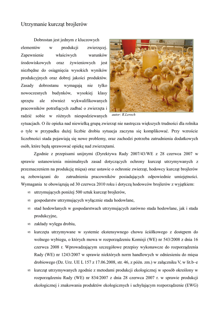 Utrzymanie kurcząt brojlerów Dobrostan jest jednym z kluczowych elementów w produkcji Zapewnienie właściwych środowiskowych oraz zwierzęcej. warunków żywieniowych jest niezbędne do osiągnięcia wysokich wyników produkcyjnych oraz dobrej jakości produktów. Zasady dobrostanu wymagają nowoczesnych budynków, sprzętu również ale nie tylko wysokiej klasy wykwalifikowanych pracowników potrafiących zadbać o zwierzęta i radzić sobie w różnych niespodziewanych autor: R.Leroch sytuacjach. O ile opieka nad niewielką grupą zwierząt nie nastręcza większych trudności dla rolnika o tyle w przypadku dużej liczbie drobiu sytuacja zaczyna się komplikować. Przy wzroście liczebności stada pojawiają się nowe problemy, oraz zachodzi potrzeba zatrudnienia dodatkowych osób, które będą sprawować opiekę nad zwierzętami. Zgodnie z przepisami unijnymi (Dyrektywa Rady 2007/43/WE z 28 czerwca 2007 w sprawie ustanowienia minimalnych zasad dotyczących ochrony kurcząt utrzymywanych z przeznaczeniem na produkcję mięsa) oraz ustawie o ochronie zwierząt, hodowcy kurcząt brojlerów są zobowiązani do zatrudnienia pracowników posiadających odpowiednie umiejętności. Wymagania te obowiązują od 30 czerwca 2010 roku i dotyczą hodowców brojlerów z wyjątkiem: • utrzymujących poniżej 500 sztuk kurcząt brojlerów, • gospodarstw utrzymujących wyłącznie stada hodowlane, • stad hodowlanych w gospodarstwach utrzymujących zarówno stada hodowlane, jak i stada produkcyjne, • zakłady wylęgu drobiu, • kurczęta utrzymywane w systemie ekstensywnego chowu ściółkowego z dostępem do wolnego wybiegu, o których mowa w rozporządzeniu Komisji (WE) nr 543/2008 z dnia 16 czerwca 2008 r. Wprowadzającym szczegółowe przepisy wykonawcze do rozporządzenia Rady (WE) nr 1243/2007 w sprawie niektórych norm handlowych w odniesieniu do mięsa drobiowego (Dz. Urz. UE L 157 z 17.06.2008, str. 46, z późn. zm.) w załączniku V, w lit.b–e • kurcząt utrzymywanych zgodnie z metodami produkcji ekologicznej w sposób określony w rozporządzeniu Rady (WE) nr 834/2007 z dnia 28 czerwca 2007 r. w sprawie produkcji ekologicznej i znakowania produktów ekologicznych i uchylającym rozporządzenie (EWG) nr 2092/91 (Dz. Urz. UE L 189 z 20.07.2007, str. 1) oraz w przepisach Unii Europejskiej wydanych w trybie tego rozporządzenia. W pozostałych kurnikach osoba sprawująca opiekę nad brojlerami powinna posiadać predyspozycje psychologiczno fizycznych do pracy ze zwierzętami oraz posiadać odpowiednie kwalifikacje w postaci doświadczenia zawodowego, wykształcenie lub szkolenia. Do pierwszych dwóch grup należą osoby, które: • sprawowały opiekę nad kurczętami brojlerami nieprzerwanie od dnia 30 czerwca 2009 r. do dnia 30 czerwca 2010 r., • ukończyły szkolenie w zakresie warunków utrzymywania zwierząt gospodarskich, które zostało przeprowadzone w okresie od dnia 1 maja 2004 r. do dnia 30 czerwca 2010 r., i mają zaświadczenie potwierdzające ukończenie takiego szkolenia, • ukończyły studia wyższe na kierunku weterynaria, zootechnika lub rolnictwo • posiadają co najmniej pięcioletni staż pracy na stanowiskach związanych z chowem lub hodowla kurcząt brojlerów oraz posiadają tytuł zawodowy technika w zawodach związanych z chowem i hodowla zwierząt, określonych w przepisach w sprawie klasyfikacji zawodów szkolnictwa zawodowego Trzecią grupę stanowią, pracownicy którzy odbyli szkolenie w trakcie którego zdobyli podstawową, a zarazem niezbędną wiedzę związaną z opieką, transportem i sytuacjami niebezpiecznymi jakie mogą wystąpić w trakcie chowu. W skład podstawowych zagadnień jakie musi poznać kursant należą: • wymagania i sposób postępowania przy utrzymywaniu kurcząt brojlerów, • fizjologia zwierząt, ich potrzeby w zakresie karmienia, pojenia oraz zachowanie zwierząt i pojęcie stresu, • praktyczne aspekty obchodzenia się z kurczętami brojlerami podczas ich wyłapywania, załadunku i transportu, • zasady opieki nad kurczętami brojlerami oraz procedury uśmiercania lub uboju w nagłych przypadkach, • profilaktyczne środki bezpieczeństwem biologicznego; Oczywiście zakres szkolenia może zostać rozszerzony o tematy, które według szkolących lub szkolonych są ważne lub niezbędne w pracy. Ważnym elementem są też zajęcia praktyczne w kurnikach. Mimo że nie są wymagane przez ustawodawcę warto aby jednostka w trakcie szkolenia wprowadziła ten element, gdyż pozwala one sprawdzić zdobytą wiedzę w praktyce oraz poznać bliżej zasady pracy w kurnikach. Po zakończeniu szkolenia kursant otrzymuje zaświadczenie poświadczające zdobycie wiedzy w zakresie opieki nad drobiem pozwalające na pracę przy jego chowie. Wymagania dotyczące kurników Oprócz wymagań dotyczących osób sprawujących opiekę nad brojlerami od 30 czerwca obowiązują nowe przepisy w zakresie obsady oraz wymogów bytowych kurcząt. Główna zmiana dotyczy obsady w kurnikach, która zmalała do 33, 39 lub 42 kg na 1 m 2 w zależności od wyposażenia kurnika oraz zezwolenia wydanego przez lekarza weterynarii. Nowe przepisy określiły także wymaganie dotyczące warunków bytowych gwarantujących dobrostan stada. We wszystkich kurnikach, zapewnia się brojlerom: • urządzenia do pojenia są tak ustawione i utrzymywane, aby maksymalnie zmniejszyć ryzyko wylewania wody, • dostęp do karmy - kurczęta powinny mieć stały dostęp do paszy, albo być karmione w pewnych odstępach czasu, nie mogą być pozbawione paszy dłużej niż 12 godzin przed przewidywaną godziną uboju, • stały dostęp do ściółki, która ma być sucha i krucha, • wentylacje i ogrzewanie, które muszą działać w sposób zapewniający uniknięcie przegrzania oraz utrzymywać prawidłową wilgotność w pomieszczeniu, • minimalizować poziom hałasu, • oświetlenie - intensywność co najmniej 20 luksów przy włączonym oświetleniu, mier