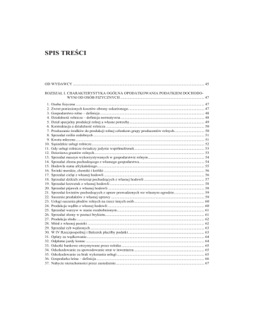 SPIS TREĝCI OD WYDAWCY ....................................................................................................................................... 45 ROZDZAà I. CHARAKTERYSTYKA OGÓLNA OPODATKOWANIA PODATKIEM DOCHODOWYM OD OSÓB FIZYCZNYCH ...................................................................................... 47 1. 2. 3. 4. 5. 6. 7. 8. 9. 10. 11. 12. 13. 14. 15. 16. 17. 18. 19. 20. 21. 22. 23. 24. 25. 26. 27. 28. 29. 30. 31. 32. 33. 34. 35. 36. 37. Osoba fizyczna .................................................................................................................................... 47 Zwrot poniesionych kosztów obrony oskarĪonego .............................................................................. 47 Gospodarstwo rolne – definicja ........................................................................................................... 48 DziaáalnoĞü rolnicza – definicja normatywna ...................................................................................... 48 Dziaá specjalny produkcji rolnej a wáasne potrzeby............................................................................. 49 Kontraktacja a dziaáalnoĞü rolnicza ..................................................................................................... 50 Przekazanie Ğrodków do produkcji rolnej czáonkom grupy producentów rolnych............................... 50 SprzedaĪ roĞlin ozdobnych .................................................................................................................. 51 Kwota mleczna .................................................................................................................................... 51 Sąsiedzkie usáugi rolnicze.................................................................................................................... 52 Gdy usáugi rolnicze Ğwiadczy jedynie wspóámaáĪonek........................................................................ 53 DzierĪawa gruntów rolnych................................................................................................................. 53 SprzedaĪ maszyn wykorzystywanych w gospodarstwie rolnym.......................................................... 54 SprzedaĪ záomu pochodzącego z wáasnego gospodarstwa................................................................... 54 Hodowla suma afrykaĔskiego.............................................................................................................. 55 ĝwinki morskie, chomiki i króliki ....................................................................................................... 56 SprzedaĪ cieląt z wáasnej hodowli ....................................................................................................... 56 SprzedaĪ dzikich zwierząt pochodzących z wáasnej hodowli .............................................................. 57 SprzedaĪ krewetek z wáasnej hodowli ................................................................................................. 58 SprzedaĪ pijawek z wáasnej hodowli ................................................................................................... 58 SprzedaĪ kwiatów pochodzących z upraw prowadzonych we wáasnym ogrodzie............................... 59 Suszenie produktów z wáasnej uprawy ................................................................................................ 59 Usáugi suszenia páodów rolnych na rzecz innych osób ........................................................................ 60 Produkcja wĊdlin z wáasnej hodowli ................................................................................................... 60 SprzedaĪ warzyw w stanie rozdrobnionym.......................................................................................... 61 SprzedaĪ sáomy w postaci brykietu...................................................................................................... 61 Produkcja sáodu ................................................................................................................................... 62 Miód z wáasnej pasieki ........................................................................................................................ 62 SprzedaĪ ryb wĊdzonych ..................................................................................................................... 63 W IV Rzeczpospolitej i Balcerek páaciáby podatki .............................................................................. 63 Opáaty za wĊdkowanie......................................................................................................................... 64 Odpáatne jazdy konne .......................................................................................................................... 64 Odsetki bankowe otrzymywane przez rolnika ..................................................................................... 65 Odszkodowanie za spowodowanie strat w inwentarzu ........................................................................ 65 Odszkodowanie za brak wykonania usáugi .......................................................................................... 65 Gospodarka leĞna – definicja ............................................................................................................... 66 Nabycie nieruchomoĞci przez zasiedzenie........................................................................................... 67 6 38. 39. 40. 41. 42. 43. 44. 45. 46. 47. 48. 49. 50. 51. 52. 53. 54. 55. 56. 57. 58. 59. 60. 61. Spis treĞci Wypáacone po zmaráym pracowniku wynagrodzenie .......................................................................... 67 Nabycie przez spadkobierców roszczenia o spáatĊ równowartoĞci umorzonych udziaáów.................. 68 Odsetki z tytuáu nieterminowej spáaty w ramach dziaáu spadku ..............