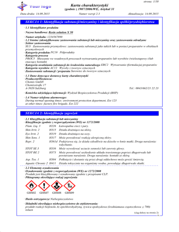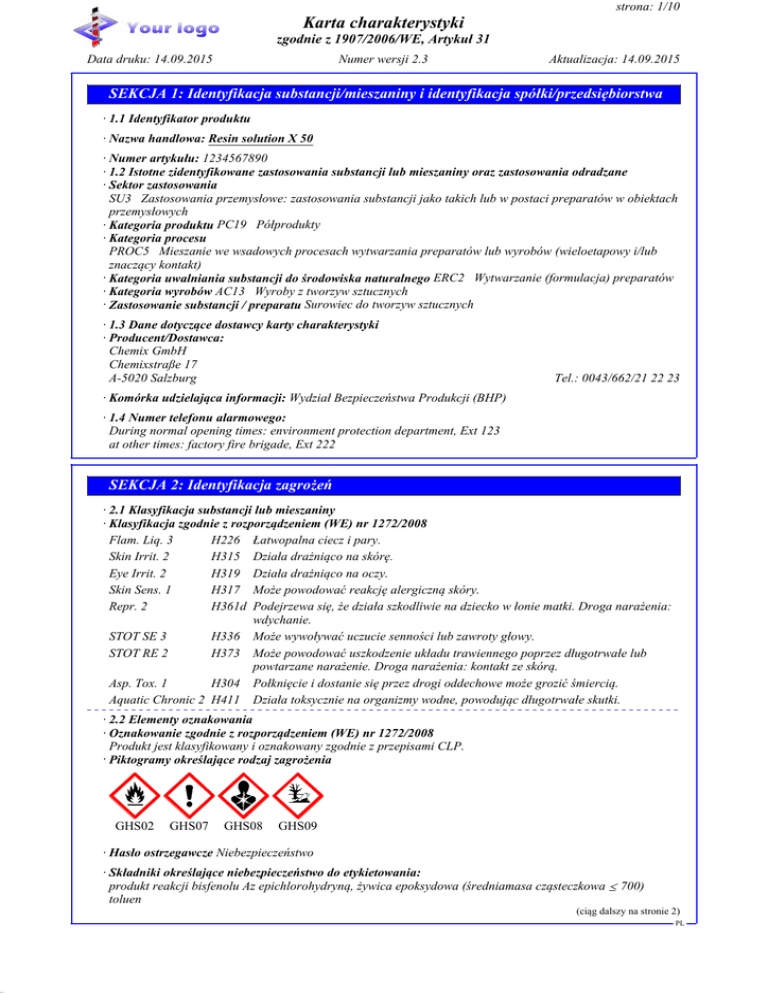 41.2.4 strona: 1/10 Karta charakterystyki zgodnie z 1907/2006/WE, Artykuł 31 Data druku: 14.09.2015 Numer wersji 2.3 Aktualizacja: 14.09.2015 SEKCJA 1: Identyfikacja substancji/mieszaniny i identyfikacja spółki/przedsiębiorstwa · 1.1 Identyfikator produktu · Nazwa handlowa: Resin solution X 50 · Numer artykułu: 1234567890 · 1.2 Istotne zidentyfikowane zastosowania substancji lub mieszaniny oraz zastosowania odradzane · Sektor zastosowania SU3 Zastosowania przemysłowe: zastosowania substancji jako takich lub w postaci preparatów w obiektach przemysłowych · Kategoria produktu PC19 Półprodukty · Kategoria procesu PROC5 Mieszanie we wsadowych procesach wytwarzania preparatów lub wyrobów (wieloetapowy i/lub znaczący kontakt) · Kategoria uwalniania substancji do środowiska naturalnego ERC2 Wytwarzanie (formulacja) preparatów · Kategoria wyrobów AC13 Wyroby z tworzyw sztucznych · Zastosowanie substancji / preparatu Surowiec do tworzyw sztucznych · 1.3 Dane dotyczące dostawcy karty charakterystyki · Producent/Dostawca: Chemix GmbH Chemixstraße 17 A-5020 Salzburg Tel.: 0043/662/21 22 23 · Komórka udzielająca informacji: Wydział Bezpieczeństwa Produkcji (BHP) · 1.4 Numer telefonu alarmowego: During normal opening times: environment protection department, Ext 123 at other times: factory fire brigade, Ext 222 SEKCJA 2: Identyfikacja zagrożeń · 2.1 Klasyfikacja substancji lub mieszaniny · Klasyfikacja zgodnie z rozporządzeniem (WE) nr 1272/2008 Flam. Liq. 3 H226 Łatwopalna ciecz i pary. Skin Irrit. 2 H315 Działa drażniąco na skórę. Eye Irrit. 2 H319 Działa drażniąco na oczy. Skin Sens. 1 H317 Może powodować reakcję alergiczną skóry. Repr. 2 H361d Podejrzewa się, że działa szkodliwie na dziecko w łonie matki. Droga narażenia: wdychanie. STOT SE 3 H336 Może wywoływać uczucie senności lub zawroty głowy. STOT RE 2 H373 Może powodować uszkodzenie układu trawiennego poprzez długotrwałe lub powtarzane narażenie. Droga narażenia: kontakt ze skórą. Asp. Tox. 1 H304 Połknięcie i dostanie się przez drogi oddechowe może grozić śmiercią. Aquatic Chronic 2 H411 Działa toksycznie na organizmy wodne, powodując długotrwałe skutki. · 2.2 Elementy oznakowania · Oznakowanie zgodnie z rozporządzeniem (WE) nr 1272/2008 Produkt jest klasyfikowany i oznakowany zgodnie z przepisami CLP. · Piktogramy określające rodzaj zagrożenia GHS02 GHS07 GHS08 GHS09 · Hasło ostrzegawcze Niebezpieczeństwo · Składniki określające niebezpieczeństwo do etykietowania: produkt reakcji bisfenolu Az epichlorohydryną, żywica epoksydowa (średniamasa cząsteczkowa 700) toluen (ciąg dalszy na stronie 2) PL 41.2.4 strona: 2/10 Karta charakterystyki zgodnie z 1907/2006/WE, Artykuł 31 Data druku: 14.09.2015 Numer wersji 2.3 Aktualizacja: 14.09.2015 Nazwa handlowa: Resin solution X 50 (ciąg dalszy od strony 1) octan etylu butan-2-ol · Zwroty wskazujące rodzaj zagrożenia H226 Łatwopalna ciecz i pary. H315 Działa drażniąco na skórę. H319 Działa drażniąco na oczy. H317 Może powodować reakcję alergiczną skóry. H361d Podejrzewa się, że działa szkodliwie na dziecko w łonie matki. Droga narażenia: wdychanie. H336 Może wywoływać uczucie senności lub zawroty głowy. H373 Może powodować uszkodzenie układu trawiennego poprzez długotrwałe lub powtarzane narażenie. Droga narażenia: kontakt ze skórą. H304 Połknięcie i dostanie się przez drogi oddechowe może grozić śmiercią. H411 Działa toksycznie na organizmy wodne, powodując długotrwałe skutki. · Zwroty wskazujące środki ostrożności P101 W razie konieczności zasięgnięcia porady lekarza należy pokazać pojemnik lub etykietę. P102 Chronić przed dziećmi. P103 Przed użyciem przeczytać etykietę. P210 Przechowywać z dala od źródeł ciepła, gorących powierzchni, iskrzenia, otwartego ognia i innych źródeł zapłonu. Palenie wzbronione. P301+P310 W PRZYPADKU POŁKNIĘCIA: Natychmiast skontaktować się z OŚRODKIEM ZATRUĆ/lekarzem. P303+P361+P353 W PRZYPADKU KONTATKU ZE SKÓRĄ (lub z włosami): Natychmiast zdjąć całą zanieczyszczoną odzież. Spłukać skórę pod strumieniem wody/prysznicem. P305+P351+P338 W PRZYPADKU DOSTANIA SIĘ DO OCZU: Ostrożnie płukać wodą przez kilka minut. Wyjąć soczewki kontaktowe, jeżeli są i można je łatwo usunąć. Nadal płukać. P405 Przechowywać pod zamknięciem. P501 Zawartość / pojemnik usuwać zgodnie z przepisami miejscowymi / regionalnymi / narodowymi / międzynarodowymi. · Dane dodatkowe: EUH205 Zawiera składniki epoksydowe. Może powodować wystąpienie reakcji alergicznej. · Oznakowanie opakowań, których zawartość nie przekracza 125 ml · Piktogramy określające rodzaj zagrożenia GHS02 GHS07 GHS08 GHS09 · Hasło ostrzegawcze Niebezpieczeństwo · Składniki określające niebezpieczeństwo do etykietowania: produkt reakcji bisfenolu Az epichlorohydryną, żywica epoksydowa (średniamasa cząsteczkowa 700) toluen octan etylu butan-2-ol · Zwroty wskazujące rodzaj zagrożenia H317 Może powodować reakcję alergiczną skóry. H361d Podejrzewa się, że działa szkodliwie na dziecko w łonie matki. Droga narażenia: wdychanie. H304 Połknięcie i dostanie się przez drogi oddechowe może grozić śmiercią. · Zwroty wskazujące środki ostrożności P101 W razie konieczności zasięgnięcia porady lekarza należy pokazać pojemnik lub etykietę. P102 Chronić przed dziećmi. P103 Przed użyciem przeczytać etykietę. P261 Unikać wdychania pyłu/dymu/gazu/mgły/par/rozpylonej cieczy. P280 Stosować rękawice ochronne/odzież ochronną/ochronę oczu/ochronę twarzy. P301+P310 W PRZYPADKU POŁKNIĘCIA: Natychmiast skontaktować się z OŚRODKIEM ZATRUĆ/ lekarzem. P321 Zastosować określone leczenie (patrz na etykiecie). (ciąg dalszy na stronie 3) PL 41.2.4 strona: 3/10 Karta charakterystyki zgodnie z 1907/2006/WE, Artykuł 31 Data druku: 14.09.2015 Numer wersji 2.3 Aktualizacja: 14.09.2