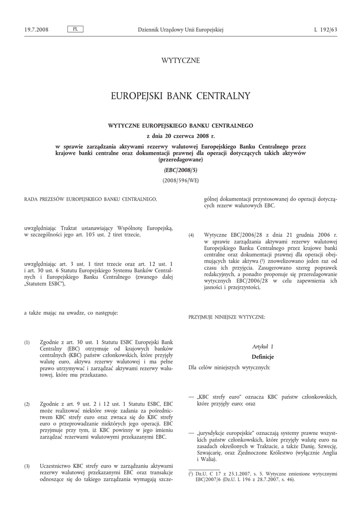 19.7.2008 PL Dziennik Urzędowy Unii Europejskiej L 192/63 WYTYCZNE EUROPEJSKI BANK CENTRALNY WYTYCZNE EUROPEJSKIEGO BANKU CENTRALNEGO z dnia 20 czerwca 2008 r. w sprawie zarządzania aktywami rezerwy walutowej Europejskiego Banku Centralnego przez krajowe banki centralne oraz dokumentacji prawnej dla operacji dotyczących takich aktywów (przeredagowane) (EBC/2008/5) (2008/596/WE) gólnej dokumentacji przystosowanej do operacji dotyczą cych rezerw walutowych EBC. RADA PREZESÓW EUROPEJSKIEGO BANKU CENTRALNEGO, uwzględniając Traktat ustanawiający Wspólnotę Europejską, w szczególności jego art. 105 ust. 2 tiret trzecie, uwzględniając art. 3 ust. 1 tiret trzecie oraz art. 12 ust. 1 i art. 30 ust. 6 Statutu Europejskiego Systemu Banków Central nych i Europejskiego Banku Centralnego (zwanego dalej „Statutem ESBC”), a także mając na uwadze, co następuje: (1) (2) (3) Zgodnie z art. 30 ust. 1 Statutu ESBC Europejski Bank Centralny (EBC) otrzymuje od krajowych banków centralnych (KBC) państw członkowskich, które przyjęły walutę euro, aktywa rezerwy walutowej i ma pełne prawo utrzymywać i zarządzać aktywami rezerwy walu towej, które mu przekazano. Zgodnie z art. 9 ust. 2 i 12 ust. 1 Statutu ESBC, EBC może realizować niektóre swoje zadania za pośrednic twem KBC strefy euro oraz zwraca się do KBC strefy euro o przeprowadzanie niektórych jego operacji. EBC przyjmuje przy tym, iż KBC powinny w jego imieniu zarządzać rezerwami walutowymi przekazanymi EBC. Uczestnictwo KBC strefy euro w zarządzaniu aktywami rezerwy walutowej przekazanymi EBC oraz transakcje odnoszące się do takiego zarządzania wymagają szcze (4) Wytyczne EBC/2006/28 z dnia 21 grudnia 2006 r. w sprawie zarządzania aktywami rezerwy walutowej Europejskiego Banku Centralnego przez krajowe banki centralne oraz dokumentacji prawnej dla operacji obej mujących takie aktywa (1) znowelizowano jeden raz od czasu ich przyjęcia. Zasugerowano szereg poprawek redakcyjnych, a ponadto proponuje się przeredagowanie wytycznych EBC/2006/28 w celu zapewnienia ich jasności i przejrzystości, PRZYJMUJE NINIEJSZE WYTYCZNE: Artykuł 1 Definicje Dla celów niniejszych wytycznych: — „KBC strefy euro” oznacza KBC państw członkowskich, które przyjęły euro; oraz — „jurysdykcje europejskie” oznaczają systemy prawne wszyst kich państw członkowskich, które przyjęły walutę euro na zasadach określonych w Traktacie, a także Danię, Szwecję, Szwajcarię, oraz Zjednoczone Królestwo (wyłącznie Anglia i Walia). (1) Dz.U. C 17 z 25.1.2007, s. 5. Wytyczne zmienione wytycznymi EBC/2007/6 (Dz.U. L 196 z 28.7.2007, s. 46). L 192/64 PL Dziennik Urzędowy Unii Europejskiej Artykuł 2 Zarządzanie aktywami rezerwy walutowej przez KBC strefy euro działające w imieniu EBC 1. Każdy KBC strefy euro ma prawo uczestniczyć w operacyjnym zarządzaniu aktywami rezerwy walutowej prze kazanymi na rzecz EBC. KBC strefy euro może zrezygnować z tego rodzaju zarządzania bądź też dokonać połączenia dzia łalności w tym zakresie z jednym lub więcej spośród KBC strefy euro. W przypadku gdy KBC strefy euro rezygnuje z operacyjnego zarządzania aktywami rezerwy walutowej EBC, inny KBC strefy euro zarządza aktywami, które podlegałyby zarządzaniu przez taki rezygnujący KBC strefy euro. 2. KBC strefy euro uczestniczące w zarządzaniu przeprowa dzają operacje dotyczące aktywów rezerwy walutowej EBC jako podmioty działające w imieniu EBC. Domniemywa się, iż rozpoczynając prowadzenie takich operacji, KBC strefy euro potwierdza swój status jako podmiotu działającego w imieniu EBC. W odniesieniu do wszelkich operacji, które KBC strefy euro prowadzą w imieniu EBC, takie KBC strefy euro ujawniają wszystkim odpowiednim stronom, w chwili przystępowania do każdej z takich operacji, status EBC jako podmiotu, w którego imieniu działają, zarówno przez wskazanie jego nazwy, jak i numeru rachunku lub kodu identyfikującego rachunek. 3. Przeprowadzając w imieniu EBC operacje dotyczące aktywów rezerwy walutowej EBC, każdy KBC strefy euro podporządkuje interesom EBC swoje własne interesy, jak również interesy innych podmiotów, na rzecz których przepro wadza operacje. 4. Na wniosek kontrahenta EBC o przedstawienie dowodu posiadanego umocowania do przeprowadzania w imieniu EBC operacji dotyczących aktywów rezerwy walutowej EBC, KBC strefy euro przedstawia takiemu kontrahentowi dowód otrzy manego pełnomocnictwa do działania w imieniu EBC. 19.7.2008 z państw europejskich lub na podstawie prawa Irlandii Północnej lub Szkocji; b) umowa ramowa Stowarzyszenia Rynków Obligacji dla trans akcji odwracalnych (wersja z września 1996 r.) (Bond Market Association Master Repurchase Agreement (September 1996 version)) stosowana jest w odniesieniu do operacji ze stro nami, które zostały utworzone na podstawie prawa federal nego lub stanowego Stanów Zjednoczonych Ameryki; oraz c) globalna umowa ramowa TBMA/ISMA dla transakcji odwra calnych (wersja 2000) (TBMA/ISMA Global Master Repur chase Agrement (2000 version)) stosowana jest w odniesieniu do operacji ze stronami, które zostały utwo rzone na podstawie prawa jakiegokolwiek państwa innego niż wskazane w literach a) lub b) powyżej. 3. Operacje dokonywane w zakresie instrumentów pochod nych poza rynkiem regulowanym, dotyczące aktywów rezerwy walutowej EBC, są dokumentowane zgodnie z następującymi umowami standardowymi: a) umowa ramowa FBE dla transakcji finansowych (wersja 2004) stosowana jest w odniesieniu do operacji ze stronami, które zostały utworzone na podstawie prawa jednego z państw europejskich; b) umowa ramowa Międzynarodowego Stowarzyszenia Dealerów Spawowych ISDA w wersji z 1992 r. (wielowalu towa – transgraniczna, wariant podlegający prawu stanu Nowy Jork) (1992 International Swaps and Derivatives Asso ciation Master Agreement (Multi-currency – crossborder, New York law version)) stosowana jest w odniesieniu do oper