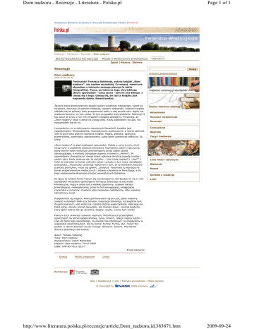 Dom nadzoru - Recenzje - Literatura - Polska.pl Dziedzictwo Narodowe Literatura Przyroda Page 1 of 1 Wiadomości Wideo Poland.pl Polska.pl > Literatura > Recenzje > Dom nadzoru Skarby Dziedzictwa Narodowego Miasta w Dokumencie Archiwalnym Epoki Pisarze Literatura Galerie Recenzje Szukaj szukanie zaawansowane Dom nadzoru 2009-07-20, 08:00 Twórczości Tomasza Sobieraja, autora książki „Dom nadzoru", nie znałem wcześniej. Co więcej, nawet nie słyszałem o istnieniu samego pisarza (a także fotografika). Teraz, po lekturze tego niewielkiego zbioru opowiadań - rzecz jasna - jest mi ona bliższa. I cieszę się z tego. Cieszę się, bo też ta książka jest naprawdę dobra. Nawet bardzo. Zawsze przed przeczytaniem książki autora wcześniej nieznanego, nawet ze słyszenia, odczuwa się pewien niepokój, czasami ciekawość, czasami książkę odkłada się na później, żeby przypomnieć sobie o niej po pół roku. Nigdy nie wiadomo bowiem, co nas czeka. W tym przypadku było podobnie. Sobieraj? A kto zacz? W życiu o nim nie słyszałem (książkę dostałem). Przyznaję, że „Dom nadzoru" leżał i czekał na swoją kolej. Kiedy zabierałem się zań, nie nastawiałem się na nic. I przyszło to, co w odkrywaniu nieznanych literackich światów jest najpiękniejsze. Niespodzianka, nieoczekiwane, zaskoczenie, a nawet zachwyt. Jest to po prostu pięknie napisana książka. Mądra, głęboka, spokojna, przemyślana, zamknięta, dopracowana. Lubię takie czytelnicze odkrycia. Oj, lubię! „Dom nadzoru" to pięć niedługich opowiadań. Każde o czym innym, choć utrzymane w podobnej estetyce literackiej. Poznajemy zatem mężczyznę, który wbrew sobie wykonuje znienawidzony przez siebie zawód obrzezującego, a wolność odnajduje dopiero w śmierci („Mohel"). W opowiadaniu „Panoptikum" dwoje dzieci odkrywa okrutną prawdę o sobie i swoim ojcu, kiedy okazuje się, że są tylko... (nie mogę napisać!). „Azyl"" z kolei to impresja na temat wolności sztuki i artysty w być może nieodległej przyszłości. „Wycieczka" przeraża realizmem i tym, że to literackie, fikcyjne przecież proroctwo, może się spełnić. „Instytut" natomiast to wariacja na temat eksperymentów medycznych i zabawy człowieka w Pana Boga, a do tego niesamowita ekspresja przeżyć wewnętrznych bohatera. Co łączy te krótkie formy? Czym się wyróżniają? Co tak bardzo mi się w nich spodobało? Wszystkie opowiadania Tomasza Sobieraja są niezwykle klimatyczne, mają w sobie coś z wielkiej tajemnicy, czasami bardzo przerażającej, niebezpiecznej, przez to też pociągającej, wciągającej czytelnika w mroczny, chwilami albo niezwykle realistyczny, albo zupełnie odrealniony świat. Aktualności Nowości wydawnicze Recenzje Czasopisma Nagrody Targi i Festiwale Lista lektur szkolnych Biblioteki Muzea Kontakt z redakcją Linki Przepełnione są wizjami, które porównywane są do tych, jakie możemy znaleźć w dziełach Kafki czy Schulza. Inspiracja Sobieraja, szczególnie tym drugim pisarzem, jest widoczna i bardzo dobrze wykorzystana. Uderzają nie tylko wizje, obrazy, klimat opowieści, ale również język - niemal poetycki, cichy (jeśli można tak go określić), bogaty, czysty, a przy tym wartki. Pełno w tych utworach szalenie mądrych, filozoficznych przemyśleń, spostrzeżeń na temat społeczeństwa, życia, śmierci, relacji między ludźmi czyli de facto tego wszystkiego, co zawsze nas interesuje i co znajdujemy w większości dzieł literackich. Ale ta forma! Forma! Forma, styl i treść! Nie jestem w stanie doczepić się do niczego. Straszne. Dziwne. Prawdziwe. Szczere gratulacje dla autora! Autor: Tomasz Sobieraj Tytuł: Dom nadzoru Wydawnictwo: Adam Marszałek Miejsce i data wydania: Toruń 2009 ISBN: 978-83-7611-223-7 Ernest Kacperski Drukuj Wyślij znajomym Linkuj Partnerzy: Idea | Współpraca | Listy | Polityka prywatności | Mapa serwisu © Copyright by 2009, Domeny http://www.literatura.polska.pl/recenzje/article,Dom_nadzoru,id,383871.htm 2009-09-24
