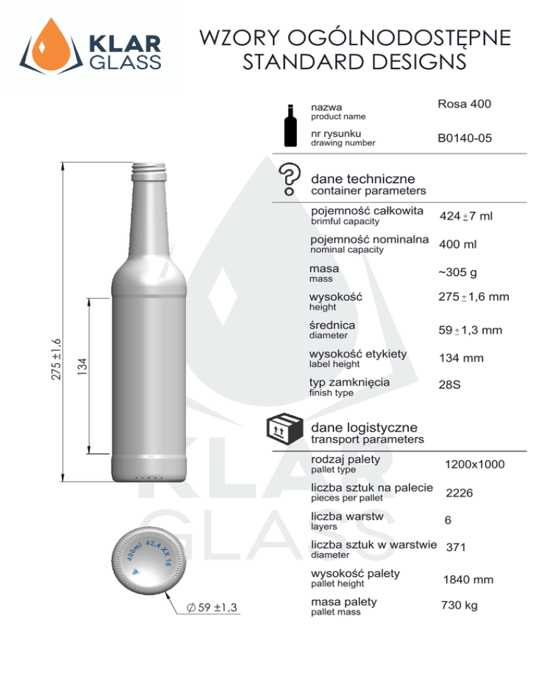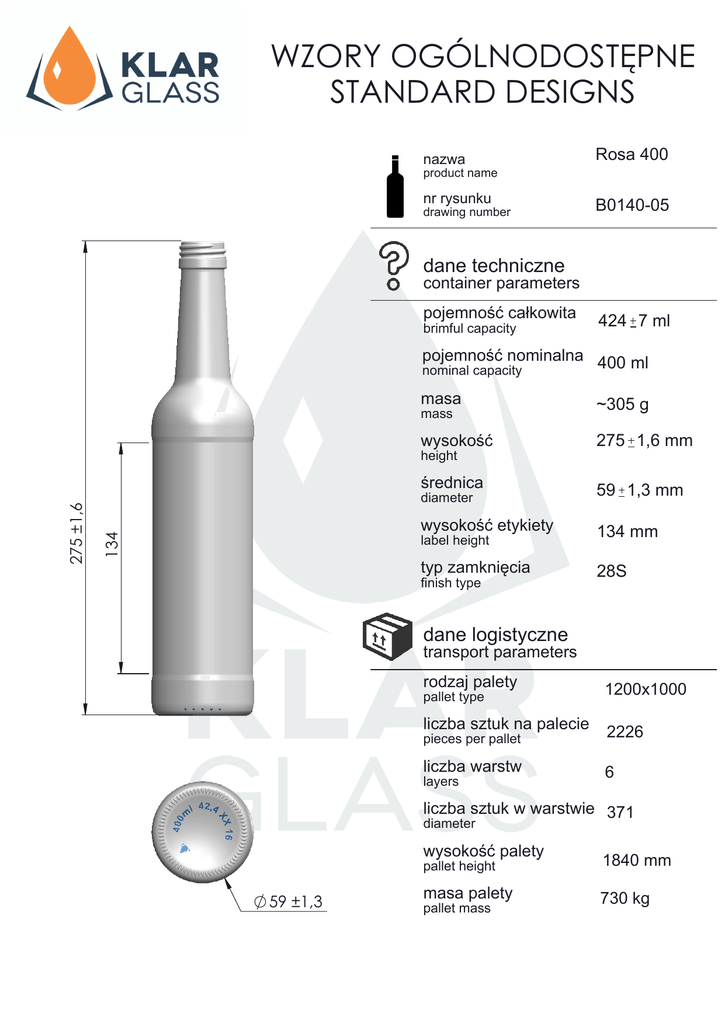 WZORY OGÓLNODOSTĘPNE STANDARD DESIGNS nazwa Rosa 400 nr rysunku B0140-05 product name drawing number dane techniczne container parameters pojemność całkowita brimful capacity 424 7 ml pojemność nominalna 400 ml nominal capacity masa ~305 g wysokość 275 1,6 mm średnica 59 1,3 mm wysokość etykiety label height 134 mm typ zamknięcia 28S mass diameter 134 275 ±1,6 height finish type dane logistyczne transport parameters rodzaj palety 1200x1000 liczba sztuk na palecie pieces per pallet 2226 liczba warstw 6 pallet type layers liczba sztuk w warstwie 371 diameter wysokość palety 59 ±1,3 pallet height 1840 mm masa palety 730 kg pallet mass