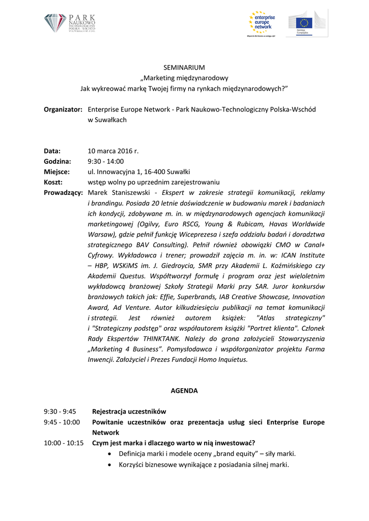SEMINARIUM „Marketing międzynarodowy Jak wykreować markę Twojej firmy na rynkach międzynarodowych?” Organizator: Enterprise Europe Network - Park Naukowo-Technologiczny Polska-Wschód w Suwałkach Data: Godzina: Miejsce: Koszt: Prowadzący: 10 marca 2016 r. 9:30 - 14:00 ul. Innowacyjna 1, 16-400 Suwałki wstęp wolny po uprzednim zarejestrowaniu Marek Staniszewski - Ekspert w zakresie strategii komunikacji, reklamy i brandingu. Posiada 20 letnie doświadczenie w budowaniu marek i badaniach ich kondycji, zdobywane m. in. w międzynarodowych agencjach komunikacji marketingowej (Ogilvy, Euro RSCG, Young & Rubicam, Havas Worldwide Warsaw), gdzie pełnił funkcję Wiceprezesa i szefa oddziału badań i doradztwa strategicznego BAV Consulting). Pełnił również obowiązki CMO w Canal+ Cyfrowy. Wykładowca i trener; prowadził zajęcia m. in. w: ICAN Institute – HBP, WSKiMS im. J. Giedroycia, SMR przy Akademii L. Koźmińskiego czy Akademii Questus. Współtworzył formułę i program oraz jest wieloletnim wykładowcą branżowej Szkoły Strategii Marki przy SAR. Juror konkursów branżowych takich jak: Effie, Superbrands, IAB Creative Showcase, Innovation Award, Ad Venture. Autor kilkudziesięciu publikacji na temat komunikacji i strategii. Jest również autorem książek: "Atlas strategiczny" i "Strategiczny podstęp" oraz współautorem książki "Portret klienta". Członek Rady Ekspertów THINKTANK. Należy do grona założycieli Stowarzyszenia „Marketing 4 Business”. Pomysłodawca i współorganizator projektu Farma Inwencji. Założyciel i Prezes Fundacji Homo Inquietus. AGENDA 9:30 - 9:45 9:45 - 10:00 10:00 - 10:15 Rejestracja uczestników Powitanie uczestników oraz prezentacja usług sieci Enterprise Europe Network Czym jest marka i dlaczego warto w nią inwestować? Definicja marki i modele oceny „brand equity” – siły marki. Korzyści biznesowe wynikające z posiadania silnej marki. 10:15 - 10:45 10:45 - 11:30 11:30 - 11:50 11:50 - 12:05 12:05 - 12:50 12:50 - 13:10 13:10 - 13:30 13:30 - 14:00 14:00 Ekspansja marki na rynki zagraniczne – strategiczne uwarunkowania Na jaki rynek wchodzimy i dlaczego? Ocena potencjału rynków zagranicznych. Analiza spodziewanych możliwości, barier i zagrożeń. Uwarunkowania gospodarcze nowego rynku. Kontekst kulturowy (wartości, zwyczaje, przekonania, wzorce zachowań konsumenckich). Kontekst prawny i administracyjny. W jaki sposób chcemy konkurować za granicą? Strategiczne decyzje związane z wyborem rynków docelowych: W jaki sposób będziemy penetrować rynek (eksport pośredni czy bezpośredni)? Co będzie naszym kluczowym produktem/usługą? Jaki jest profil naszej grupy docelowej? Z kim będziemy konkurować? Jakie będą koszty wejścia na nowy rynek? Przerwa kawowa Opracowanie założeń marketingowych dla nowych rynków: Pozycjonowanie (definicja i rodzaje strategii pozycjonowania). Strategia cenowa (cena w odniesieniu do wizerunku marki). Kanały dystrybucji (online, offline). Polityka promocyjna i reklama. Opracowanie założeń marketingowych dla nowych rynków: Określenie celów, KPIs i budżetu działań komunikacyjnych Harmonogram działań, plan mediowy i alokacja środków Charakterystyka touchpoints i kanałów dotarcia, w tym rola Digital, social media i kontent marketingu. Brief kreatywny – co to jest i dlaczego będzie niezbędne? m.in.: Co to jest consumer insight, key message, reason to belive, brand tonality? Przerwa kawowa Czy warto podkreślać polski charakter produktu/marki? Lokalne czy globalne? Kwestia nazw, symboli i wzorców komunikacyjnych. Rola narodowości marki i miejsca pochodzenia produktów. Stereotypy kulturowe – oczekiwania i uprzedzenia wobec marek. Jak zarządzać organizacją marketingową na rynkach zagranicznych? Struktura działu marketingu, role i funkcje menadżerów. Określenie i dobór podwykonawców zewnętrznych. Zakończenie seminarium