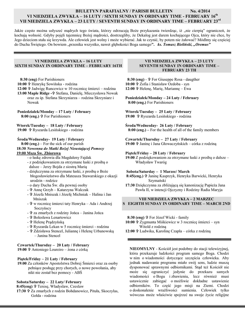 BIULETYN PARAFIALNY / PARISH BULLETIN No. 4/2014 VI NIEDZIELA ZWYKŁA – 16 LUTY / SIXTH SUNDAY IN ORDINARY TIME - FEBRUARY 16th VII NIEDZIELA ZWYKŁA – 23 LUTY / SEVENTH SUNDAY IN ORDINARY TIME – FEBRUARY 23rd Jakże często można usłyszeć mądrych tego świata, którzy odrzucają Boże przykazania twierdząc, iż „nie cierpią” ograniczeń, że kochają wolność. Gdyby pojęli tajemnicę Bożej mądrości, dostrzegliby, że Dekalog jest darem kochającego Ojca, który nie chce, by Jego dzieciom stała się krzywda. Ale człowiek jest wolny i może wybierać. Jak to czynić, by potem nie żałować? Módlmy się częściej do Ducha Świętego. On bowiem „przenika wszystko, nawet głębokości Boga samego”. ks. Tomasz Bieliński, „Oremus” VI NIEDZIELA ZWYKŁA – 16 LUTY SIXTH SUNDAY IN ORDINARY TIME – FEBRUARY 16TH VII NIEDZIELA ZWYKŁA – 23 LUTY SEVENTH SUNDAY IN ORDINARY TIME – FEBRUARY 23 TH 8:30 (eng) For Parishioners 10:00 Henrykę Sowińska - rodzina 12:00 Jadwigę Runcewicz w 10 rocznicę śmierci – rodzina 13:00 Maple Ridge - Stefana, Danielę, Mieczysława Nowak oraz za śp. Stefana Skrzyniarza – rodzina Skrzyniarz i Nowak 8:30 (eng) - For Giuseppe Rosa - daugther 10:00 Zofia i Stanisław Ozdoba - syn 12:00 Helenę, Marię, Mariannę – Ewa Poniedziałek/Monday – 17 Luty / February 8:00 (eng.) For Parishioners Wtorek/Tuesday – 25 Luty / February 19:00 Ryszarda Lesińskiego - rodzina Wtorek/Tuesday – 18 Luty / February 19:00 Ryszarda Lesińskiego - rodzina Środa/Wednesday- 26 Luty / February 8:00 (eng.) – For the health of all of the family members Środa/Wednesday- 19 Luty / February 8:00 (eng.) – For the sick of our parish 18:30 Nowenna do Matki Bożej Nieustającej Pomocy 19:00 Msza Św. Zbiorowa - o łaskę zdrowia dla Magdaleny Fajdak - z podziękowaniem za otrzymane łaski z prośbą o dalsze – Jerzy Bojda z siostrą Marią - dziękczynna za otrzymane łaski, z prośbą o Boże błogosławieństwo dla Mateusza Stawarskiego z okazji urodzin - rodzice - o dary Ducha Św. dla pewnej osoby - Annę Grzyb – Katarzyna Walczak - Józefa Mniszak i Józefę Michniak – Halina i Jan Mniszak - w rocznicę śmierci taty Henryka – Ada i Andrzej Soczyńscy - za zmarłych z rodziny Jońca – Janina Jońca - Bolesława Lenartowicz - Helenę Prądzyńską - Ryszarda Lekan w 5 rocznicę śmierci - rodzina - Zdzisława Stencel, Juliannę i Helenę Urbanowską – Janina Stencel Czwartek/Thursday – 27 Luty / February 19:00 Janinę i Jana Głowaczyńskich – córka z rodziną Czwartek/Thursday – 20 Luty / February 19:00 Antoniego Loureiro – żona z córką Piątek/Friday – 21 Luty / February 19:00 Za członków Apostolstwa Dobrej Śmierci oraz za osoby pełniące posługę przy chorych, o nowe powołania, aby nikt nie został bez pomocy - ABŚ Sobota/Saturday – 22 Luty/ February 8:45(eng) Teresę, Wladyslaw, Czeslaw 17:30 Za zmarłych z rodzin Bohdanowicz, Pituła, Skoczylas, Gołda - rodzina Poniedziałek/Monday – 24 Luty / February 8:00 (eng.) For Parishioners Piątek/Friday – 28 Luty / February 19:00 Z podziękowaniem za otrzymane łaski z prośbą o dalsze – Władysław Twaróg Sobota/Saturday – 1 Marzec/ March 8:45(eng.) Janinę Kasprzyk, Henryka Barwicki, Henryka Szymański 17:30 Dziękczynna za zbliżającą się kanonizację Papieża Jana Pawła II, w intencji Ojczyzny i Rodziny Radia Maryja VIII NIEDZIELA ZWYKŁA – 2 MARZEC S EIGHTH SUNDAY IN ORDINARY TIME – MARCH 2ND 8:30 (eng) For Józef Wicki - family 10:00 Zygmunta Miśkiewicz w 3 rocznicę śmierci – syn Witold z rodziną 12:00 Ludwika, Karolinę Czapla – córka z rodziną NIEOMYLNY - Kościół jest podobny do stacji telewizyjnej, która przekazuje ludzkości program samego Boga. Chodzi w nim o wiadomości dotyczące szczęścia człowieka. Aby jednak nadawanie programu miało swój sens, ludzie muszą dysponować sprawnymi odbiornikami. Stąd też Kościół nie może się ograniczyć jedynie do przekazu samych wiadomości o Bogu i zbawieniu, lecz również musi ustawicznie zabiegać o możliwie dokładne ustawienie odbiorników. To część jego misji na Ziemi. Chodzi o doskonalenie wrażliwości sumienia. Człowiek tylko wówczas może właściwie spojrzeć na swoje życie religijne i moralne, jeśli ma dobrze ustawione sumienie. Doskonalenie zaś wrażliwości sumienia dokonuje się przez obraz kontrolny, na którym są podane Boże przykazania ujęte w dekalog. Jeśli człowiek dobrze rozumie sens poszczególnych przykazań i sens ich całości, wówczas ideał życia, który nadaje telewizyjna stacja przekazująca Boże Objawienie jest piękny. Jeśli jednak nie rozumie dekalogu, obraz Bożego ideału życia jawi się nie tylko bez kolorów, ale zupełnie zdeformowany, jak w krzywym zwierciadle. Kościół jest zobowiązany do tego, by program był idealnie czysty, bez żadnych domieszek. Ma przekazywać Prawdę objawioną, zawartą w Piśmie Świętym i Tradycji. Nie może jej zniekształcać w swym studio. Nie może podawać ludzkich interpretacji, tylko samą czystą prawdę przekazaną przez Boga. W tym celu otrzymał specjalny dar – nieomylność. OGŁOSZENIA DUSZPASTERSKIE ODPUST PARAFIALNY – W niedzielę 2 Marca w naszej wspólnocie parafialnej przeżywać będziemy Odpust Parafialny ku czci Świętego Kazimierza. Niech nasz Patron wstawia się za nami wypraszając potrzebne łaski naszym Rodzinom i całej Wspólnocie . Święty Kazimierzu módl się za nami KANDYDACI DO BIERZMOWANIA – Zapraszamy wszystkich kandydatów, którzy przygotowują się do przyjęcia Sakramentu Bierzmowania - wraz z Rodzicami - na uroczystą Mszę Św. 16 Marca o godz. 12:00. Podczas Eucharystii Kandydaci zostaną przedstawieni Wspólnocie i otrzymają poświęcone Krzyżyki – symbol naszego Zbawienia. Otoczmy wszystkich kandydatów naszą gorliwą modlitwą. SAKRAMENT BIERZMOWANIA – 6 Kwietnia podczas Mszy Św. o godz. 12:00. SAKRAMENT PIERWSZEJ KOMUNII