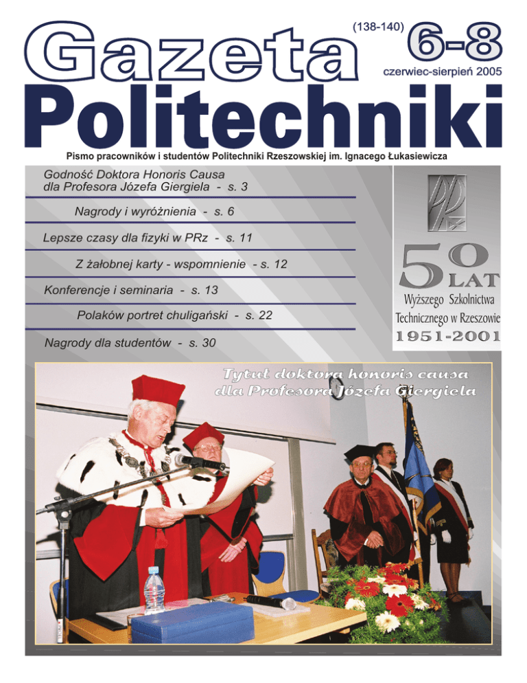 Gazeta (138-140) 6-8 czerwiec-sierpieñ 2005 Politechniki Pismo pracowników i studentów Politechniki Rzeszowskiej im. Ignacego £ukasiewicza Godnoœæ Doktora Honoris Causa dla Profesora Józefa Giergiela - s. 3 Nagrody i wyró¿nienia - s. 6 Lepsze czasy dla fizyki w PRz - s. 11 Z ¿a³obnej karty - wspomnienie - s. 12 Konferencje i seminaria - s. 13 Polaków portret chuligañski - s. 22 Nagrody dla studentów - s. 30 5 0 lat Wy¿szego Szkolnictwa Technicznego w Rzeszowie 1951-2001 2 Dyplom dla Doktora Honoris Causa Profesora Józefa Giergiela. Od lewej: promotor prof. H. Kopecki, dr hc prof. J. Giergiel. W d³ugiej kolejce do z³o¿enia ¿yczeñ. GAZETA POLITECHNIKI Uroczystoœæ odby³a siê w sali P-2. Na antresoli "Po³oniny". Pami¹tkowe zdjêcie z Senatu PRz. Kilka zdañ Doktora Honorowego dla Radia VIA. Fot. M. Misiakiewicz , Nr 6-8(138-140)–CZERWIEC-SIERPIEN 2005 3 Godnoœæ Doktora Honoris dla Profesora Józefa Giergiela W dniu 2 czerwca 2005 r. wypromowany zosta³ kolejny doktor honoris causa Politechniki Rzeszowskiej. Tym razem honor ten przypad³ prof. zw. dr. hab. in¿. Józefowi Giergielowi z Katedry Mechaniki Stosowanej i Robotyki na Wydziale Budowy Maszyn i Lotnictwa naszej uczelni. Dzia³alnoœæ naukowo-badawcza Profesora zwi¹zana jest z zagadnieniami mechaniki stosowanej oraz robotyki i mechatroniki. Poprzednio prof. J. Giergiel by³ d³ugoletnim pracownikiem naukowo-dydaktycznym Akademii Górniczo-Hutniczej im. Stanis³awa Staszica w Krakowie. Z inicjatyw¹ nadania Profesorowi Józefowi Giergielowi tytu³u doktora honoris causa wyst¹pi³a Rada Wydzia³u Budowy Maszyn i Lotnictwa, a dziekan Wydzia³u prof. dr hab. in¿. Marek Orkisz przedstawi³ wniosek w tej sprawie na posiedzeniu Senatu 21 paŸdziernika 2004 r. Równoczeœnie Senat PRz zwróci³ siê z proœb¹ do senatów Akademii Górniczo-Hutniczej w Krakowie, Politechniki Szczeciñskiej i Politechniki Œl¹skiej o wyra¿enie opinii w tej kwestii. W imieniu Senatu AGH opiniê tê opracowa³ prof. dr hab. in¿. Ryszard Tadeusiewicz, dla Senatu Politechniki Szczeciñskiej prof. dr hab. in¿. Krzysztof Marchelek, a dla Senatu Politechniki Œl¹skiej prof. dr hab. in¿. Eugeniusz Œwitoñski – poinformowa³ prorektor ds. nauki prof. dr hab. in¿. Leonard Ziemiañski. W nastêpstwie podjêtego postêpowania Senat Politechniki Rzeszowskiej w dniu 31 marca 2005 r. podj¹³ uchwa³ê o nadaniu tytu³u doktora honoris causa Profesorowi Józefowi Giergielowi, powierzaj¹c jednoczeœnie zaszczytne obowi¹zki promotora prof. dr. hab. in¿. Henrykowi Kopeckiemu. Argumenty maj¹ce wp³yw na podjêcie postêpowania zarówno przez Radê Wydzia³u Budowy Maszyn i Lotnictwa, jak i Senat PRz wymienione zosta³y w laudacji wyg³oszonej przez Promotora doktoratu. Profesor Józef Giergiel przez d³ugie lata swej pracy zawodowej wspó³pracowa³ z Politechnik¹ Rzeszowsk¹. Wœród wielu Jego wychowanków po- kaŸna dziœ liczba legitymuje siê stopniem doktora habilitowanego lub tytu³em profesora. S¹ wœród nich tak¿e pracownicy naszej uczelni. Uroczystoœæ nadania Mu tytu³u i godnoœci doktora honoris causa zgromadzi³a wielu znamienitych goœci, a wœród nich przedstawicieli polskich uczelni z rektorem Politechniki Szczeciñskiej – prof. Mieczys³awem Wysieckim na czele. W uroczystoœci nie zabrak³o przedstawicieli w³adz wojewódzkich i miejskich, reprezentowanych przez dr. hab. in¿. Jana Burka – Wicemarsza³ka Województwa Podkarpackiego oraz Marka Koberskiego – Wiceprezydenta Miasta Rzeszowa, a tak¿e przedstawicieli s³u¿b mundurowych i wielu innych miejscowych instytucji. Na zakoñczenie wszyscy uczestnicy spotkania mieli okazjê wys³uchaæ niebywale interesuj¹cego wyk³adu Pana Profesora Józefa Giergiela pt. „Historia podboju kosmosu”. Marta Olejnik Laudacja prof. Henryka Kopeckiego promotora doktoratu honoris causa profesora Józefa Giergiela Jego Magnificencjo, Wysoki Senacie, Czcigodny Doktorze Honorowy, Szanowni Pañstwo, w poczuciu spe³niania zaszczytnego obowi¹zku, jaki spoczywa na osobie promotora w procedurze nadawania tytu³u i godnoœci doktora honoris causa, mam wielki zaszczyt i honor zaprezen- towaæ Pañstwu wybitnego polskiego uczonego i organizatora nauki, wspania³ego nauczyciela i wychowawcê wielu pokoleñ naukowców i in¿ynierów, profesora Politechniki Rzeszowskiej JÓZEFA GIERGIELA. Profesor zwyczajny, doktor habilitowany in¿ynier Józef Giergiel urodzi³ siê 3 stycznia 1931 r. w Krakowie. Egzamin maturalny zda³ z wyró¿nieniem w Liceum Elektrotechnicznym w Kra- kowie w 1950 r., uzyskuj¹c dyplom technika mechanika. Po ukoñczeniu szko³y œredniej otrzyma³ obowi¹zuj¹cy naówczas nakaz pracy w Centralnym Biurze Projektów Maszyn Elektrycznych w Katowicach. Wiedziony intuicj¹, ukoñczy³ roczny wy¿szy techniczny kurs pedagogiczny. Zapewne nie przypuszcza³ wówczas, jak dalece zwi¹¿e w przysz³oœci swoje losy z zawodem pedagoga. 4 W 1952 r., maj¹c za sob¹ dwa lata pracy, 21-letni Józef Giergiel podj¹³ studia w Akademii Górniczo-Hutniczej, na Wydziale Mechaniczno-Elektrycznym. Ukoñczy³ je w 1957 r., uzyskuj¹c stopieñ magistra in¿yniera mechanizacji hutnictwa. Bezpoœrednio po ukoñczeniu studiów podj¹³ pracê zawodow¹ konstruktora w Biurze Projektów Maszyn Drogowych „MADRO” w Krakowie, a rok póŸniej zosta³ zatrudniony na tym samym stanowisku w Zak³adach Cynkowych w Trzebini. Rok 1958 by³ dla m³odego magistra in¿yniera Józefa Giergiela nadzwyczaj wa¿ny. W tym roku podj¹³ pracê jako asystent w Katedrze Mechaniki na Wydziale Maszyn Górniczych i Hutniczych w swojej macierzystej Akademii Górniczo-Hutniczej. Rozpoczyna siê dla m³odego asystenta okres realizacji wyrazistego celu, jakim bezsprzecznie jest doktorat. Wytê¿ona praca przynosi upragnione rezultaty. W 1965 r., na podstawie rozprawy zatytu³owanej: Wp³yw t³umienia w uk³adach nieliniowych na oscylacyjny charakter drgañ w konstrukcjach, Rada Wydzia³u Maszyn Górniczych 