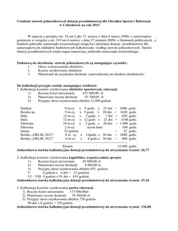 Ustalenie stawek jednostkowych dotacji przedmiotowej dla Ośrodka Sportu i Rekreacji w Człuchowie na rok 2015 W oparciu o przepisy art. 18 ust.2 pkt 15 ustawy z dnia 8 marca 1990r. o samorządzie gminnym w związku z art. 219 ust.4 ustawy z dnia 27 sierpnia 2009r. o finansach publicznych , z budżetu jednostki samorządu terytorialnego mogą być udzielane dotacje przedmiotowe dla samorządowych zakładów budżetowych kalkulowane według stawek jednostkowych. Stawki dotacji przedmiotowych ustala organ stanowiący jednostki samorządu terytorialnego. Podstawą do określenia stawek jednostkowych są następujące czynniki : 1. Okres wykorzystania obiektów, 2. Koszty użytkowania obiektów, 3. Planowane do uzyskania dochody z prowadzonej na obiekcie działalności. Do kalkulacji przyjęte zostały następujące wielkości: 1. Kalkulacja kosztów użytkowania obiektów sportowych, rekreacji 1) Roczny koszt utrzymania 415 000,00 zł 2) Planowane roczne dochody 93 700,00 zł 3) Przyjęty okres użytkowania obiektu 12 000 godzin Stadion Boiska sp. Hala Hala Siłownia Siłownia Sauna Boiska „ORLIK 2012” Boiska „ORLIK 2012” 9 m-cy x 8 godz. x 25 dni = 1800 godz. 9 m-cy x 9 godz. x 20 dni = 1620 godz. 12 m-cy x 5 godz. x 7 dni = 420 godz. 12 m-cy x 12 godz. x 22 dni = 3168 godz. 10 m-cy x 5 godz. x 20 dni = 1 000 godz. 2 m-ce sezon letni 100 godz. 52 godzin = 52 godz. 8 m –cy x 12godz. x 30 dni = 2880 godz. 4 m-ce x 8 godz.x 30 dni = 960 godz. -------------------------------------------------------------Razem 12 000 godz. Jednostkowa stawka kalkulacyjna dotacji przedmiotowej do utrzymania wynosi 26,77 2. Kalkulacja kosztów użytkowania kąpielisko, wypożyczalnia sprzętu: 1) Roczny koszt utrzymania 45 000,00 zł 2) Planowane roczne dochody 4 800,00 zł 3) Przyjęty okres użytkowania obiektu 851 godzin. V 8 godzin x 4 dni = 32 godziny VI – VIII 9 godzin x 91 dni = 819 godzin Jednostkowa stawka kalkulacyjna dotacji przedmiotowej do utrzymania wynosi 47,24 3. Kalkulacja kosztów użytkowania parku rekreacji: 1) Roczny koszt utrzymania 175 000,00zł 2) Planowane roczne dochody 76 500,00 zł 3) Przyjęty okres użytkowania obiektu 720 godzin 90 dni x 8 godzin = 720 godzin Jednostkowa stawka kalkulacyjna dotacji przedmiotowej do utrzymania wynosi 136,80 W oparciu o wyżej przedstawione wyliczenia kwota dotacji dla OSiR na rok 2015 wyniesie: 1) Do utrzymania obiektów sportowych, rekreacji 321 240,00 zł 2) Do utrzymania kąpieliska, wypożyczalni sprzętu 40 201,24 zł 3) Do utrzymania parku rekreacji 98 496,00 zł ------------------------------------459 937,24 zł Łączna wysokość dotacji dla OSiR wg kalkulacji wyniesie 460 000,00 zł Uzasadnienie Ośrodek Sportu i Rekreacji administruje obiektami sportowo-rekreacyjnymi stanowiącymi własność Gminy Człuchów. Prowadzi działalność polegającą między innymi na upowszechnianiu kultury fizycznej i turystyki, organizowaniu imprez sportowych, rekreacyjnych i turystycznych, a także świadczeniu usług poprzez udostępnianie obiektów na zajęcia sportowo-rekreacyjne, zapewnia dbałość o stan techniczny tych obiektów. Źródłami przychodu OSiR-u są dochody z prowadzonej działalności i usług (wynajmu i dzierżawy obiektów) oraz dotacje z budżetu Miasta. Na wydatki składają się przede wszystkim koszty związane z bieżącym utrzymaniem obiektów, poprawą ich stanu technicznego oraz podnoszeniem standardu, koszty organizacji imprez sportowo-rekreacyjnych, koszty osobowe pracowników wraz z pochodnymi oraz inne opłaty i składki. Zgodnie z ustawą o finansach publicznych, z budżetu gminy mogą być udzielane dotacje przedmiotowe między innymi dla samorządowych zakładów budżetowych, kalkulowane wg stawek jednostkowych. Stawkę dotacji przedmiotowej Ośrodka Sportu i Rekreacji na 2015 rok ustalono jako dopłatę do kosztów utrzymania 1 godziny obiektów administrowanych i wydzierżawianych przez OSiR, według sporządzonej kalkulacji. Kalkulacja sporządzona została w oparciu o planowane przychody i koszty w działalności OSiR