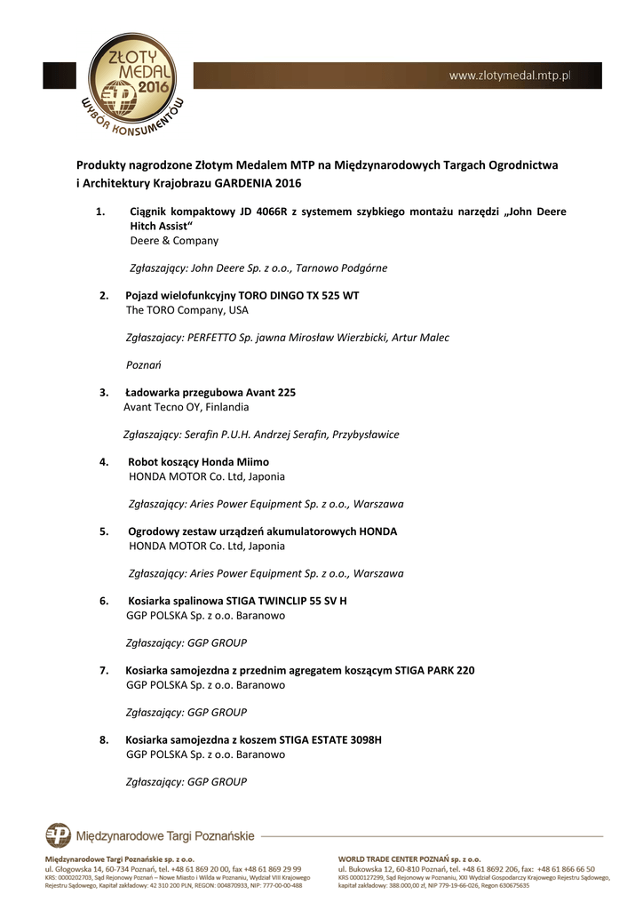 Produkty nagrodzone Złotym Medalem MTP na Międzynarodowych Targach Ogrodnictwa i Architektury Krajobrazu GARDENIA 2016 1. Ciągnik kompaktowy JD 4066R z systemem szybkiego montażu narzędzi „John Deere Hitch Assist“ Deere & Company Zgłaszający: John Deere Sp. z o.o., Tarnowo Podgórne 2. Pojazd wielofunkcyjny TORO DINGO TX 525 WT The TORO Company, USA Zgłaszajacy: PERFETTO Sp. jawna Mirosław Wierzbicki, Artur Malec Poznań 3. Ładowarka przegubowa Avant 225 Avant Tecno OY, Finlandia Zgłaszający: Serafin P.U.H. Andrzej Serafin, Przybysławice 4. Robot koszący Honda Miimo HONDA MOTOR Co. Ltd, Japonia Zgłaszający: Aries Power Equipment Sp. z o.o., Warszawa 5. Ogrodowy zestaw urządzeń akumulatorowych HONDA HONDA MOTOR Co. Ltd, Japonia Zgłaszający: Aries Power Equipment Sp. z o.o., Warszawa 6. Kosiarka spalinowa STIGA TWINCLIP 55 SV H GGP POLSKA Sp. z o.o. Baranowo Zgłaszający: GGP GROUP 7. Kosiarka samojezdna z przednim agregatem koszącym STIGA PARK 220 GGP POLSKA Sp. z o.o. Baranowo Zgłaszający: GGP GROUP 8. Kosiarka samojezdna z koszem STIGA ESTATE 3098H GGP POLSKA Sp. z o.o. Baranowo Zgłaszający: GGP GROUP 9. Kosiarka automatyczna Husqvarna Automover™ 450X HUSQVARNA AB, Szwecja Zgłaszający: Husqvarna Poland Sp. z o.o., Warszawa 10. Ramię zraszające wewnętrzne RWZ/250 AGRO-Sur Sp. z o.o., i wspólnicy Sp. Kom., Rogoźnik 11. Gala*AluBord GalaProdukt Sp. z o.o. Oborniki 12. System wodny EGRGO LINE™ Celfast Sp. z o.o., Stalowa Wola 13. Donica z systemem nawadniania Green Spa F.P.H. „Progresja“T.W.R. Walentynowicz Sp. Jawna , Kleosin 14. Benzyna alkiliowana ASPEN 2 i ASPEN4 Lantmannen Aspen AB, Szwecja 15. Specjalistyczny nawóz na trawniki „SPORT GREEN“ wiosenno-Letni „17-6-11“ HORTNAS Sp. z o.o., Góra 16. Florovit Pro Natura nawozy organiczne do roślin ogrodowych- linia oborników granulowanych GRUPA INCO S.A., Warszawa 17. Obornik granulowany AMPOL-MEROL Karol Smoleński, Wąbrzeźno 18. Seria odżywek do roślin „Strong“ Agrecol Sp. z o.o., Wieruszów 19. Pietruszka korzeniowa SAMBA Spójnia“ Hodowla i Nasiennictwo Ogrodnicze Sp. z o.o., Nochowo 20. Pomidor Malinowy Smaczek TORSEED Przedsiębiorstwo Nasiennictwa Ogrodniczego i Szkółkarstwa S.A. w Toruniu 21. Pomidor POLOROSA F1 W. Legutko Przedsiębiorstwo Hodowlano Nasienne Sp. z o.o. Nad Stawem 22. Papryka WERONA F1 W. Legutko Przedsiębiorstwo Hodowlano Nasienne Sp. z o.o. Nad Stawem 23. Miniogródki Vilmorin Garden VILMORIN GARDEN Sp. z o.o., Komorniki Przyznane Złote Medale MTP są równoważne.