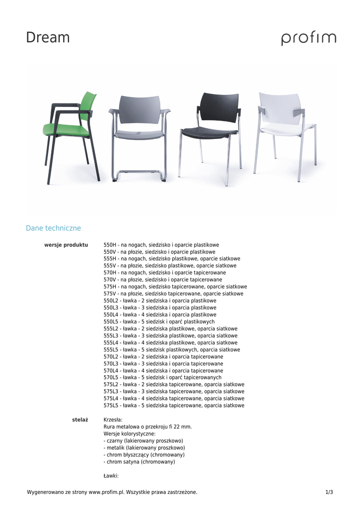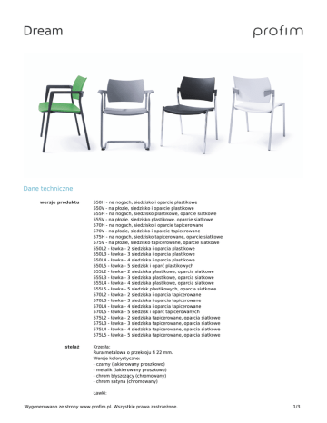 Dream Dane techniczne wersje produktu stelaż 550H - na nogach, siedzisko i oparcie plastikowe 550V - na płozie, siedzisko i oparcie plastikowe 555H - na nogach, siedzisko plastikowe, oparcie siatkowe 555V - na płozie, siedzisko plastikowe, oparcie siatkowe 570H - na nogach, siedzisko i oparcie tapicerowane 570V - na płozie, siedzisko i oparcie tapicerowane 575H - na nogach, siedzisko tapicerowane, oparcie siatkowe 575V - na płozie, siedzisko tapicerowane, oparcie siatkowe 550L2 - ławka - 2 siedziska i oparcia plastikowe 550L3 - ławka - 3 siedziska i oparcia plastikowe 550L4 - ławka - 4 siedziska i oparcia plastikowe 550L5 - ławka - 5 siedzisk i oparć plastikowych 555L2 - ławka - 2 siedziska plastikowe, oparcia siatkowe 555L3 - ławka - 3 siedziska plastikowe, oparcia siatkowe 555L4 - ławka - 4 siedziska plastikowe, oparcia siatkowe 555L5 - ławka - 5 siedzisk plastikowych, oparcia siatkowe 570L2 - ławka - 2 siedziska i oparcia tapicerowane 570L3 - ławka - 3 siedziska i oparcia tapicerowane 570L4 - ławka - 4 siedziska i oparcia tapicerowane 570L5 - ławka - 5 siedzisk i oparć tapicerowanych 575L2 - ławka - 2 siedziska tapicerowane, oparcia siatkowe 575L3 - ławka - 3 siedziska tapicerowane, oparcia siatkowe 575L4 - ławka - 4 siedziska tapicerowane, oparcia siatkowe 575L5 - ławka - 5 siedziska tapicerowane, oparcia siatkowe Krzesła: Rura metalowa o przekroju fi 22 mm. Wersje kolorystyczne: - czarny (lakierowany proszkowo) - metalik (lakierowany proszkowo) - chrom błyszczący (chromowany) - chrom satyna (chromowany) Ławki: Wygenerowano ze strony www.profim.pl. Wszystkie prawa zastrzeżone. 1/3 Metalowa belka osadzona na metalowych nogach. Wersje kolorystyczne: - czarny (lakierowany proszkowo) - metalik (lakierowany proszkowo) - chrom błyszczący (chromowany) - chrom satyna (chromowany) blat podłokietniki kółka/stopki Krzesła: Integralna część podłokietnika, z lewej lub z prawej strony. Ławki: blat zamiast siedziska, zawsze w kolorze czarnym (płyta wiórowa + okleina sztuczna). Twarde, z tworzywa, czarne lub popielate. - standard - stopki twarde (do podłóg miękkich) - opcja - stopki z podkładką filcową (do podłóg twardych) - standard - kółka uniwersalne siedzisko - z tworzywa - tapicerowane - pianka cięta - gęstość 35 kg/m3 oparcie - z tworzywa - tapicerowane - pianka cięta - gęstość 35 kg/m3 - siatkowe waga netto - 550H, 555H - 4,5 kg - 550H 2P, 555H 2P, 570H, 575H - 5,5 kg - 570H 2P, 575H 2P - 6,5 kg - 550V, 555V - 6,0 kg - 550V 2P, 555V 2P, 570V, 575V - 7,0 kg - 570V 2P, 575V 2P - 8,0 kg - 550L2 - 22,5 kg - 550L3 - 27,5 kg - 550L4 - 32,5 kg - 550L5 - 37,5 kg waga brutto - 550H, 555H - 8,5 kg - 550H 2P, 555H 2P, 570H, 575H - 9,5 kg - 570H 2P, 575H 2P - 10,5 kg - 550V, 555V - 10,0 kg - 550V 2P, 555V 2P, 570V, 575V - 11,0 kg - 570V 2P, 575V 2P - 12,0 kg sztaplowanie dodatkowe 550H stopki, 555H stopki - 12/12* 550H 2P stopki, 555H 2P stopki - 9/9* 550H 2PB stopki, 555H 2PB stopki - 9/9* 550H kółka, 555H kółka - 9/12* 550H 2P kółka, 555H 2P kółka - 4/4* 550H 2PB kółka, 555H 2PB kółka - 4/4* 570H stopki, 575H stopki - 10/10* 570H 2P stopki, 575H 2P stopki - 8/8* 570H 2PB stopki, 575H 2PB stopki - 8/8* 570H kółka, 575H kółka - 8/10* 570H 2P kółka, 575H 2P kółka - 4/4* 570H 2PB kółka, 575H 2PB kółka - 4/4* 550V, 550V 2P, 555V, 555V 2P - 8 550V 2PB, 555V 2PB - 8 570V, 570V 2P, 570V 2PB - 6 575V, 575V 2P, 575V 2PB - 7 łączenie w rzędy, wózek do transportu krzeseł Wygenerowano ze strony www.profim.pl. Wszystkie prawa zastrzeżone. 2/3 Wymiary Wygenerowano ze strony www.profim.pl. Wszystkie prawa zastrzeżone. 3/3