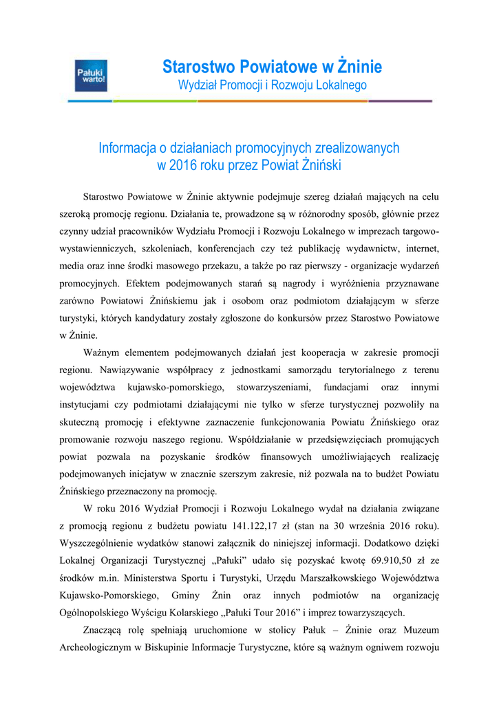 Starostwo Powiatowe w Żninie Wydział Promocji i Rozwoju Lokalnego Informacja o działaniach promocyjnych zrealizowanych w 2016 roku przez Powiat Żniński Starostwo Powiatowe w Żninie aktywnie podejmuje szereg działań mających na celu szeroką promocję regionu. Działania te, prowadzone są w różnorodny sposób, głównie przez czynny udział pracowników Wydziału Promocji i Rozwoju Lokalnego w imprezach targowowystawienniczych, szkoleniach, konferencjach czy też publikację wydawnictw, internet, media oraz inne środki masowego przekazu, a także po raz pierwszy - organizacje wydarzeń promocyjnych. Efektem podejmowanych starań są nagrody i wyróżnienia przyznawane zarówno Powiatowi Żnińskiemu jak i osobom oraz podmiotom działającym w sferze turystyki, których kandydatury zostały zgłoszone do konkursów przez Starostwo Powiatowe w Żninie. Ważnym elementem podejmowanych działań jest kooperacja w zakresie promocji regionu. Nawiązywanie współpracy z jednostkami samorządu terytorialnego z terenu województwa kujawsko-pomorskiego, stowarzyszeniami, fundacjami oraz innymi instytucjami czy podmiotami działającymi nie tylko w sferze turystycznej pozwoliły na skuteczną promocję i efektywne zaznaczenie funkcjonowania Powiatu Żnińskiego oraz promowanie rozwoju naszego regionu. Współdziałanie w przedsięwzięciach promujących powiat pozwala na pozyskanie środków finansowych umożliwiających realizację podejmowanych inicjatyw w znacznie szerszym zakresie, niż pozwala na to budżet Powiatu Żnińskiego przeznaczony na promocję. W roku 2016 Wydział Promocji i Rozwoju Lokalnego wydał na działania związane z promocją regionu z budżetu powiatu 141.122,17 zł (stan na 30 września 2016 roku). Wyszczególnienie wydatków stanowi załącznik do niniejszej informacji. Dodatkowo dzięki Lokalnej Organizacji Turystycznej „Pałuki” udało się pozyskać kwotę 69.910,50 zł ze środków m.in. Ministerstwa Sportu i Turystyki, Urzędu Marszałkowskiego Województwa Kujawsko-Pomorskiego, Gminy Żnin oraz innych podmiotów na organizację Ogólnopolskiego Wyścigu Kolarskiego „Pałuki Tour 2016” i imprez towarzyszących. Znaczącą rolę spełniają uruchomione w stolicy Pałuk – Żninie oraz Muzeum Archeologicznym w Biskupinie Informacje Turystyczne, które są ważnym ogniwem rozwoju turystyki w powiecie. Pełnią one funkcję informacyjną i promocyjną, a ich powstanie było wynikiem wspólnej inicjatywy Powiatu Żnińskiego z Gminą Żnin oraz Muzeum Archeologicznym w Biskupinie. Szczegółowy opis zadań zrealizowanych w ramach promocji Powiatu Żnińskiego w 2016 roku I. Promocja turystyczna 1.1. Imprezy targowo - wystawiennicze Walory turystyczne Powiatu Żnińskiego oraz Pałuk promowane są podczas targów turystycznych i innych imprez promocyjnych, w których udział biorą pracownicy Wydziału Promocji i Rozwoju Lokalnego. W roku 2016 przedstawiciele Powiatu Żnińskiego uczestniczyli w pięciu imprezach targowo – wystawienniczych. Planowany jest jeszcze udział w październikowych Międzynarodowych Targach Turystycznych - World Travel Show w Nadarzynie. Zestawienie przedmiotowych targów zawiera poniższa tabela. Lp. Nazwa targów „TOUR Liczba Wystawców Liczba Odwiedzających 231 ok. 35.000 ok. 5.000 1. Targi Regionów i Produktów Turystycznych SALON” w Poznaniu (12-14 lutego 2016 roku)* 2. Targi Turystyczne „Travel and Taste” w Bydgoszczy (19-20 lutego 2016 roku)* 73 3. Międzynarodowe Targi Turystyki, Spa, Sprzętu Turystycznego i Żeglarskiego GLOBalnie w Katowicach (18-20 marca 2016 roku) 250 4. Targi Turystyczne „WYPOCZYNEK” w Toruniu oraz Toruński Festiwal Smaków (9-10 kwietnia 2016 roku) 100 ok.4.700 5. XVII Targi Turystyczno – Ogrodnicze „LATO NA WSI” w Minikowie (7-8 maja 2016 roku) 200 ok. 10.000 6. Międzynarodowe Targi Turystyczne „World Travel Show” w Nadarzynie (14-16 października 2016 roku)* 240 - ok.7.500 * Powiat Żniński jako podwystawca w ramach stoiska Kujawsko – Pomorskiej Organizacji Turystycznej Poza ww. imprezami targowo – wystawienniczymi Powiat Żniński uczestniczył w innych przedsięwzięciach o charakterze promocyjnym. W roku 2016 stoisko promocyjne powiatu zorganizowano podczas: 2 Lp. Nazwa imprezy/wydarzenia Powierzchnia stoiska 1. Majówka Jazzowa w Pałacu Lubostroń (7 maja 2016 roku) ok. 9 m2 2. Targi Pracy i Edukacji w Żninie (18 maja 2016 roku) ok. 9 m2 3. Wojewódzkie Obchody Dnia Strażaka w Żninie (21 maja 2016 roku) ok. 9 m2 4. 756. Jarmark Świętego Dominika w Gdańsku (30 lipca – 21 sierpnia 2016 roku) 5. Ogólnopolski Wyścig Kolarski „Pałuki Tour 2016” w Żninie (4 września 2016 roku) ok. 9 m2 6. Festyn Archeologiczny w Biskupinie (17-25 września 2016 roku) ok. 9 m2 1.2. ok. 4 m2 Konkursy, nagrody, wyróżnienia Starostwo Powiatowe w Żninie za działania na rzecz promocji regionu realizowane w ubiegłym roku zostało docenione o czym świadczy chociażby wyróżnienie za 12 miejsce w rankingu Związku Powiatów Polskich w kategorii „Powiaty od 60 tysięcy do 120 tysięcy mieszkańców”. Nagroda została przyznana w 2016 roku. Działania w sektorze usług turystycznych były tematem kilku konkursów ogłaszanych m.in. przez Urząd Marszałkowski Województwa Kujawsko – Pomorskiego, Polską Organizację Turystyczną czy Instytut Certyfikacji i jakości Gospodarczo-Samorządowy Hit Regionów. W odpowiedzi Wydział Promocji i Rozwoju Lokalnego przygotował zgłoszenia do następujących konkursów: „Odkrywca 2016 - wyróżnienie Marszałka Województwa Kujawsko-Pomorskiego w dziedzinie turystyki” – w kategorii „Wydarzenie turystyczne i promocyjne” zgłoszono Festiwal „Muzyka w Świetle Księżyca” w Lubostroniu. „Odkrywca 2016 - wyróżnienie Marszałka Województwa Kujawsko-Pomorskiego w dziedzinie turystyki” – w kategorii „Inwestycja sprzyjająca rozwojowi turystyki” zgłoszono Łabiszyńską Wyspę. „Złoty Certyfikat 