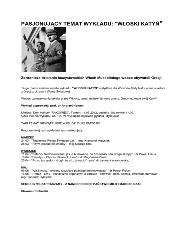 PASJONUJĄCY TEMAT WYKŁADU: "WŁOSKI KATYŃ" Zbrodnicze działania faszystowskich Włoch Mussoliniego wobec obywateli Grecji 14-go marca zmiana tematu wykładu: "WŁOSKI KATYŃ" wstydliwe dla Włochów fakty historyczne w relacji z Grecji z okresu II Wojny Światowej. Wobec zamazywania faktów przez Włochy, temat relatywnie mało znany. Grecy też maja swój Katyń! Wykład poprowadzi prof. dr Andrzej Hennel. Miejsce: Dom Kultury "RAKOWIEC". Termin: 14.03.2012, godzina jak zwykle 11.00. Czas trwania wykładu: ca. 1 h. Po wykładzie zapewne pytania i dyskusja! TAKI TEMAT NIEWĄTPLIWIE WZBUDZI DUŻE EMOCJE! Program kolejnych wykładów jest następujący: MARZEC 21.03 - "Tajemnice Pisma Świętego c.d." - mgr Krzysztof Matysiak, 28.03 - "Rzym jakiego nie znamy" - mgr Urszula Król, KWIECIEŃ 11.04 - "Katedry średniowieczne, jak je budowano, co oznaczały i do czego służyły" - dr Paweł Freus, 18.04 - "Dandysi - Chopin, Słowacki i inni" - dr Magdalena Bialic, 25.04 - "Po co ta rzęska - drogi i bezdroża nauki" - prof. dr Janina Kaczanowska, MAJ 09.05 - "Wit Stwosz - wybitny rzeźbiarz późnego średniowiecza" - dr Paweł Freus, 16.05 - "Probio - Emy - pożyteczne organizmy, a zdrowie - człowiek, dom, działka, zwierzęta domowe" mgr Tadeusz Dylewski. SERDECZNIE ZAPRASZAMY - Z NAMI SPĘDZICIE PAŃSTWO MIŁO I MĄDRZE CZAS Sławomir Sobalski