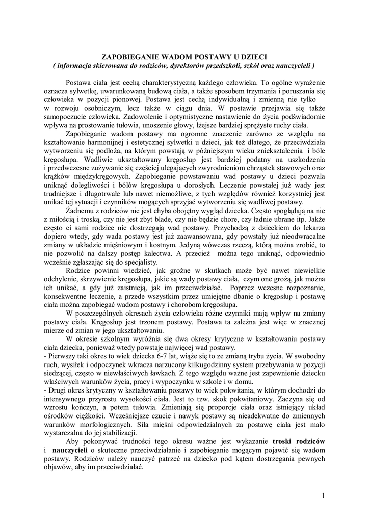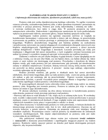 ZAPOBIEGANIE WADOM POSTAWY U DZIECI ( informacja skierowana do rodziców, dyrektorów przedszkoli, szkół oraz nauczycieli ) Postawa ciała jest cechą charakterystyczną każdego człowieka. To ogólne wyrażenie oznacza sylwetkę, uwarunkowaną budową ciała, a także sposobem trzymania i poruszania się człowieka w pozycji pionowej. Postawa jest cechą indywidualną i zmienną nie tylko w rozwoju osobniczym, lecz także w ciągu dnia. W postawie przejawia się także samopoczucie człowieka. Zadowolenie i optymistyczne nastawienie do życia podświadomie wpływa na prostowanie tułowia, unoszenie głowy, lżejsze bardziej sprężyste ruchy ciała. Zapobieganie wadom postawy ma ogromne znaczenie zarówno ze względu na kształtowanie harmonijnej i estetycznej sylwetki u dzieci, jak też dlatego, że przeciwdziała wytworzeniu się podłoża, na którym powstają w późniejszym wieku zniekształcenia i bóle kręgosłupa. Wadliwie ukształtowany kręgosłup jest bardziej podatny na uszkodzenia i przedwczesne zużywanie się częściej ulegających zwyrodnieniom chrząstek stawowych oraz krążków międzykręgowych. Zapobieganie powstawaniu wad postawy u dzieci pozwala uniknąć dolegliwości i bólów kręgosłupa u dorosłych. Leczenie powstałej już wady jest trudniejsze i długotrwałe lub nawet niemożliwe, z tych względów również korzystniej jest unikać tej sytuacji i czynników mogących sprzyjać wytworzeniu się wadliwej postawy. Żadnemu z rodziców nie jest chyba obojętny wygląd dziecka. Często spoglądają na nie z miłością i troską, czy nie jest zbyt blade, czy nie będzie chore, czy ładnie ubrane itp. Jakże często ci sami rodzice nie dostrzegają wad postawy. Przychodzą z dzieckiem do lekarza dopiero wtedy, gdy wada postawy jest już zaawansowana, gdy powstały już nieodwracalne zmiany w układzie mięśniowym i kostnym. Jedyną wówczas rzeczą, którą można zrobić, to nie pozwolić na dalszy postęp kalectwa. A przecież można tego uniknąć, odpowiednio wcześnie zgłaszając się do specjalisty. Rodzice powinni wiedzieć, jak groźne w skutkach może być nawet niewielkie odchylenie, skrzywienie kręgosłupa, jakie są wady postawy ciała, czym one grożą, jak można ich unikać, a gdy już zaistnieją, jak im przeciwdziałać. Poprzez wczesne rozpoznanie, konsekwentne leczenie, a przede wszystkim przez umiejętne dbanie o kręgosłup i postawę ciała można zapobiegać wadom postawy i chorobom kręgosłupa. W poszczególnych okresach życia człowieka różne czynniki mają wpływ na zmiany postawy ciała. Kręgosłup jest trzonem postawy. Postawa ta zależna jest więc w znacznej mierze od zmian w jego ukształtowaniu. W okresie szkolnym wyróżnia się dwa okresy krytyczne w kształtowaniu postawy ciała dziecka, ponieważ wtedy powstaje najwięcej wad postawy. - Pierwszy taki okres to wiek dziecka 6-7 lat, wiąże się to ze zmianą trybu życia. W swobodny ruch, wysiłek i odpoczynek wkracza narzucony kilkugodzinny system przebywania w pozycji siedzącej, często w niewłaściwych ławkach. Z tego względu ważne jest zapewnienie dziecku właściwych warunków życia, pracy i wypoczynku w szkole i w domu. - Drugi okres krytyczny w kształtowaniu postawy to wiek pokwitania, w którym dochodzi do intensywnego przyrostu wysokości ciała. Jest to tzw. skok pokwitaniowy. Zaczyna się od wzrostu kończyn, a potem tułowia. Zmieniają się proporcje ciała oraz istniejący układ ośrodków ciężkości. Wcześniejsze czucie i nawyk postawy są nieadekwatne do zmiennych warunków morfologicznych. Siła mięśni odpowiedzialnych za postawę ciała jest mało wystarczalna do jej stabilizacji. Aby pokonywać trudności tego okresu ważne jest wykazanie troski rodziców i nauczycieli o skuteczne przeciwdziałanie i zapobieganie mogącym pojawić się wadom postawy. Rodziców należy nauczyć patrzeć na dziecko pod kątem dostrzegania pewnych objawów, aby im przeciwdziałać. 1 Do najczęstszych wad postawy należą: plecy okrągłe – to garbienie się, wysuwanie głowy i barków ku przodowi, odstawanie łopatek, klatka piersiowa spłaszczona, plecy wklęsłe – to zaznaczone wygięcie krzywizny lędźwiowej ku przodowi, wypięty brzuch, podkurczone nadmiernie mięśnie, plecy okrągło – wklęsłe – to połączenie w/w wad, plecy płaskie – charakterystyczne spłaszczenie obu krzywizn piersiowej i lędźwiowej, boczne skrzywienie kręgosłupa (skoliozy). Wady statyczne kończyn dolnych: kolana koślawe – to wygięcie kończyn w stawie kolanowym do wewnątrz –„X” kolana szpotawe – w kształcie „O”, wygięcie kończyn w stawie kolanowym na zewnątrz, płaskostopie. Postawę dziecka kształtuje środowisko, w którym najistotniejszą rolę odgrywa dom i szkoła. Rodzice od najmłodszych lat powinni zadbać o właściwe odżywianie dziecka, szkodliwe jest zarówno niedożywienie, jak i przekarmienie. Nadmierny ciężar ciała przy słabej muskulaturze stanowić może poważny czynnik pogłębiający wadę, stąd w przypadku nadwagi dobrze jest stosować dietę odchudzającą oraz zintensyfikować ogólną aktywność ruchową. - Rodzice powinni kontrolować czas, który dziecko spędza przed komputerem czy telewizorem. Długotrwałe korzystanie z komputera, oglądanie telewizji związane jest z przebywaniem dziecka w wymuszonej pozycji siedzącej i w znacznym stopniu ma wpływ na pogorszenie się postawy ciała. - W czasie odrabiania lekcji tułów powinien być wyprostowany i oddalony od stołu 3–5 cm, nogi piszącego powinny dotykać całymi stopami podłoża lub podnóżka. Podczas odrabiania lekcji głowa powinna być nieznacznie pochylona nad stołem, zaś odległość oczu od końca długopisu powinna wynosić 30 – 35 cm, łokcie nie powinny leżeć na stole, ale wystawać nieco poza jego brzeg, zeszyt należy umieszczać na wprost środka piersi piszącego tak, aby prawy róg zeszytu leżał wyżej niż lewy. Odrab