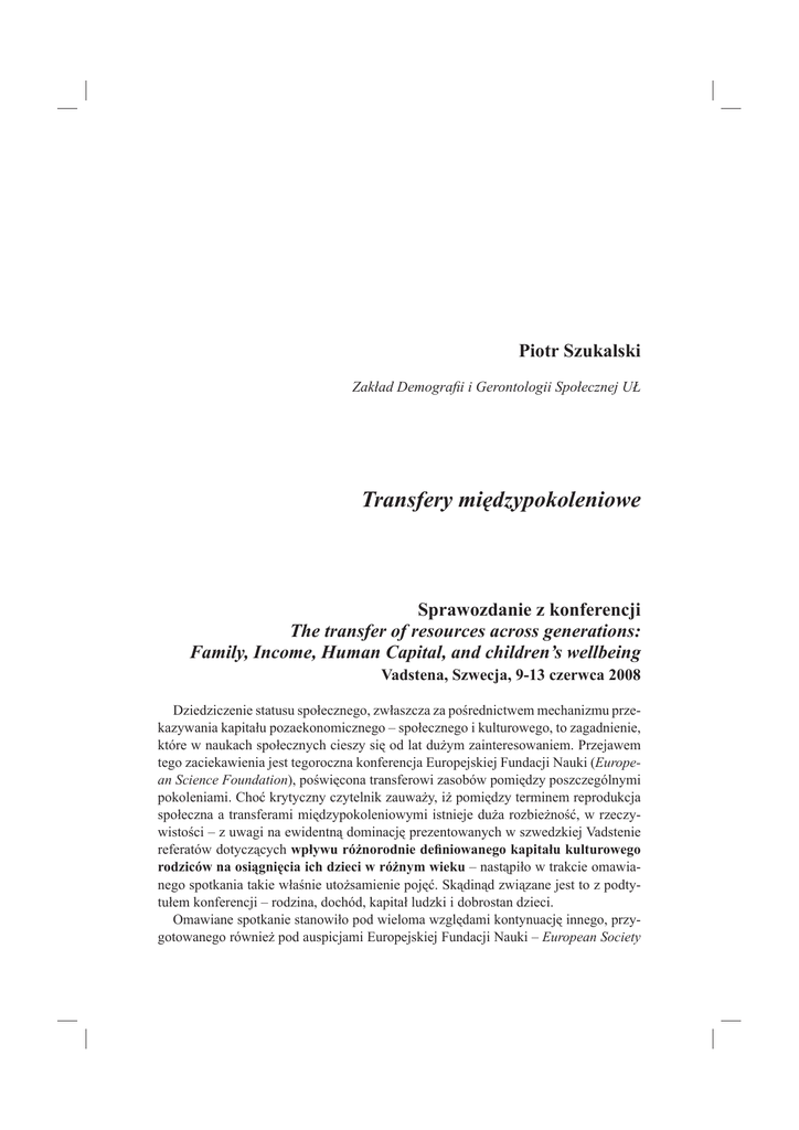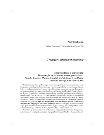 Piotr Szukalski Zakáad DemograÞi i Gerontologii Spoáecznej Uà Transfery miĊdzypokoleniowe Sprawozdanie z konferencji The transfer of resources across generations: Family, Income, Human Capital, and children’s wellbeing Vadstena, Szwecja, 9-13 czerwca 2008 Dziedziczenie statusu spoáecznego, zwáaszcza za poĞrednictwem mechanizmu przekazywania kapitaáu pozaekonomicznego – spoáecznego i kulturowego, to zagadnienie, które w naukach spoáecznych cieszy siĊ od lat duĪym zainteresowaniem. Przejawem tego zaciekawienia jest tegoroczna konferencja Europejskiej Fundacji Nauki (European Science Foundation), poĞwiĊcona transferowi zasobów pomiĊdzy poszczególnymi pokoleniami. Choü krytyczny czytelnik zauwaĪy, iĪ pomiĊdzy terminem reprodukcja spoáeczna a transferami miĊdzypokoleniowymi istnieje duĪa rozbieĪnoĞü, w rzeczywistoĞci – z uwagi na ewidentną dominacjĊ prezentowanych w szwedzkiej Vadstenie referatów dotyczących wpáywu róĪnorodnie deÞniowanego kapitaáu kulturowego rodziców na osiągniĊcia ich dzieci w róĪnym wieku – nastąpiáo w trakcie omawianego spotkania takie wáaĞnie utoĪsamienie pojĊü. Skądinąd związane jest to z podtytuáem konferencji – rodzina, dochód, kapitaá ludzki i dobrostan dzieci. Omawiane spotkanie stanowiáo pod wieloma wzglĊdami kontynuacjĊ innego, przygotowanego równieĪ pod auspicjami Europejskiej Fundacji Nauki – European Society 198 Piotr Szukalski or European Societies. Euroconference on the causes and consequences of low education in contemporary Europe, która miaáa miejsce w hiszpaĔskiej Granadzie w 2004 r. W trakcie konferencji zaprezentowano ponad 40 referatów, poĞwiĊconych w zdecydowanej wiĊkszoĞci tak wáaĞnie zdeÞniowanej tematyce. Z przedstawionych wystąpieĔ wynika, iĪ wciąĪ we wspóáczesnym rozwiniĊtym Ğwiecie – na konferencji brak byáo poza Norwegami, Szwajcarami i JapoĔczykami osób reprezentujących kraje inne niĪ czáonków UE i USA – wystĊpuje dziedziczenie statusu spoáecznego, aczkolwiek jesteĞmy obecnie w bardziej wywaĪony i wyraÞnowany sposób w stanie okreĞliü jego mechanizm, czynniki, okolicznoĞci i skutki. Choü problem nie stanowi z punktu widzenia prac prowadzonych w Polsce terra incognita, zaznaczyü chciaábym odmienny od rozpowszechnionego w naszym kraju sposób podchodzenia do problemu, a mianowicie matematyzacjĊ problemów socjologicznych i pedagogicznych, o ekonomicznych nie wspomnĊ. Zdecydowaną wiĊkszoĞü uczestników spotkania stanowili socjolodzy, niemniej ewidentnie konferencjĊ zdominowaáy analizy wykorzystujące zaawansowane metody iloĞciowe, przede wszystkim metody logitowe. Konferencja byáa tak zorganizowana, aby umoĪliwiü uczestnikom dyskusjĊ nad prezentowanymi wystąpieniami – dwugodzinne bloki podzielone byáy na dwie czĊĞci: pierwsze póá godziny przeznaczano na przeglądowe opracowanie doĞwiadczonego badacza z krótką dyskusją, pozostaáe póátorej godziny to czas na 3-4 piĊtnastominutowe wystąpienia o charakterze relacji z badania empirycznego zakoĔczone pytaniami i komentarzami. Bogactwo materiaáu – przede wszystkim empirycznego – zaprezentowanego podczas konferencji nie pozwala na peáną prezentacjĊ jej dorobku w niniejszym omówieniu, niemniej poniĪej pozwolĊ sobie na przywoáanie kilku wystąpieĔ z dziedzin bynajmniej nie dominujących w trakcie konferencji, lecz najbliĪszych mym osobistym zainteresowaniom. Znany amerykaĔski socjolog dzieciĔstwa i rodziny Frank Furstenberg swoje wystąpienie poĞwiĊciá związkom pomiĊdzy zmianą wzorca udzielanej máodym ludziom pomocy miĊdzypokoleniowej a odraczaniem przez nich momentu rozpoczynania samodzielnego Īycia. „Italianizacja” máodoĞci – pojawiająca siĊ i w USA – oznacza wynikające zarówno z dáuĪszego okresu pobierania nauki, káopotliwych początków kariery zawodowej, jak i póĨniejszego rozpoczynania bycia na powaĪnie z partnerem/ partnerką Īycia, dáuĪsze zamieszkiwanie z rodzicami. Choü wspólne zamieszkiwanie jest korzystne dla máodych ludzi, tak z punktu ekonomicznego jak i czasowego (to rodzice wykonują wiĊkszoĞü prac domowych), wzmaga to zaleĪnoĞü od rodziców, mogąc owocowaü wzmoĪonymi niesnaskami rodzinnymi. Furstenberg zwróciá przy tym uwagĊ na rolĊ czynnika klasowego – w sytuacji nowych wyzwaĔ klasy wyĪsze zarządzają wystĊpującymi zmianami w przebiegu ĞcieĪki Īycia, klasy Ğrednie – usiáują siĊ do nich dopasowaü, zaĞ rodziny z doáu hierarchii spoáecznej poddają siĊ zmianom, co moĪe prowadziü w perspektywie najbliĪszych dekad do wzrostu rozwarstwienia spoáecznego. Takie uporządkowanie wynika ze wzmoĪonych inwestycji w kapitaá ludzki potomstwa, jakich w obecnych czasach dokonywaü muszą rodzice. Transfery miĊdzypokoleniowe... 199 Z innego punktu widzenia na to samo zagadnienie spojrzaá Martin Kohli, wedáug którego zaniedbanymi obszarami badaĔ wokóá przepáywów miĊdzypokoleniowych są: 1. badania nad systemami zabezpieczenia spoáecznego (najwaĪniejszy element publicznych transferów) i ich związkami z prywatnymi przepáywami; 2. badania z punktu widzenia cyklu Īycia z uwzglĊdnieniem nie tylko efektu wieku, lecz i generacji (a zatem z wykorzystaniem badaĔ wzdáuĪnych); 3. wzorzec transferów w zaleĪnoĞci od klasy spoáecznej rodziny – z zastrzeĪeniem, Īe przepáywy prywatne nie tylko zaleĪą od przynaleĪnoĞci klasowej, lecz równieĪ oddziaáują na klasĊ, do której przynaleĪeü bĊdzie dziecko; 4. problem inkluzji spoáecznej na poziomie rodziny – uwzglĊdnienie wypeánianej przez rodzinĊ miĊdzypokoleniowych funkcji: ubezpieczeniowej i funkcji wyrównywania konsumpcji. Ciekawym wnioskiem referenta byáo stwierdzenie, iĪ w paĔstwach o silniej rozbudowanych funkcjach welfare state wpáyw zasobów znajdujących siĊ w dyspozycji rodziców, jak i potrzeb dzieci, na wzorzec pomocy miĊdzypokoleniowej w rodzinie, jest zdecydowanie mniejszy w p