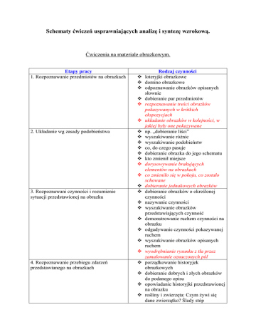 Schematy ćwiczeń usprawniających analizę i syntezę wzrokową. Ćwiczenia na materiale obrazkowym. Etapy pracy 1. Rozpoznawanie przedmiotów na obrazkach 2. Układanie wg zasady podobieństwa 3. Rozpoznawani czynności i rozumienie sytuacji przedstawionej na obrazku 4. Rozpoznawanie przebiegu zdarzeń przedstawianego na obrazkach Rodzaj czynności loteryjki obrazkowe domino obrazkowe odpoznawanie obrazków opisanych słownie dobieranie par przedmiotów rozpoznawanie treści obrazków pokazywanych w krótkich ekspozycjach układanie obrazków w kolejności, w jakiej były one pokazywane np. „dobieranie liści” wyszukiwanie różnic wyszukiwanie podobieństw co, do czego pasuje dobieranie obrazka do jego schematu kto zmienił miejsce dorysowywanie brakujących elementów na obrazkach co zmieniło się w pokoju, co zostało schowane dobieranie jednakowych obrazków dobieranie obrazków o określonej czynności nazywanie czynności wyszukiwanie obrazków przedstawiających czynność demonstrowanie ruchem czynności na obrazku odgadywanie czynności pokazywanej ruchem wyszukiwanie obrazków opisanych ruchem wyodrębnianie rysunku z tła przez zamalowanie oznaczonych pól porządkowanie historyjek obrazkowych dobieranie dobrych i złych obrazków do podanego opisu opowiadanie historyjki przedstawionej na obrazku rośliny i zwierzęta: Czym żywi się dane zwierzątko? Ślady stóp 5. Składanie całości z części dobieranie części do całości układanie obrazków po uprzednim rozcięciu a) na wzorze b) wg wzoru c) bez wzoru Ćwiczenia na materiale geometrycznym Etapy pracy 1. Odpoznawanie jednakowych kształtów 2. Prawidłowe wyróżnianie figur narysowanych 3. Wyróżnianie i odtwarzanie figur. narysowanych 4. Prawidłowe wyróżnienie i odtwarzanie układów linii prostych i krzywych 5. Umiejętność składanie figur z części Rodzaje czynności różnicowanie figur geometrycznych pod względem: kształtu, wielkości, koloru segregowanie figur wg określonych zasad dobieranie odpowiedniego rysunku obrysowywanie prostych figur kopiowanie przez kalkę łączenie kropek rysowani z pamięci odnajdywanie figur geometrycznych na obrazkach i zamalowywanie ich loteryjki geometryczne układanie mozaikowe domina geometryczne loteryjki z figurami (listki, owoce) loteryjki całości i części odtwarzanie z pamięci uprzednio widzianych wzorów różnicowanie kształtów odtwarzanie z pamięci prostych układów z klocków układanie figur geometrycznych ze wzoru z pamięci rysowanie wzorków i szlaczków na gładkim papierze w linię i kratkę układanie kompozycji szlaczkowych z figur wg wzoru i z pamięci figury liczbowe układanie jedno i wielobarwne układanie figur po uprzednim rozcięciu wg wzoru z pamięci odbijanie stemplami układu figur kolorowe wycinanki z figur geometrycznych układanie różnych kompozycji i budowli według wzoru (klocki, mozaiki geometryczne, układanki) zabawy z tangramami układanie figur z patyczków Ćwiczenia na materiale literopodobnym Etapy pracy 1. Odpoznawanie znaków graficznych i liter (bez wprowadzania nazwy litery) 2. Różnicowanie znaków graficznych i liter 3. Odpoznawanie i różnicowanie sylab 4. Odpoznawanie i różnicowanie wyrazów trzyliterowych Rodzaje ćwiczeń szeregowanie liter wyszukiwanie takiej samej litery wśród innych odtwarzanie z pamięci uprzednio widzianych wzorów wyszukiwanie różnic w wyrazach i podkreślanie ich układanie liter według wzoru wykonanego przez dorosłego, bez odczytywania wyrazów różnicowanie znaków graficznych i liter podobnych segregowanie liter podobnych (p, b; g, d; u, n) domino literowe różnicowanie liter mylonych wycinanie, wydzieranie, lepienie liter i nazywanie ich dobieranie parami liter dużych i małych, lub pisanych i drukowanych wyszukiwanie sylaby demonstrowanej wśród innych wyodrębnianie sylab w wyrazach domino sylabowe odczytywanie sylab i wyrazów zapisywanych palcem na plecach wyszukiwanie takich samych wyrazów wyszukiwanie wyrazów podobnych składanie prostych wyrazów z rozsypanek literowych Schematy ćwiczeń usprawniających koordynację ruchowo-wzrokową Etapy pracy 1. Podnoszenie ogólnej sprawności i koordynacji ciała 2. Usprawnianie manipulacji przedmiotami 3. Kojarzenie doznań ruchowych z obrazami graficznymi 4. Przyzwyczajenie do kontroli wykonywanego ruchu graficznego Rodzaje ćwiczeń ćwiczenia w marszu ćwiczenia w biegu ćwiczenia na równoważni zabawy skoczne zabawy ze skakankami gry i zabawy na czworaka chodzenie po narysowanej linii gry i zabawy orientacyjno porządkowe zabawy z piłką lub balonikiem (odbijanie, podrzucanie, toczenie) rzucanie do celu - krążka na drążek - kółka z papieru - krążka na krążek zabawy z woreczkami - podrzucanie - łapanie - podnoszenie przenoszenie piramidek ułożonych z pudełek, klocków rozpoznawanie przedmiotów z zamkniętymi oczyma dopasowywanie elementów o tych samych kształtach - wkładanie klocków w odpowiednie dziury zabawy pacynką kreślenie dużych płynnych linii - kredą na tablicy - patykiem na piasku - pędzlem/węglem na arkuszu papieru - chorągiewką w powietrzu zamalowywanie dużych powierzchni zamalowywanie dużych figur na tablicy/arkuszach papieru zamalowywanie obrazków w książeczkach do rysowania obrysowywanie szablonów figur kopiowanie przez kalkę malowanie w obrębie konturów rysowanie po śladzie kolorowanie obrazków 5. Usprawnianie celowych i precyzyjnych ruchów rąk oraz ich współdziałanie 6. Ćwiczenie dokładnej kontroli nad ruchami graficznymi 7. Ćwiczenie kontroli nad wykonywaniem ruchów w odtwarzaniu symboli graficznych labirynty łączenie wyznaczonych punktów obrysowywanie flamastrem konturów państw wydzieranki, wycinanki, naklejanki lepienie z plasteliny zabawy konstrukcyjne, majsterkowanie układanie kompozycji wg wzoru nawlekanie koralików przyszywanie guzików szycie prostymi ściegami modelowanie z plasteliny, modeliny, masy papierowej najpierw ku