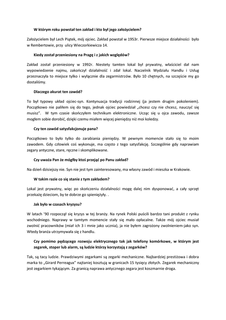 W którym roku powstał ten zakład i kto był jego założycielem? Założycielem był Lech Piątek, mój ojciec. Zakład powstał w 1953r. Pierwsze miejsce działalności było w Rembertowie, przy ulicy Wieczorkiewicza 14. Kiedy został przeniesiony na Pragę i z jakich względów? Zakład został przeniesiony w 1992r. Niestety tamten lokal był prywatny, właściciel dał nam wypowiedzenie najmu, zakończył działalność i zdał lokal. Naczelnik Wydziału Handlu i Usług przeznaczyła to miejsce tylko i wyłącznie dla zegarmistrzów. Było 10 chętnych, na szczęście my go dostaliśmy. Dlaczego akurat ten zawód? To był typowy układ ojciec-syn. Kontynuacja tradycji rodzinnej (ja jestem drugim pokoleniem). Początkowo nie paliłem się do tego, jednak ojciec powiedział „chcesz czy nie chcesz, nauczyć się musisz”. W tym czasie skończyłem technikum elektroniczne. Ucząc się u ojca zawodu, zawsze mogłem sobie dorobić, dzięki czemu miałem więcej pieniędzy niż moi koledzy. Czy ten zawód satysfakcjonuje pana? Początkowo to było tylko do zarabiania pieniędzy. W pewnym momencie stało się to moim zawodem. Gdy człowiek coś wykonuje, ma często z tego satysfakcję. Szczególnie gdy naprawiam zegary antyczne, stare, ręczne i skomplikowane. Czy uważa Pan że mógłby ktoś przejąć po Panu zakład? Na dzień dzisiejszy nie. Syn nie jest tym zainteresowany, ma własny zawód i mieszka w Krakowie. W takim razie co się stanie z tym zakładem? Lokal jest prywatny, więc po skończeniu działalności mogę dalej nim dysponować, a cały sprzęt przekażę dzieciom, by te dobrze go spieniężyły. . Jak było w czasach kryzysu? W latach ’90 rozpoczął się kryzys w tej branży. Na rynek Polski puścili bardzo tani produkt z rynku wschodniego. Naprawy w tamtym momencie stały się mało opłacalne. Także mój ojciec musiał zwolnić pracowników (miał ich 3 i mnie jako ucznia), ja nie byłem zagrożony zwolnieniem-jako syn. Wtedy branża utrzymywała się z handlu. Czy pomimo pędzącego rozwoju elektrycznego tak jak telefony komórkowe, w którym jest zegarek, stoper lub alarm, są ludzie którzy korzystają z zegarków? Tak, są tacy ludzie. Prawdziwymi zegarkami są zegarki mechaniczne. Najbardziej prestiżowa i dobra marka to „Girard Perreagux” najtaniej kosztują w granicach 15 tysięcy złotych. Zegarek mechaniczny jest zegarkiem tykającym. Za granicą naprawa antycznego zegara jest koszmarnie droga. Czy zdarzają się jakieś problemy? Małe firmy mają problemy z większymi. Np. firma „Swatch” ze szwajcarskimi częściami nie chce ze mną współpracować. Nie mogę kupić u nich bezpośrednio części, muszą one jechać do Wrocławia, a stamtąd dopiero do mnie. Jest to brutalna konkurencja, ponieważ nawet tak małe zakłady jak mój, chcą wyeliminować!!! Czy ma Pan stałych klientów, takich za czasów ojca? Są stali klienci i nowi. Zdarzają się klienci, którzy przyjeżdżają z odległych części miasta, aby wymienić pasek lub baterię. Mam oryginalne dobrej jakości paski ze skóry zwierząt (skóra krokodyli, aligatorów, węży-są to specjalnie hodowane zwierzęta). Gdyby postawiono przed Panem ultimatum praca w tym zawodzie lub innym (wymarzonym z dzieciństwa), jaki byłby Pański wybór? Nigdy nie miałem wymarzonego zawodu. Zegarmistrz wymaga wielu lat nauki, aby być dobrym zegarmistrzem potrzeba aż 10! Ale gdybym dostał drugą szanse wybrałbym zawód biurowy / umysłowy tak jak adwokat Jak Pan wyobraża sobie ten zawód za 10 lat? Na pewno zawód będzie istniał, ale będzie dużo droższy. Umiłowanie do starych rzeczy nigdy nie zniknie, zawsze znajdzie się ktoś kto będzie chciał mieć antyk. Ma Pan tu większość rzeczy polskich? Nie. Tylko 1 może 2, reszta jest z okresu stalinizmu i z zagranicy. Jak ocenia Pan ten zawód od strony kuchni? W każdym zawodzie są dobre i złe momenty. Mam nieraz ochotę roztrzaskać coś, ale nie mogę, biorę się za siebie i naprawiam dalej. Czy kolekcjonerzy przychodzą do Pana? Tak, mam klienta co ma ponad 200 zegarków z dawnych lat. Dziękujemy Panu za poświęcenie czasu i ciekawe opowiedzenie o swojej pracy jak i pasji Również dziękuje, mam nadzieję, że dostaniecie dobre oceny! Wywiad z zegarmistrzem, synem Lecha Piątka przeprowadziły: Marzena Czerkawska i Milena Smoderek – uczennice klasy 1g3 Technikum Gastronomiczno-Hotelarskiego nr 2 im. prof. Stanisława Bergera w Warszawie.