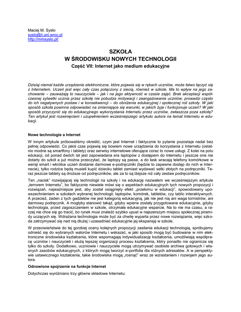 Maciej M. Sysło [email protected] http://mmsyslo.pl/ SZKOŁA W ŚRODOWISKU NOWYCH TECHNOLOGII Część VII: Internet jako medium edukacyjne Dzisiaj niemal każde urządzenie elektroniczne, które pojawia się w rękach uczniów, może łatwo łączyć się z Internetem. Uczeń jest więc cały czas połączony z siecią, również w szkole. Ma to wpływ na jego zachowanie – zauważają to nauczyciele – jak i na jego aktywność w czasie zajęć. Brak akceptacji współczesnej sylwetki ucznia przez szkołę nie pobudza motywacji i zaangażowania uczniów, prowadzi często do ich negatywnych postaw i w konsekwencji – do obniżenia edukacyjnej i społecznej roli szkoły. W jaki sposób szkoła powinna odpowiadać na zmieniające się warunki, w jakich żyje i funkcjonuje uczeń? W jaki sposób przyczynić się do edukacyjnego wykorzystania Internetu przez uczniów, zwłaszcza poza szkołą? Ten artykuł jest rozwinięciem i uzupełnieniem wcześniejszego artykułu autora na temat Internetu w edukacji. Nowe technologie a Internet W innym artykule próbowaliśmy określić, czym jest Internet i faktycznie to pytanie pozostaje nadal bez pełnej odpowiedzi. Co jakiś czas pojawią się bowiem nowe urządzenia do korzystania z Internetu (ostatnio modne są smartfony i tablety) oraz serwisy internetowe oferujące coraz to nowe usługi. Z kolei na polu edukacji, od ponad dwóch lat jest zapowiadana era laptopów z dostępem do Internetu i jeszcze one nie dotarły do szkół a już można przeczytać, że laptopy są passe, a do łask wracają telefony komórkowe w wersji smart i wkrótce uczeń dostanie darmowe e-podręczniki (będzie to zapewne dostęp do nich w Internecie), tylko rodzice będą musieli kupić dziecku tablet zamiast wydawać setki złotych na podręczniki. Teraz jeszcze tablety są droższe od podręczników, ale za to są lżejsze niż cały zestaw podręczników. Ten „nacisk” rozwijającej się technologii na szkoły i na edukację nazwałem we wcześniejszym artykule „terrorem Internetu”, bo faktycznie niewiele mówi się o aspektach edukacyjnych tych nowych propozycji i rozwiązań, najważniejsze jest, aby został osiągnięty efekt „przełomu w edukacji”, spowodowany upowszechnieniem w szkołach wybranej technologii: laptopów, komórek, tabletów, czy tablic interaktywnych. A przecież, żaden z tych gadżetów nie jest kategorią edukacyjną, jak nie jest nią ani waga tornistrów, ani darmowy podręcznik. A mogłyby stanowić takąż, gdyby wpierw zostały przygotowane edukacyjnie, gdyby technologia, przed zagoszczeniem w szkole, otrzymała edukacyjne wsparcie. Na to nie ma czasu, a raczej nie chce się go tracić, bo rynek musi znaleźć szybko upust w najszerszym miejscu społecznej piramidy uczących się. Wdrażana technologia może być za chwilę wyparta przez nowe rozwiązania, więc szkoda zatrzymywać się nad nią dłużej i uzasadniać edukacyjnie jej ekspansję w szkole. W przeciwieństwie do tej gorzkiej oceny kolejnych propozycji zasilania edukacji technologią, spróbujemy odnieść się do wybranych walorów Internetu i wskazać, w jaki sposób mogą być budowane w nim elektroniczne środowiska kształcenia, które wspomagają indywidualizację kształcenia, umożliwiają współpracę uczniów i nauczycieli i służą lepszej organizacji procesu kształcenia, który ponadto nie ogranicza się tylko do szkoły. Dodatkowo, uczniowie i nauczyciele mogą utrzymywać osobiste archiwa gotowych i własnych zasobów edukacyjnych, z których mogą tworzyć e-portfolia dla różnych adresatów. A w perspektywie ustawicznego kształcenia, takie środowiska mogą „rosnąć” wraz ze wzrastaniem i rozwojem jego autora. Odnowione spojrzenie na funkcje Internet Dotychczas wyróżniano trzy główne składowe Internetu: 2 1. Sieć, jako sieć powiązanych ze sobą komputerów – każde dwa komputery w sieci mogą komunikować się ze sobą i wymieniać informacje. 2. Zasoby, czyli różnego rodzaju pliki znajdujące się w serwerach i komputerach przyłączonych do sieci, takie jak różnego rodzaju dokumenty, programy edukacyjne, portale, serwisy. 3. Społeczności użytkowników Internetu skupionych w różnych grupach lub wokół przeróżnych inicjatyw i przedsięwzięć. Internet ciągle się rozwija. Obecne jego stadium rozwoju nosi nazwę Web 2.0 i jego cechą charakterystyczną jest aktywność użytkowników, którzy poza komunikowaniem się i korzystaniem z istniejących zasobów sieci, są również twórcami zasobów oraz usług sieciowych. A zatem w powyższym rozróżnieniu składowych, dwie ostatnie zlewają się w jedną. Ponadto, sieć w sensie fizycznym, jako połączenia, kojarzone często z różnego rodzaju kabelkami i wtyczkami, staje się coraz bardziej „niewidoczna”, istotny jest dostęp, a nie medium, które to umożliwia. Obecnie więc ten model sieci złożony z trzech składowych, w przypadku edukacji ewoluuje ku modelowi, w którym wyróżnia się dwie składowe: 1. Dostęp do sieci za pomocą jakichkolwiek mediów. Działania zmierzają do zapewnienia dostępu z każdego miejsca, w którym mogą się znaleźć uczniowie i nauczyciele. W szkole staje się możliwy dostęp bezprzewodowy. Poszerzają się obszary poza szkołą, w których dostęp jest darmowy. 2. Elektroniczne środowiska, będące połączeniem miejsca w sieci, w którym uczeń lub nauczyciel przechowuje swoje osobiste zasoby (utworzone przez siebie lub osobiście wybrane spośród innych) z miejscem przebywania i aktywności. Aktywność może mieć charakter edukacyjny, jak również zawodowy lub osobisty. Jedna osoba może mieć wiele takich miejsc. Z punktu widzenia edukacji szkolnej, uczeń i nauczyciel powinni mieć dostęp do Internetu z każdego miejsca w szkole i poza szkołą, w którym mogą chcieć skorzystać z technologii w swoich działaniach edukacyjnych. Dzięki temu kształcenie może przebiegać w każdym miejscu i w dowolnym cza