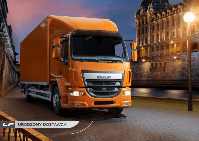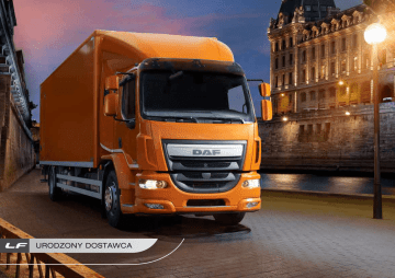 URODZONY DOSTAWCA IDEALNA CIĘŻARÓWKA DO DYSTRYBUCJI Seria DAF LF: opracowana do intensywnej eksploatacji w transporcie dystrybucyjnym, odznaczająca się atrakcyjną stylistyką elementów zewnętrznych i komfortowym wnętrzem. Oferując niezawodne i wydajne silniki PACCAR Euro 6 oraz wysoką nośność zapewniającą maksymalną wydajność, pojazd serii LF jest idealną ciężarówką do dystrybucji zarówno dla operatorów, jak i dla kierowców. LF 180 FA 4X2 LF 220 FA 4X2 ELEGANCJA Pojazd serii LF to doskonała wizytówka Twojej TRWAŁOŚĆ Co piękne, musi zachować swoją urodę. Serię LF firmy. To wytrzymała, ale przyjazna dla użytkownika, stylowa ciężarówka do opracowano z myślą o najbardziej intensywnym transporcie dystrybucyjnym. dystrybucji o tym samym wyglądzie, co pojazdy serii XF i CF. Uwagę klientów Wykonany przy użyciu najlepszych dostępnych materiałów i doskonale zwrócą z pewnością rzucająca się w oczy krata wlotu powietrza i atrakcyjny wykończony pojazd serii LF zachowa po latach intensywnego użytkowania chromowany panel z logo DAF, nad którym pozostawiono dużą ilość miejsca na perfekcyjny wygląd, sprawiając ogromną przyjemność kierowcy i przyczyniając nazwę firmy użytkownika pojazdu. Aerodynamiczne narożne owiewki pojazdu serii się do utrzymania wartości pojazdu. LF są dowodem na to, że atrakcyjny wygląd może iść w parze z praktycznością, ponieważ przepływ powietrza jest kierowany w taki sposób, aby klamki pozostawały czyste. WYTRZYMAŁOŚĆ Pojazd serii LF stanowi najlepsze ZWROTNOŚĆ Pojazdy serii LF są dostępne z trzema wersjami rozwiązanie w intensywnym ruchu drogowym, a niezależnie od tego jest zdolny kabin: kabiną Day Cab, kabiną Day Cab w wersji wydłużonej oraz kabiną Sleeper wytrzymać sporadyczne stłuczki. Zderzak z ocynkowanej stali minimalizuje Cab. Wszystkie charakteryzują się przestronnym wnętrzem przy kompaktowej podatność na uszkodzenia. Osłony reflektorów z opcjonalnymi światłami do jazdy budowie z zewnątrz. Dzięki dużemu promieniowi skrętu kół, wynoszącemu co dziennej są wykonane z nietłukącego się tworzywa Lexan. Oznacza to niższe najmniej 53 stopnie, seria LF odznacza się najmniejszym promieniem skrętu koszty eksploatacji i maksymalną dostępność pojazdu. w tym segmencie. Przekłada się to na optymalną zwrotność, która odróżnia dobrą ciężarówkę dystrybucyjną od najlepszej ciężarówki dystrybucyjnej. MAKSYMALNA ZWROTNOŚĆ 5 UŻYTECZNOŚĆ Intensywny transport dystrybucyjny oznacza dla kierowcy WIDOCZNOŚĆ Dobra widoczność jest niezwykle istotna dla kierowcy, szczególnie W przypadku serii LF opracowano pakiety całkowicie nowych poświęcanie ogromnej ilości czasu na wsiadanie w obszarach miejskich. Seria LF zapewnia idealną rozwiązań w zakresie aerodynamiki. Nowa konstrukcja i wysiadanie z ciężarówki. Dlatego w pojazdach serii widoczność zarówno przed pojazdem, jak i po jego jest wyposażona w osłony boczne doskonale LF pomyślano o maksymalnym ułatwieniu dostępu. bokach. Wraz z optymalnym ustawieniem lusterek połączone ze spojlerem dachowym, co skutkuje Drzwi otwierają się pod kątem 90 stopni, a podłoga, zapewnia to większe bezpieczeństwo i mniejsze oszczędnościami w zakresie zużycia paliwa, w zależności od wersji, znajduje się na wysokości ryzyko kolizji. Do poprawy bezpieczeństwa przyczynia sięgającymi nawet 4% w zależności od sposobu nieprzekraczającej 89, 98 lub 111 cm. Szerokie się oczywiście również oświetlenie. Opcjonalne światła wykorzystywania ciężarówki. Ciężarówka dystrybucyjna stopnie, starannie rozmieszczone klamki oraz LED do jazdy dziennej zapewniają doskonałą serii LF z zabudową Aero jest dostarczana fabrycznie doskonałe oświetlenie wejścia tylko podnoszą widoczność w ciągu dnia. Zderzak można wyposażyć z aerodynamiczną zabudową firmy PACCAR. Połączenie komfort zarówno kierowców, jak i pasażerów. w światła przeciwmgielne i reflektory doświetlające ze specjalnym zestawem owiewek i osłon kabiny zakręty. Świecą one w kierunku jazdy, zapewniając pozwala osiągnąć oszczędności paliwa sięgające łatwiejsze oraz bezpieczniejsze manewrowanie nawet 8%. Optymalne właściwości aerodynamiczne i skręcanie. Kolejną nową cechą są (opcjonalne) tylne zapewniają możliwie jak najniższe zużycie paliwa. światła LED, odznaczające się niezwykle długim okresem eksploatacji, zapewniającym maksymalną dostępność pojazdu. 6 AERODYNAMIKA LF 210 FA 4X2 AEROBODY NOWA KLASA LF 290 FA 4X2 DOSKONAŁE ŚRODOWISKO PRACY PRZYJAZNE WNĘTRZE Zrelaksowany kierowca to lepszy kierowca. To dlatego firma DAF poświęciła tak dużo uwagi wnętrzu pojazdów serii LF. Jest to doskonałe środowisko pracy o tak samo wysokim standardzie jakości, jak pojazdy serii XF i CF. Deska rozdzielcza jest atrakcyjna i wszechstronnie wyposażona, zapewniając jednocześnie maksymalną łatwość obsługi. Wszystkie elementy sterujące są rozmieszczone w łatwo dostępnych miejscach i w logiczny sposób uszeregowane w zależności od funkcji, ułatwiając kierowcom orientację w pojeździe serii LF. Ponadto bardzo duża wydajność układu ogrzewania i wentylacji oznacza możliwość szybkiego doprowadzenia temperatury we wnętrzu pojazdu do idealnego poziomu. Jest to doskonałe rozwiązanie w przypadku, gdy kierowcy poświęcają ogromną ilość czasu na wsiadanie i wysiadanie z ciężarówki. DOBRA ORGANIZACJA Pojazd serii LF jest wyposażony w wiele różnych schowków: przestronny, zamykany schowek nad komorą silnika, kieszenie boczne w panelach drzwiowych oraz dwa duże schowki nad przednią szybą. Ponad przednią szybą znajdują się dwa dodatkowe gniazda DIN obok tachografu. Kabina Day Cab w wersji wydłużonej oraz kabina Sleeper Cab są standardowo wyposażone w trzy dodatkowe, zamykane schowki za fotelami — jeden o pojemności 23 litrów oraz dwa o pojemności 39 l