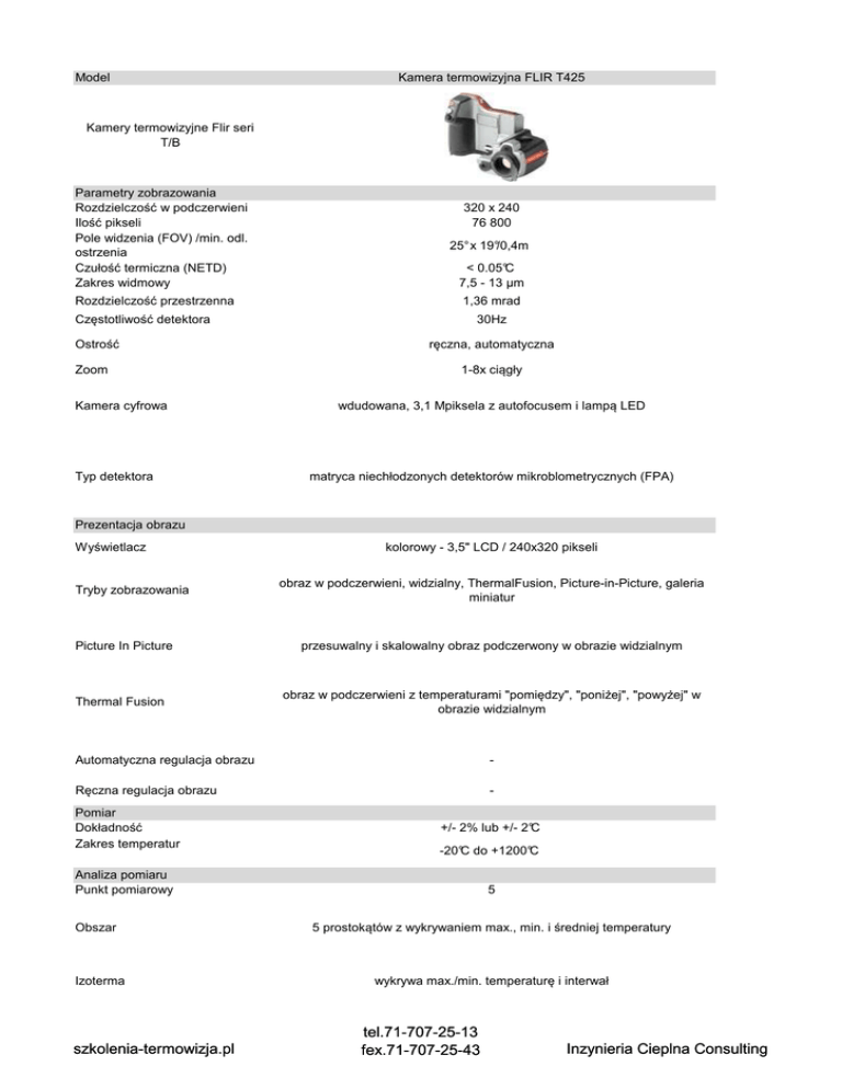 Model Kamera termowizyjna FLIR T425 Kamery termowizyjne Flir seri T/B Parametry zobrazowania Rozdzielczość w podczerwieni Ilość pikseli Pole widzenia (FOV) /min. odl. ostrzenia Czułość termiczna (NETD) Zakres widmowy Rozdzielczość przestrzenna Częstotliwość detektora Ostrość Zoom Kamera cyfrowa Typ detektora 320 x 240 76 800 25° x 19°/0,4m < 0.05°C 7,5 - 13 µm 1,36 mrad 30Hz ręczna, automatyczna 1-8x ciągły wdudowana, 3,1 Mpiksela z autofocusem i lampą LED matryca niechłodzonych detektorów mikroblometrycznych (FPA) Prezentacja obrazu Wyświetlacz Tryby zobrazowania Picture In Picture Thermal Fusion kolorowy - 3,5" LCD / 240x320 pikseli obraz w podczerwieni, widzialny, ThermalFusion, Picture-in-Picture, galeria miniatur przesuwalny i skalowalny obraz podczerwony w obrazie widzialnym obraz w podczerwieni z temperaturami "pomiędzy", "poniżej", "powyżej" w obrazie widzialnym Automatyczna regulacja obrazu - Ręczna regulacja obrazu - Pomiar Dokładność Zakres temperatur +/- 2% lub +/- 2°C -20°C do +1200°C Analiza pomiaru Punkt pomiarowy Obszar Izoterma szkolenia-termowizja.pl 5 5 prostokątów z wykrywaniem max., min. i średniej temperatury wykrywa max./min. temperaturę i interwał tel.71-707-25-13 fex.71-707-25-43 Inzynieria Cieplna Consulting Korekcja emisyjności Korekcja pomiarów Automatyczne wykrywanie chłodnych /gorących miejsc Temperatura różnicowa Alarm funkcji pomiarowych zmienna od 0,01 do 1,0 lub z listy materiałów temperatury odbitej, transmisji optyki i transmisji atmosfery automatyczne punkty pomiarowe w chłodnych lub gorących miejscach w obserwowanym obszarze delta temperatury między funkcjami pomiarowymi lub temperaturą odniesienia dźwiękowy/optyczny (powyżej/poniżej) z dwolną funkcją pomiarową Notatki dotyczące obrazu Dźwięk do 60 sekund; zapis razem z obrazem przez Bluetooth Znacznik obrazu Tekst 4 w obrazie w podczerwieni lub w obrazie widzialnym tekst z predefiniowanej listy lub z klawiatury ekranowej Szkic z ekranu dotykowego (zapisywany automatycznie z obrazem) MeterLink x Wskaźnik laserowy Laser Wskazywanie klasa 2, laser półprzewodnikowy AlGalnP położenie lasera jest automatycznie pokazywane na obrazie w podczerwieni Ustawienia Palety barw Ustawienia lokalne (setup) Klawisze programowalne Zapis obrazu Typ Format pliku Okresowy zapis obrazów Panorama żelaza, tęczy, cz-b, b-cz, tęczy HC, niebieska jednostki, język, format daty i czasu, automatyczne wyłączenie, jaskrawość ekranu karta pamięci SD standardowy JPEG - włącznie z danymi pomiarowymi co każde 10 sekund do 24 godzin Strumieniowa transmisja wideo x obrazy w podczerwieni i widzialne, jednoczesny zapis obu typów obrazów; obraz widzialny jest automatycznie łączony z odpowiednim obrazem termowizyjnym Nieradiometryczny zapis wideo MPEG-4 na karcie SD Tryb Tworzenie raportu Raport błyskawiczny szkolenia-termowizja.pl PDF w kamerze z obrazem w podczerwieni i widzialnym tel.71-707-25-13 fex.71-707-25-43 Inzynieria Cieplna Consulting Interfejsy USB-A USB mini-B Zespolony sygnał wizji Złącze zestawu słuchawkowego WLAN Zasilanie Typ akumulatora podłączenie zewnętrznego dysku USB (kopiowanie na pendrive) transfer danych do/z PC, strumieniowa transmisja MPEG-5 PAL lub NTSC x wymienny, litowo-jonowy Czas pracy Ładowanie Automatyka zasilania Praca z sieci Napięcie zasilacza Dane środowiskowe Zakres temp. pracy Wilgotność Udary Wibracje Obudowa Emisja EMC Dane fizyczne Rozmiary (dł. x szer. x wys.) Waga Gniazdo mintażowe statywu Inne Gwarancja 5 godziny w kamerze, z ładowarki sieciowej, w ładowrce dwukomorowej lub z ład. samochodowej 12V samoczynne wyłączenie (zgodne z ustawieniami użytkownika) zasilacz sieciowy 100-240V AC, 50/60 Hz 12V od -15°C do +50°C IEC 60068-2-30/24 h 95% wilgotność względna 25g (IEC 60068-2-29) 2g (IEC 60068-2-6) IP 54 (IEC 60529) 107 x 201 x 125 mm 0,88 kg wliczając akumulator 1/4" - 21 Gwarancja rozszerzona do 2 lat na kamerę i do 10 lat na detektor po rejestracji Informacje i kontat I.C.C. WOJCIECH DANIELEWICZ (Inżynieria Cieplna Consulting) tel. 71-707-25-13 fax:71-707-25-43 email: [email protected] www.szkolenia-termowizja.pl szkolenia-termowizja.pl tel.71-707-25-13 fex.71-707-25-43 Inzynieria Cieplna Consulting
