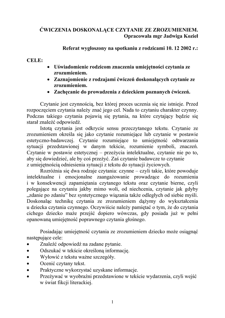 ĆWICZENIA DOSKONALĄCE CZYTANIE ZE ZROZUMIENIEM. Opracowała mgr Jadwiga Kozieł Referat wygłoszony na spotkaniu z rodzicami 10. 12 2002 r.: CELE: • Uświadomienie rodzicom znaczenia umiejętności czytania ze zrozumieniem. • Zaznajomienie z rodzajami ćwiczeń doskonalących czytanie ze zrozumieniem. • Zachęcanie do prowadzenia z dzieckiem poznanych ćwiczeń. Czytanie jest czynnością, bez której proces uczenia się nie istnieje. Przed rozpoczęciem czytania należy znać jego cel. Nada to czytaniu charakter czynny. Podczas takiego czytania pojawią się pytania, na które czytający będzie się starał znaleźć odpowiedź. Istotą czytania jest odkrycie sensu przeczytanego tekstu. Czytanie ze zrozumieniem określa się jako czytanie rozumiejące lub czytanie w postawie estetyczno-badawczej. Czytanie rozumiejące to umiejętność odtwarzania sytuacji przedstawionej w danym tekście, rozumienie symboli, znaczeń. Czytanie w postawie estetycznej – przeżycia intelektualne, czytanie nie po to, aby się dowiedzieć, ale by coś przeżyć. Zaś czytanie badawcze to czytanie z umiejętnością odniesienia sytuacji z tekstu do sytuacji życiowych. Rozróżnia się dwa rodzaje czytania: czynne – czyli takie, które powoduje intelektualne i emocjonalne zaangażowanie prowadzące do rozumienia i w konsekwencji zapamiętania czytanego tekstu oraz czytanie bierne, czyli polegające na czytaniu jakby mimo woli, od niechcenia, czytanie jak gdyby „zdanie po zdaniu” bez syntetycznego wiązania także odległych od siebie myśli. Doskonaląc technikę czytania ze zrozumieniem dążymy do wykształcenia u dziecka czytania czynnego. Oczywiście należy pamiętać o tym, że do czytania cichego dziecko maże przejść dopiero wówczas, gdy posiada już w pełni opanowaną umiejętność poprawnego czytania głośnego. Posiadając umiejętność czytania ze zrozumieniem dziecko może osiągnąć następujące cele: • Znaleźć odpowiedź na zadane pytanie. • Odszukać w tekście określoną informację. • Wyłowić z tekstu ważne szczegóły. • Ocenić czytany tekst. • Praktyczne wykorzystać uzyskane informacje. • Przeżywać w wyobraźni przedstawione w tekście wydarzenia, czyli wejść w świat fikcji literackiej. 1 Aby sprawdzić, czy nasze dziecko czyta ze zrozumieniem, możemy polecić mu aby: • Opowiedziało przeczytany tekst własnymi słowami; • Wyszukało konkretne, zawarte w tekście informacje. • Sformułowało własne zdanie na temat domyślnie zawartych w tekście twierdzeń. • Przewidziało zakończenie czytanej historii. • Wyszukało w tekście np. opis, rozmowę, konkretne wydarzenie itp. Najważniejszym celem czytania jest zrozumienie tekstu i wydobycie z niego użytecznych informacji. Zrozumienie to zdolność do wyobrażenia sobie sytuacji opisanej w tekście, a następuje ono poprzez: • Analizę tekstu, czyli wyodrębnienie spraw najistotniejszych; • Stawianie pytań; • Ogarnianie treści, czyli czytanie analizujące; • Aktywny stosunek do czytanego tekstu, tzn. wyrobienie sobie opinii o nim; • Uświadomienie sobie głównych myśli autora i zależności pomiędzy nimi występujących (czytanie syntetyzujące). Istnieje wiele rodzajów ćwiczeń, ułatwiających dziecku nabycie umiejętności czytania ze zrozumieniem. Oto przykłady takich ćwiczeń: 1. Przed przystąpieniem przez dziecko do czytania tekstu, dajemy mu polecenie – np. − Odszukaj drugie zdanie, przeczytaj je wzrokiem, potem głośno odczytaj (konkretny – 2 lub wskazany najkrótszy itp.) wyraz. − Wyszukaj w tekście szóste zdanie, a w nim wyraz trzeci, zdanie trzecie – wyraz siódmy itp. − Odszukaj w tekście wyrazy ,które są do siebie podobne (np. ten sam wyraz w różnej formie), ale nie tak samo zbudowane. − Wyszukaj w tekście same imiona i odczytaj je. − Znajdź w tekście pytanie, a następnie odpowiedz na nie. − Opisz np. występującą postać, dom, zwierzę, itd. Są to bardzo ważne ćwiczenia, gdyż polecenie zmusza dziecko do odszukania w tekście odpowiednich zdań, przeczytania ich po cichu, uświadomienia sobie, czy treść ich jest zgodna z poleceniem i udzielenie odpowiedzi. 2 2. Test słów łańcuchowych. kotpomidory okładkasito kaszasłońce sitoszynka pożarzawody piątkaperon wędrówkażuk balonikwzór syropgarnek wiatrjabłoń prezentpróg piłkaczapka Dziecko dostaje kartkę papieru, na której w dwóch kolumnach wydrukowane są jedenastoliterowe „obiekty” – słowa łańcuchowe. Każde z nich jest złożone z dwóch rzeczowników w formie słownikowej (bez spacji). Materiał leksykalny wykorzystany w ćwiczeniu został dobrany starannie, tak, aby wykluczyć wyrazy obce dzieciom pod względem znaczenia. Zadaniem dziecka jest poprawne rozdzielenie słów wchodzących w skład słowa łańcuchowego w jak najkrótszym czasie i bezbłędnie. Wykonując to ćwiczenie dziecko zmuszone jest do poprawnego odczytywania pojedynczych liter i złożenia ich w dwa sensowne wyrazy. Należy zadbać o to, aby niemożliwe były podziały wieloznaczne w wyrazie łańcuchowym. 3. Test zdań łańcuchowych. rano powtórzę wiersz dzisiaj wychodzimy wcześniej siostrze Jurka zabrakło drobnych zawsze zwycięża lepszy dzwonek oznajmił koniec ostatniej lekcji przechodząc przez jezdnię trzeba uważać czytanie sprawia mi przyjemność jutro wyjeżdżamy na wakacje jest już późna nic nie zrobi się samo jest nam bardzo wesoło Test ten jest zbudowany z pewnej liczby wypowiedzeń, nie tworzą one jednak opowiadania. Zdania łańcuchowe wybrane do danego tekstu pochodzą z kilkudziesięciu krótkich opowiadań powstałych na podstawie słownictwa dzieci klas I – III. Każde wypowiedzenie tworzy określoną logiczną całość, ma swój sens i znaczenie. W teście została pominięta wielka litera na początku zdania ora kropka-znak interpunkcyjny kończący wypowiedzenie. Nazwy własne są zapisane wielką literą, zgodnie z zasadami