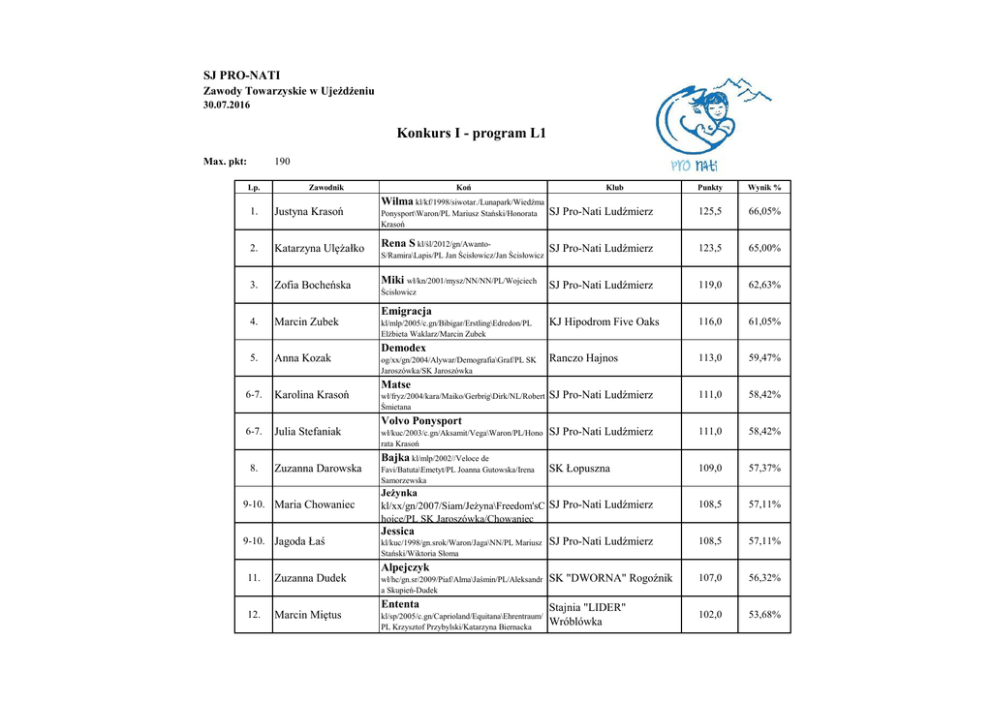 SJ PRO-NATI Zawody Towarzyskie w Ujeżdżeniu 30.07.2016 Konkurs I - program L1 Max. pkt: 190 Lp. Koń Zawodnik 1. Justyna Krasoń 2. Wilma kl/kf/1998/siwotar./Lunapark/Wiedźma Klub Punkty Wynik % Ponysport\Waron/PL Mariusz Stański/Honorata Krasoń SJ Pro-Nati Ludźmierz 125,5 66,05% Katarzyna Ulężałko Rena S kl/śl/2012/gn/Awanto- SJ Pro-Nati Ludźmierz 123,5 65,00% 3. Zofia Bocheńska Miki wł/kn/2001/mysz/NN/NN/PL/Wojciech SJ Pro-Nati Ludźmierz 119,0 62,63% 4. Marcin Zubek KJ Hipodrom Five Oaks 116,0 61,05% 5. Anna Kozak Ranczo Hajnos 113,0 59,47% SJ Pro-Nati Ludźmierz 111,0 58,42% SJ Pro-Nati Ludźmierz 111,0 58,42% SK Łopuszna 109,0 57,37% 108,5 57,11% SJ Pro-Nati Ludźmierz 108,5 57,11% wł/hc/gn.sr/2009/Piaf/Alma\Jaśmin/PL/Aleksandr a Skupień-Dudek SK "DWORNA" Rogoźnik 107,0 56,32% Ententa Stajnia "LIDER" Wróblówka 102,0 53,68% S/Ramira\Lapis/PL Jan Ścisłowicz/Jan Ścisłowicz Ścisłowicz Emigracja kl/mlp/2005/c.gn/Bibigar/Erstling\Edredon/PL Elżbieta Waklarz/Marcin Zubek Demodex 6-7. Karolina Krasoń 6-7. Julia Stefaniak og/xx/gn/2004/Alywar/Demografia\Graf/PL SK Jaroszówka/SK Jaroszówka Matse wł/fryz/2004/kara/Maiko/Gerbrig\Dirk/NL/Robert Śmietana Volvo Ponysport wł/kuc/2003/c.gn/Aksamit/Vega\Waron/PL/Hono rata Krasoń Bajka kl/mlp/2002//Veloce de 8. Zuzanna Darowska 9-10. Maria Chowaniec 9-10. Jagoda Łaś Favi/Batuta\Emetyt/PL Joanna Gutowska/Irena Samorzewska Jeżynka kl/xx/gn/2007/Siam/Jeżyna\Freedom'sC SJ Pro-Nati Ludźmierz hoice/PL SK Jaroszówka/Chowaniec Jessica kl/kuc/1998/gn.srok/Waron/Jaga\NN/PL Mariusz Stański/Wiktoria Słoma Alpejczyk 11. Zuzanna Dudek 12. Marcin Miętus kl/sp/2005/c.gn/Caprioland/Equitana\Ehrentraum/ PL Krzysztof Przybylski/Katarzyna Biernacka Lp. Koń Zawodnik Atrakcja S 13. Julianna Dulik 14-15. Paulina Gumny 14-15. Zuzanna Górska 16. Klub Punkty Wynik % kl/śl/2008/gn/Subiekt/Arabella\Butanol/PL Jan Ścisłowicz/Jan Ścisłowicz SJ Pro-Nati Ludźmierz 99,0 52,11% Miki wł/kn/2001/mysz/NN/NN/PL/Wojciech SJ Pro-Nati Ludźmierz 98,5 51,84% Ranczo Hajnos 98,5 51,84% Stajnia Neptuno 89,0 46,84% Ścisłowicz Tradycja kl/mlp/kaszt/2009/Chef Supreme/Tumka\Askar/PL Ignacy Maroszek/ Iwona Mykietyn-Górska Sylwia Krzystoń Perla og/PSL/2008/izab/NN/NN/Esp/Ilona Ilona Majewska Obrador XIV og/PRE/2012/gn/Genial Julia Blachut Perla og/PSL/2008/izab/NN/NN/Esp/Ilona Majewska XII/Elegida LXXIII\Neon/Ilona Majewska Majewska Stajnia Neptuno rezygnacja Stajnia Neptuno rezygnacja Przejazdy szkoleniowe Bajka kl/mlp/2002//Veloce de Zuzanna Darowska Zuzanna Górska Favi/Batuta\Emetyt/PL Joanna Gutowska/Irena Samorzewska SK Łopuszna 105,5 55,53% Ranczo Hajnos 105,0 55,26% SK "DWORNA" Rogoźnik 103,0 54,21% Tradycja kl/mlp/kaszt/2009/Chef Supreme/Tumka\Askar/PL Ignacy Maroszek/ Iwona Mykietyn-Górska Alpejczyk Zuzanna Dudek wł/hc/gn.sr/2009/Piaf/Alma\Jaśmin/PL/Aleksandr a Skupień-Dudek Startowało par: 21 Sędzia Główny Ukończyło par: 19 Barbara Zygmunt SJ PRO-NATI Zawody Towarzyskie w Ujeżdżeniu 30.07.2016 Konkurs II - program P1 Max. pkt: 250 Lp. Koń Punkty Wynik % LKS Stragona Strzegom 160,5 64,20% LKS Stragona Strzegom 158,0 63,20% SJ Pro-Nati Ludźmierz 152,5 61,00% KJ Hipodrom Five Oaks 150,0 60,00% wł/kł.ros/2003/c.gn/Isbranic/Ugra\Gral/UK/Anna Shakhoval SJ Pro-Nati Ludźmierz 145,5 58,20% Ententa Stajnia "LIDER" Wróblówka 143,5 57,40% SJ Pro-Nati Ludźmierz 143,5 57,40% Jessica kl/kuc/1998/gn.srok/Waron/Jaga\NN/PL SJ Pro-Nati Ludźmierz 141,0 56,40% 123,0 49,20% Zawodnik 1. Wioleta Hajnos 2. Wioleta Hajnos 3. Karolina Krasoń 4. Julia Imioło 5. Anna Shakhoval 6-7. Marcin Miętus 6-7. Renata Komperda 8. Karolina Krasoń 9. Katarzyna Stefaniak Klub Dobrawa kl/sp/c.gn/2004/Corde/Dworna\Akwent/PL Jan Bobek/Jan Bobek Donna Dorada kl/mlp/c.gn/2010/Barnaba/Doga\Dresk/PL Stanisław Chomiczewski/Wioleta Hajnos Draco wł/trak/2008/c.gn/Karatas/Dragonia\Texas/PL Tomasz Gąsowski/Tomasz Gąsowski Camaro wł/mecklemb/sk.gn/2001/Cabrol Amicor/Lacara\Ladinor/DE/Ewa Imiło Uspiszny kl/sp/2005/c.gn/Caprioland/Equitana\Ehrentraum/ PL Krzysztof Przybylski/Katarzyna Biernacka Fraktal wł/SP/2004/Lumpi/Funkcja\Galeon/PL/Marek Kasprzycki Mariusz Stański/Wiktoria Słoma Volvo Ponysport wł/kuc/2003/c.gn/Aksamit/Vega\Waron/PL/Honor ata Krasoń SJ Pro-Nati Ludźmierz Demodex Anna Kozak og/xx/gn/2004/Alywar/Demografia\Graf/PL SK Jaroszówka/SK Jaroszówka Ranczo Hajnos eliminacja Przejazdy szkoleniowe Donna Dorada Wioleta Hajnos Startowało par: 11 Ukończyło par: 10 kl/mlp/c.gn/2010/Barnaba/Doga\Dresk/PL Stanisław Chomiczewski/Wioleta Hajnos Sędzia Główny Barbara Zygmunt LKS Stragona Strzegom 158,5 63,40% SJ PRO-NATI Zawody Towarzyskie w Ujeżdżeniu 30.07.2016 Konkurs III - program WKKW CI1* test A 2015 230 Max. pkt: Lp. Koń Zawodnik Klub Punkty Wynik % 153,0 66,52% Dobrawa Wioleta Hajnos kl/sp/c.gn/2004/Corde/Dworna\Akwent/P L Jan Bobek/Jan Bobek Startowało par: 1 Sędzia Główny Ukończyło par: 1 1. Barbara Zygmunt LKS Stragona Strzegom