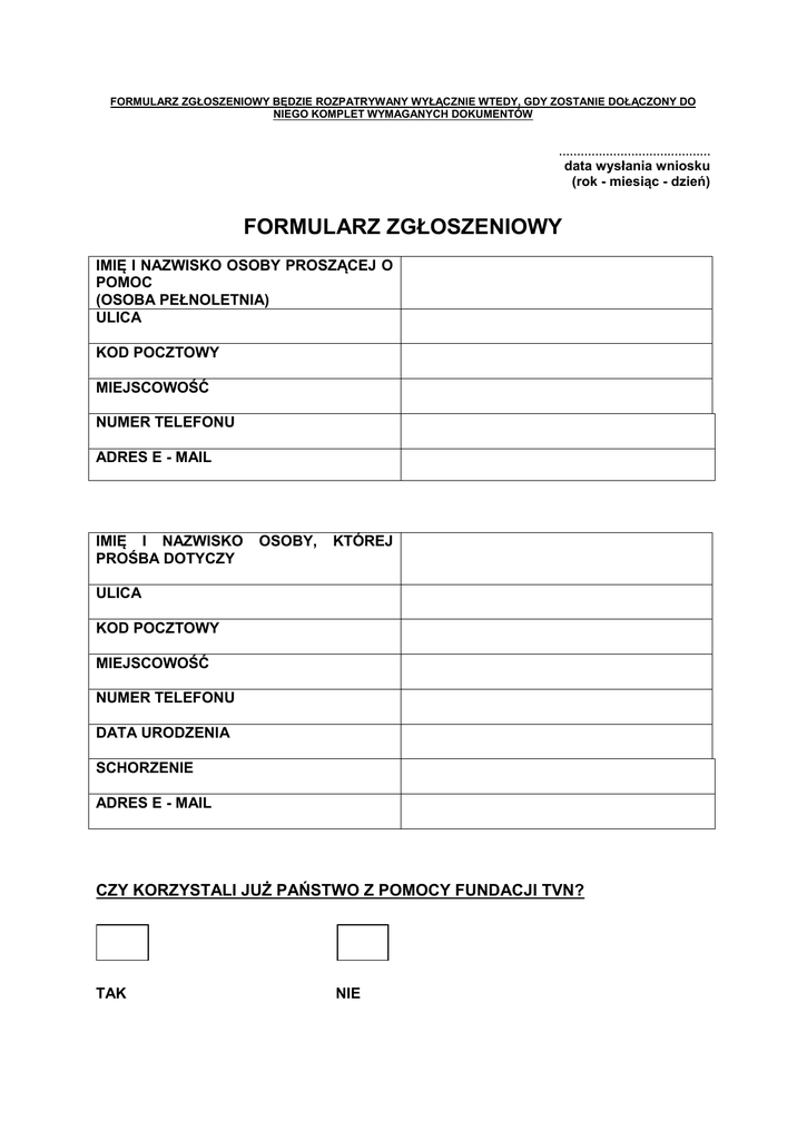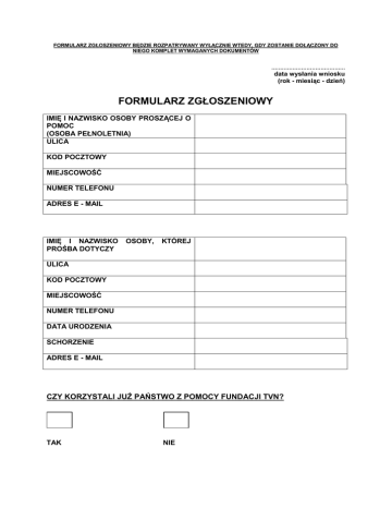 FORMULARZ ZGŁOSZENIOWY BĘDZIE ROZPATRYWANY WYŁĄCZNIE WTEDY, GDY ZOSTANIE DOŁĄCZONY DO NIEGO KOMPLET WYMAGANYCH DOKUMENTÓW …………………………………… data wysłania wniosku (rok - miesiąc - dzień) FORMULARZ ZGŁOSZENIOWY IMIĘ I NAZWISKO OSOBY PROSZĄCEJ O POMOC (OSOBA PEŁNOLETNIA) ULICA KOD POCZTOWY MIEJSCOWOŚĆ NUMER TELEFONU ADRES E - MAIL IMIĘ I NAZWISKO PROŚBA DOTYCZY OSOBY, KTÓREJ ULICA KOD POCZTOWY MIEJSCOWOŚĆ NUMER TELEFONU DATA URODZENIA SCHORZENIE ADRES E - MAIL CZY KORZYSTALI JUŻ PAŃSTWO Z POMOCY FUNDACJI TVN? TAK NIE PROSIMY O ZAZNACZENIE JAKIEJ POMOCY OCZEKUJĄ PAŃSTWO OD FUNDACJI DOFINANSOWANIE DO REHABILITACJI DOFINANSOWANIE DO OPERACJI DOFINANSOWANIE DO ZAKUPU LEKÓW DOFINANSOWANIE DO ZAKUPU SPRZĘTU LIST DOKŁADNIE OKREŚLAJĄCY CZEGO DOTYCZY PROŚBA ORAZ OPIS SYTUACJI RODZINY (ZDROWOTNEJ I MATERIALNO – BYTOWEJ) Formularz zgody Niniejszy kwestionariusz jest wypełniany w celu wyrażenia zgody na zbieranie i przetwarzanie Państwa danych osobowych w tworzonym zbiorze danych „Fundacji TVN nie jesteś sam” (w dalszym dokumencie: Fundacja) z siedzibą w Warszawie, ul. Wiertnicza 166 w celu niezbędnym do wykonania statutowych zadań Fundacji. Imię i nazwisko osoby proszącej o pomoc (osoba pełnoletnia) ………………………………………………………… Adres ………………………………………………………… ………………………………………………………... Fundacja TVN nie jesteś sam ul. Wiertnicza 166 02-952 Warszawa Informujemy, iż: 1) Administratorem Państwa danych osobowych jest „Fundacja TVN nie jesteś sam” z siedzibą w Warszawie, ul. Wiertnicza 166, 02-952 Warszawa. Kontakt z administratorem możliwy jest pod powyższym adresem pocztowym lub pod adresem e-mail: [email protected] 2) Państwa dane osobowe są zbierane i przetwarzane przez Fundację w celu niezbędnym do wykonania statutowych zadań Fundacji, w tym: - niesienie pomocy osobom dotkniętym poważnymi, trudnouleczalnymi schorzeniami, - niesienie pomocy osobom oczekującym na trudne, bądź drogie zabiegi medyczne, - niesienie pomocy osobom biednym i instytucjom o ważnym znaczeniu społecznym, będącym w trudnej sytuacji materialnej (statut określający wszystkie cele i zasady działania fundacji dostępny jest na stronie www.fundacja.tvn.pl). W każdej chwili mają Państwo prawo dostępu do treści swoich danych osobowych oraz prawo do ich poprawienia. 3) Gromadzone są jedynie dane osobowe podane przez Państwa dobrowolnie. Fundacja uprzejmie informuje, iż nie mają Państwo obowiązku podania swoich danych osobowych, jednakże odmowa ich podania może uniemożliwić wykonanie wobec Państwa statutowych obowiązków Fundacji. 4) Zgromadzone dane podlegają starannej ochronie, zgodnie z obowiązującymi przepisami. Zgromadzone dane osobowe Fundacja może udostępnić wyłącznie spółkom należącym do grupy kapitałowej TVN w celu niezbędnym do wykonania statutowych zadań Fundacji poprzez promocję Fundacji w ramach zbiórki publicznej środków finansowych. Administrator danych osobowych dokłada wszelkich starań, aby przechowywanym danym zapewnić właściwy stopień bezpieczeństwa. Oświadczenie Oświadczam, iż zostałem(-am) poinformowany(-a) o celach pozyskania moich danych osobowych i wyrażam dobrowolnie zgodę na zbieranie i przetwarzanie moich danych osobowych na zasadach określonych w Ustawie o ochronie danych osobowych z dnia 29.08.1997r. (Dz. U. z 2002 r. Nr 101, poz. 926 ze zm.) przez „Fundację TVN nie jesteś sam” z siedzibą w Warszawie, ul. Wiertnicza 166, 02-952 Warszawa, w celu niezbędnym do wykonania statutowych zadań przedmiotowej Fundacji. ......................... /data, czytelny podpis/ * Podpisanie i odesłanie kwestionariusza nie jest jednoznaczne z przydzieleniem pomocy finansowej ze strony Fundacji TVN. Dopełnienie niniejszej formalności umożliwia jedynie dalsze rozpatrywanie Państwa próśb obecnie i w przyszłości. ……………………………. Imię i Nazwisko .......................................... Ulica, numer domu …………………………… Kod pocztowy, miejscowość Fundacja TVN „nie jesteś sam” Ul. Wiertnicza 166 02 – 952 Warszawa Oświadczenie Ja,……………………………………………………………………………………………………… zamieszkały/a…………………………………………………………………………………………. urodzony/a …………………………………, starając się o uzyskanie pomocy w Fundacji TVN „nie jesteś sam”, wyrażam zgodę na weryfikację mojej sytuacji rodzinnej, finansowej, zdrowotnej w MOPS/ GOPS/ MOPR lub w innej instytucji mogącej potwierdzić informacje podane przeze mnie we wniosku. Do oświadczenia załączam dane placówki MOPS/GOPS/MOPR/inne*: ……………………………………………. ……………………………………………. ……………………………………………. ……………………………………………. …………………………………………... (podpis podopiecznego lub opiekuna prawnego) *osoby, które nie korzystają z pomocy ośrodka, również zobowiązane są do uzupełnienia danych placówki, znajdującej się w ich rejonie zamieszkania DANE ADRESOWE: (IMIĘ, NAZWISKO / NAZWA; ADRES: ULICA, KOD POCZTOWY, MIEJSCOWOŚĆ; NUMER TELEFONU) LEKARZ SPECJALISTA LEKARZ SPECJALISTA LEKARZ SPECJALISTA SKLEP MEDYCZNY / REHABILITACYJNY APTEKA OŚRODEK POMOCY SPOŁECZNEJ DOKUMENTY POTRZEBNE DO ROZPATRZENIA PROŚBY 1. Prośba o dofinansowanie zakupu leków - zaświadczenie lekarskie potwierdzające chorobę i koszty leczenia (faktura z apteki może być potwierdzeniem kosztów leczenia tylko i wyłącznie po potwierdzeniu przez lekarza podpisem i pieczątką) - kserokopie kart informacyjnych ze szpitali (z ostatniego okresu) - oświadczenie apteki - kserokopia orzeczenia o ni