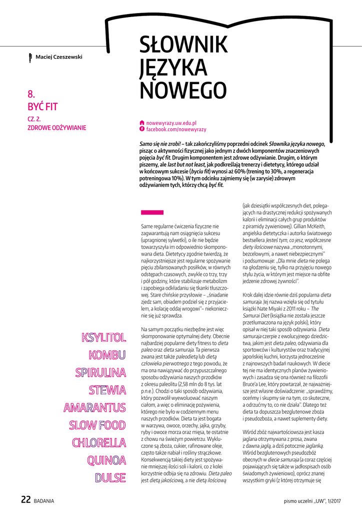 íí Maciej Czeszewski 8. BYĆ FIT CZ. 2. ZDROWE ODŻYWIANIE SŁOWNIK JĘZYKA NOWEGO Á Á nowewyrazy.uw.edu.pl facebook.com/nowewyrazy Samo się nie zrobi! – tak zakończyliśmy poprzedni odcinek Słownika języka nowego, pisząc o aktywności fizycznej jako jednym z dwóch komponentów znaczeniowych pojęcia być fit. Drugim komponentem jest zdrowe odżywianie. Drugim, o którym piszemy, ale last but not least, jak podkreślają trenerzy i dietetycy, którego udział w końcowym sukcesie (byciu fit) wynosi aż 60% (trening to 30%, a regeneracja potreningowa 10%). W tym odcinku zajmiemy się (w zarysie) zdrowym odżywianiem tych, którzy chcą być fit. Same regularne ćwiczenia fizyczne nie zagwarantują nam osiągnięcia sukcesu (upragnionej sylwetki), o ile nie będzie towarzyszyła im odpowiednio skomponowana dieta. Dietetycy zgodnie twierdzą, że najkorzystniejsze jest regularne spożywanie pięciu zbilansowanych posiłków, w równych odstępach czasowych, zwykle co trzy, trzy i pół godziny, które stabilizuje metabolizm i zapobiega odkładaniu się tkanki tłuszczowej. Stare chińskie przysłowie – „śniadanie zjedz sam, obiadem podziel się z przyjacielem, a kolację oddaj wrogowi”– niekoniecznie się już sprawdza. Na samym początku niezbędne jest więc skomponowanie optymalnej diety. Obecnie najbardziej popularne diety fitness to dieta paleo oraz dieta samuraja. Ta pierwsza zwana jest także paleodietą lub dietą człowieka pierwotnego z tego powodu, że ma ona nawiązywać do przypuszczalnego sposobu odżywiania naszych przodków z okresu paleolitu (2,58 mln do 8 tys. lat p.n.e.). Chodzi o taki sposób odżywiania, który pozwolił wyewoluować naszym ciałom, a więc o eliminację pożywienia, którego nie było w codziennym menu naszych przodków. Dieta ta jest bogata w warzywa, owoce, orzechy, jajka, grzyby, ryby i owoce morza oraz mięsa, te ostatnie z chowu na świeżym powietrzu. Wykluczone są zboża, cukier, rafinowane oleje, często także nabiał i rośliny strączkowe. Konsekwencją takiej diety jest spożywanie mniejszej ilości soli i kalorii, co z kolei korzystnie odbija się na zdrowiu. Dieta paleo jest dietą jakościową, a nie dietą ilościową 22 BADANIA (jak dziesiątki współczesnych diet, polegających na drastycznej redukcji spożywanych kalorii i eliminacji całych grup produktów z piramidy żywieniowej). Gillian McKeith, angielska dietetyczka i autorka światowego bestsellera Jesteś tym, co jesz, współczesne diety ilościowe nazywa „monotonnymi, bezcelowymi, a nawet niebezpiecznymi” i podsumowuje: „Dla mnie dieta nie polega na głodzeniu się, tylko na przyjęciu nowego stylu życia, w którym jest miejsce na obfite jedzenie zdrowej żywności”. Krok dalej idzie równie dziś popularna dieta samuraja. Jej nazwa wzięła się od tytułu książki Nate Miyaki z 2011 roku – The Samurai Diet (książka nie została jeszcze przetłumaczona na język polski), który opisał w niej taki sposób odżywiania. Dieta samuraja czerpie z ewolucyjnego dziedzictwa, jakim jest dieta paleo, odżywiania dla sportowców i kulturystów oraz tradycyjnej japońskiej kuchni, korzysta jednocześnie z najnowszych badań naukowych. W diecie tej nie ma identycznych planów żywieniowych i zasadza się ona również na filozofii Bruce’a Lee, który powtarzał, że najważniejsze jest własne doświadczenie: „sprawdźmy, oceńmy i skupmy sie na tym, co skuteczne, a odrzućmy to, co nie działa”. Dlatego też dieta ta dopuszcza bezglutenowe zboża i pseudozboża, a nawet suplementy diety. Wśród zbóż najwartościowsza jest kasza jaglana otrzymywana z prosa, zwana z dawna jagłą, a dziś potocznie jaglanką. Wśród bezglutenowych pseudozbóż obecnych w diecie samuraja (a coraz częściej pojawiających się także w jadłospisach osób świadomych żywieniowo), oprócz znanej wszystkim gryki (z której otrzymuje się pismo uczelni „UW”, 1/2017 Obserwatorium Językowe UW to platforma współpracy internautów (użytkowników języka) z ekspertami (językoznawcami z UW) nad opisem najnowszej warstwy polszczyzny. Każdy może zgłosić propozycję neologizmu, która po weryfikacji i redakcji leksykograficznej jest publikowana w formie artykułu hasłowego na stronie internetowej projektu. kaszę gryczaną), znajdują się: quinoa, chia i amarantus. Quinoa znana także jako komosa ryżowa lub ryż peruwiański, uprawiana była już w państwie Inków (stąd zwie się ją często złotem Inków). Jest ona bogatym źródłem wysokowartościowego kompletnego białka, czyli zawierającego wszystkie niezbędne aminokwasy, których nie syntetyzuje organizm ludzki i które muszą być dostarczane z pożywieniem (tzw. aminokwasy egzogenne). Z kolei chia pochodząca z Meksyku i Gwatemalii uprawiana była przez Azteków już w czasach prekolumbijskich. Chia, zwana również szałwią hiszpańską, jest wyjątkowa ze względu na bardzo wysokie stężenie kwasów tłuszczowych omega-3 w oleju uzyskiwanym z jej nasion. Ostatni z triady najwartościowszych pseudozbóż, amarantus, zwany też szarłatem, uprawiany już przez Majów i Azteków, podobnie jak quinoa jest wyjątkowo cenny ze względu na wysoką zawartość białka, w skład którego wchodzą aminokwasy egzogenne. W diecie samuraja znajduje się również ryż basmati o charakterystycznym śnieżnobiałym kolorze i wydłużonym kształcie. Uprawia się go u podnóży Himalajów indyjsko-pakistańskich, a uważany jest za najszlachetniejszą odmianę ryżu (gleba, na której rośnie, zasilana jest wodami spływającymi z himalajskich lodowców). Jego cechą charakterystyczną jest wyrazisty orzechowy aromat (basmati oznacza dosłownie ‘pachnący’). Nie tylko w diecie samuraja spożywa się chude mięso, zwłaszcza drób. Coraz większą popularność w różnych systemach żywienia zdobywa kurczak tzw. zagrodowy. Kurczaki zagrodowe chowane są znacznie dłużej niż zwykłe kurczaki, w go