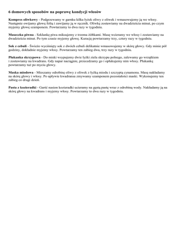 6 domowych sposobów na poprawę kondycji włosów Kompres oliwkowy - Podgrzewamy w garnku kilka łyżek oliwy z oliwek i wmasowujemy ją we włosy. Następnie owijamy głowę folią i zawijamy ją w ręcznik. Oliwkę zostawiamy na dwadzieścia minut, po czym myjemy głowę szamponem. Powtarzamy to dwa razy w tygodniu. Maseczka piwna - Szklankę piwa miksujemy z trzema żółtkami. Masę wcieramy we włosy i zostawiamy na dwadzieścia minut. Po tym czasie myjemy głowę. Kurację powtarzamy trzy, cztery razy w tygodniu. Sok z cebuli - Świeżo wyciśnięty sok z dwóch cebuli delikatnie wmasowujemy w skórę głowy. Gdy minie pół godziny, dokładnie myjemy włosy. Powtarzamy ten zabieg dwa, trzy razy w tygodniu. Płukanka skrzypowa - Do miski wsypujemy dwie łyżki ziela skrzypu polnego, zalewamy go wrzątkiem i zostawiamy na kwadrans. Gdy napar naciągnie, przecedzamy go i opłukujemy nim włosy. Płukankę powtarzamy tuż po myciu głowy. Maska miodowa - Mieszamy odrobinę oliwy z oliwek z łyżką miodu i szczyptą cynamonu. Masę nakładamy na skórę głowy i włosy. Po upływie kwadransa zmywamy szamponem pozostałości maski. Wykonujemy ten zabieg co drugi dzień. Pasta z kozieradki - Garść nasion kozieradki ucieramy na gęstą pastę wraz z odrobiną wody. Nakładamy ją na skórę głowy na kwadrans i myjemy włosy. Powtarzamy to dwa razy w tygodniu.